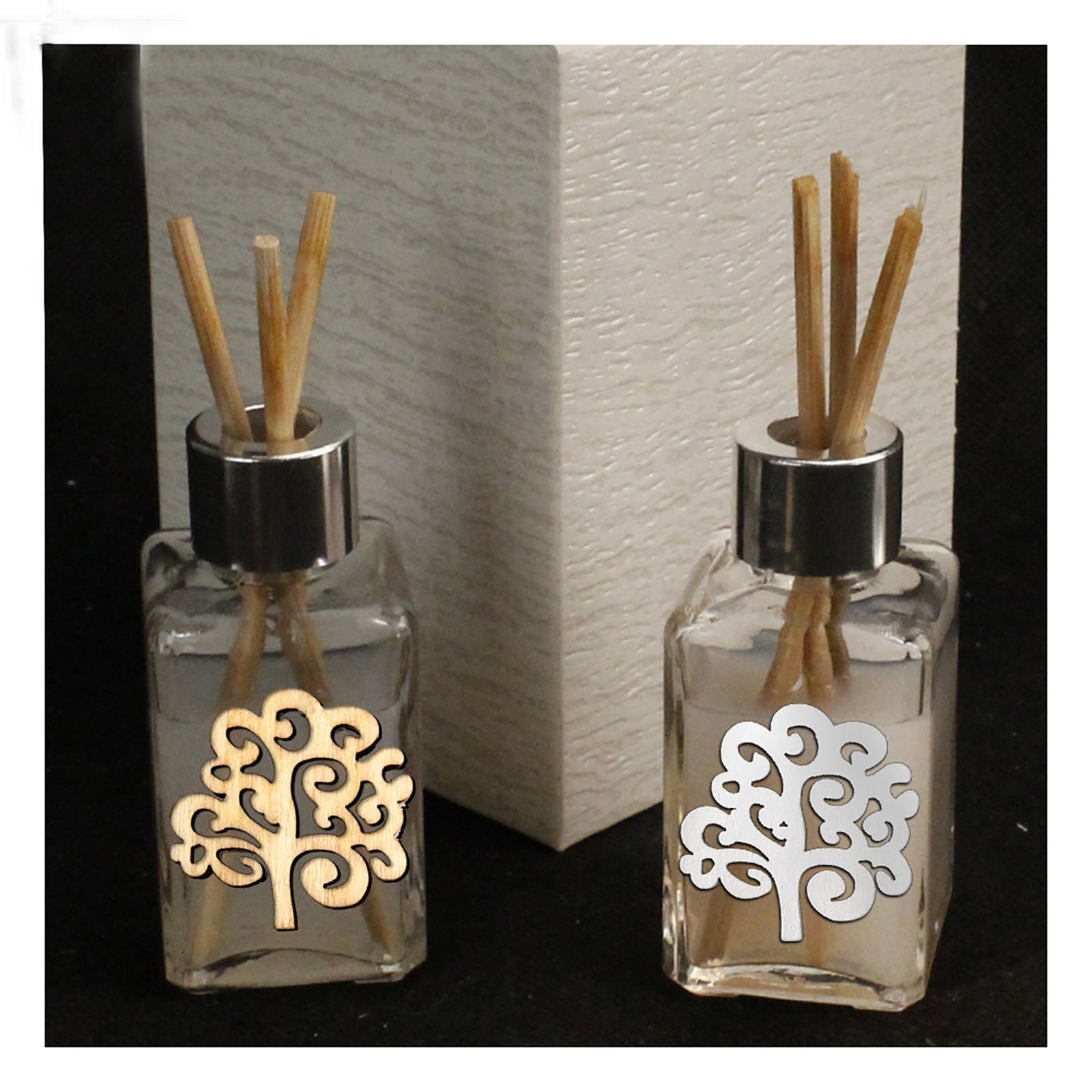 Come questi diffusori per ambienti in vetro con applicazione centrale in legno a forma di albero della vita, simbolo di buon auspicio. L'albero è disponibile in due versioni assortite, in tonalità bianca e naturale.