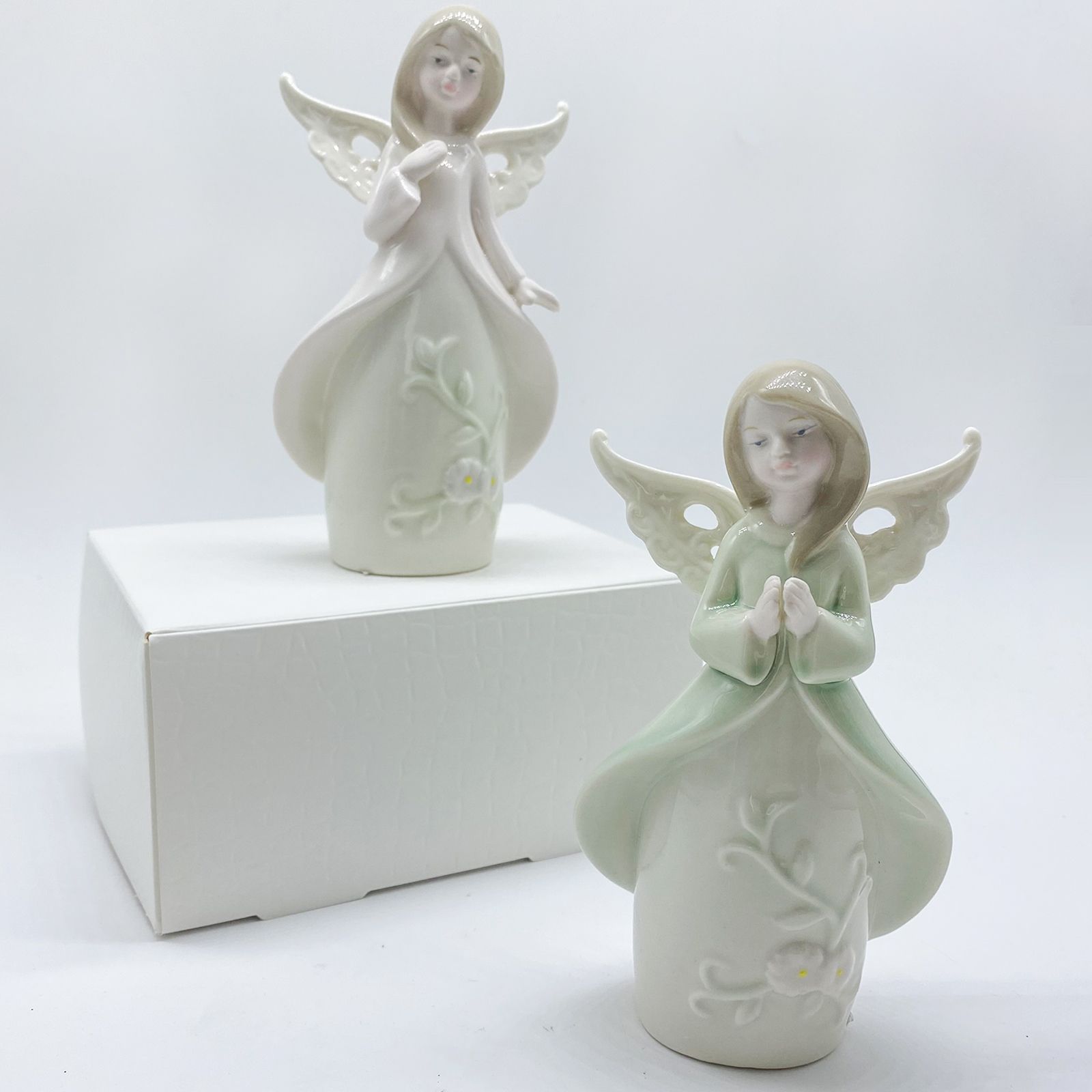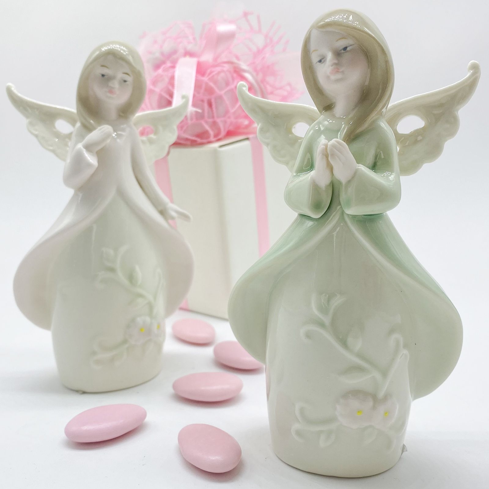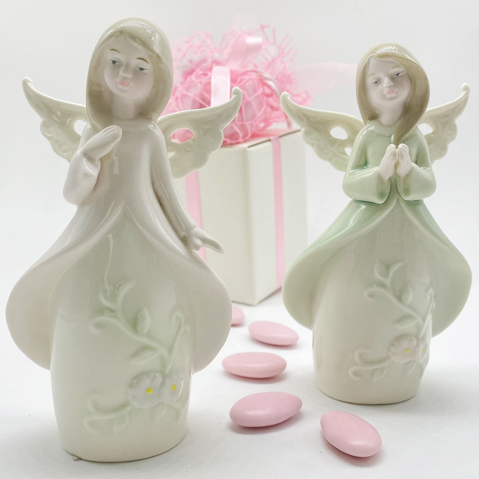 Disponibili per te questi graziosi angioletti in porcellana dai colori pastello con un ricamo floreale nella parte inferiore della veste, assortiti in due modelli: con veste rosa e con veste verde. Particolarissime le ali, con effetto traforato molto particolare.