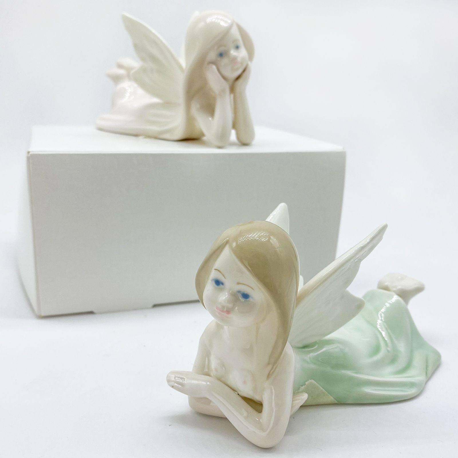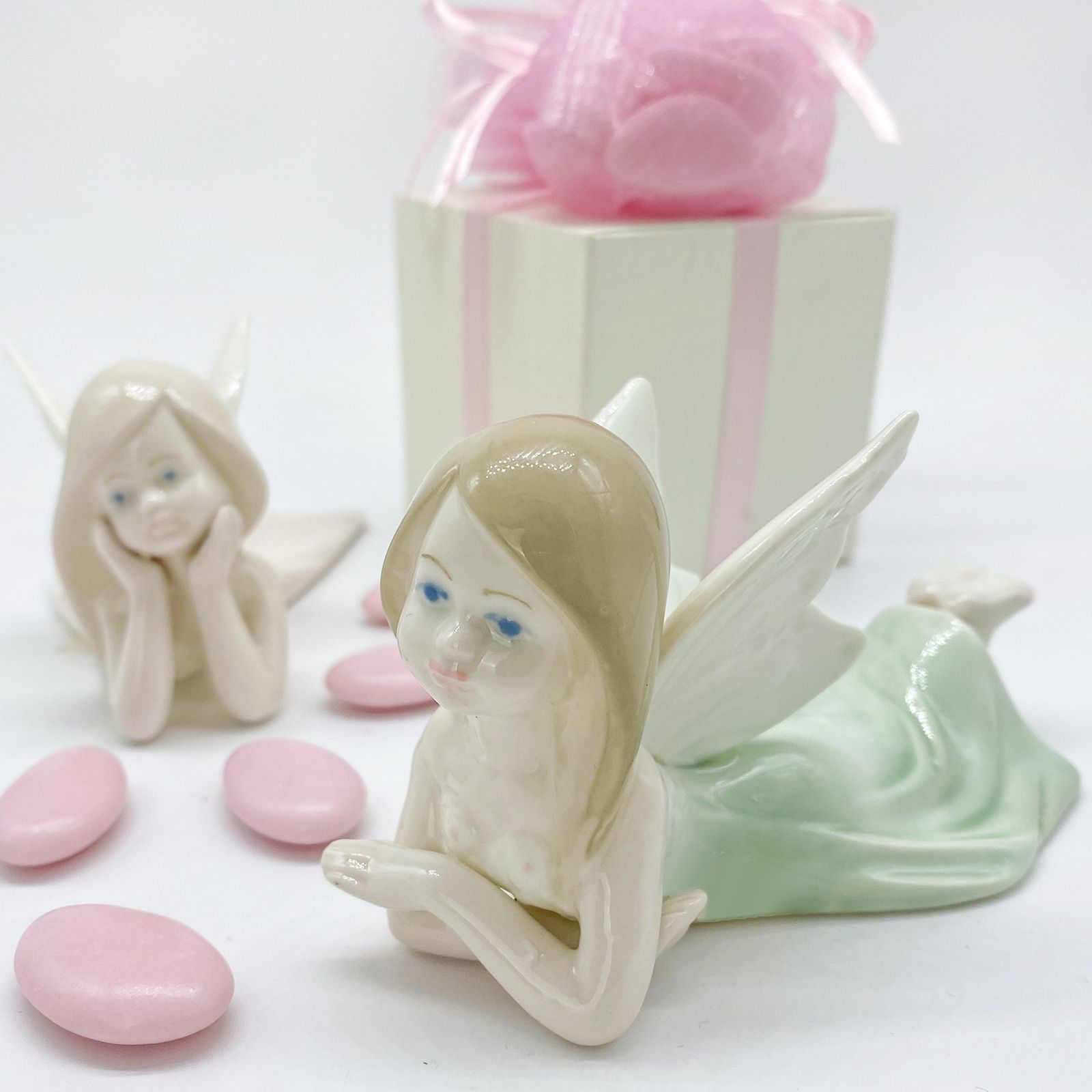 Disponibili per te questi angioletti in porcellana, assortiti in due varianti, raffigurati sdraiati con colore della veste (rosa tenue e verdino), colore dei capelli e pose differenti.
