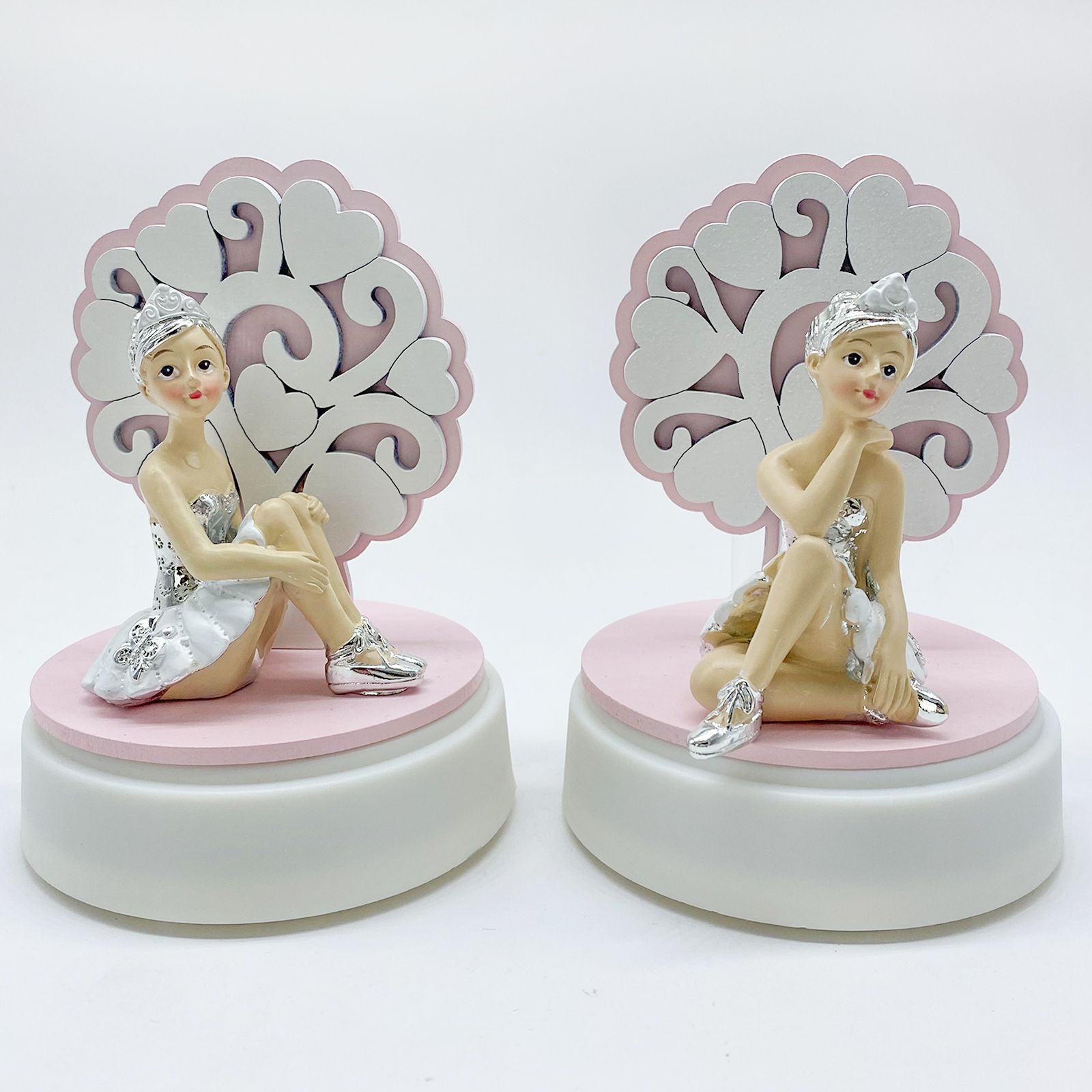Acquista i nostri carillon elettronici con albero della vita in legno rosa, con tronco e foglie bianche sulla cui base è presente una ballerina seduta con dettagli bianchi e argento in due pose assortite. Sotto la base in legno, è montato il carillon vero e proprio, un modulo elettronico con un piccolo altoparlante che funziona con 3 batterie AAA.