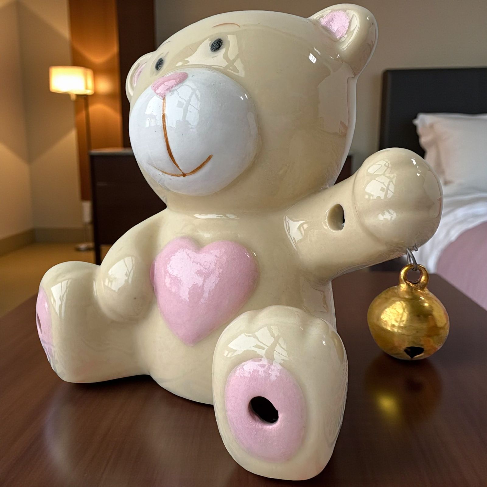 Orsetti in porcellana effetto lucido con particolari in rosa baby su nasino, zampe e cuoricino. L'orsetto bomboniera è provvisto di fori su tutto il corpo da cui fuoriesce la luce led per trasformarlo in una piccola lampada notturna.