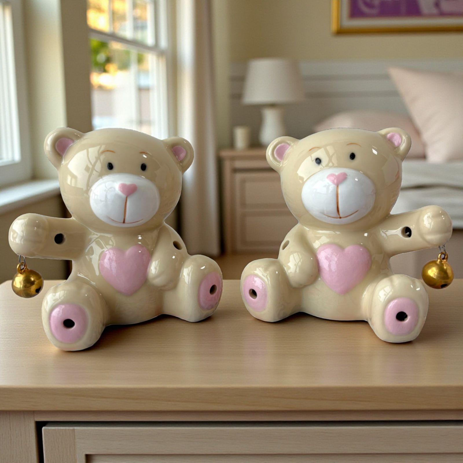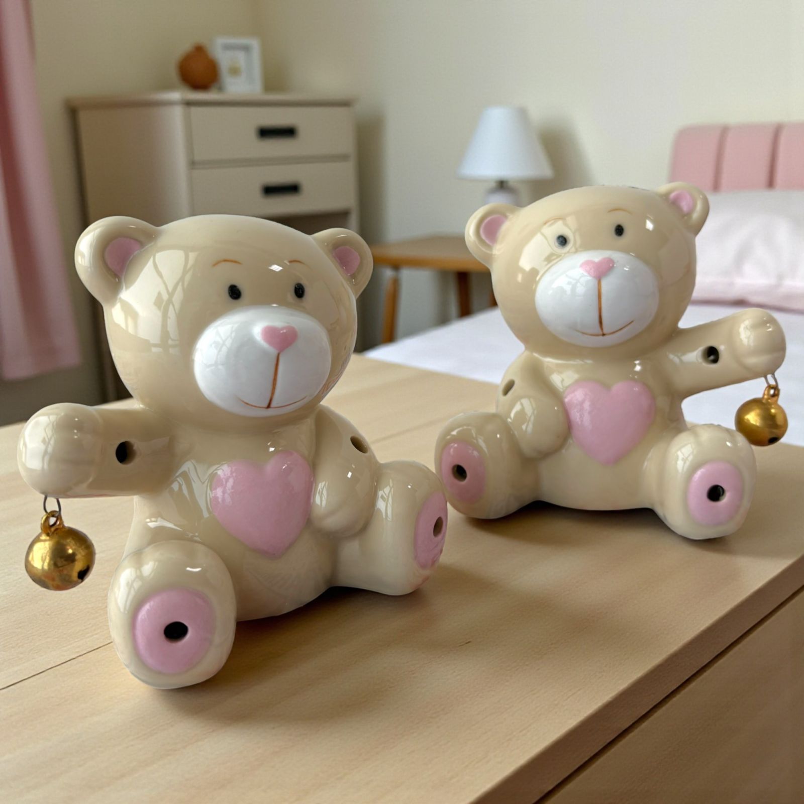 Gli orsettini sono assortiti in due varianti che differiscono per la posizione del sonaglino in metallo tenuto rispettivamente a destra e a sinistra.
