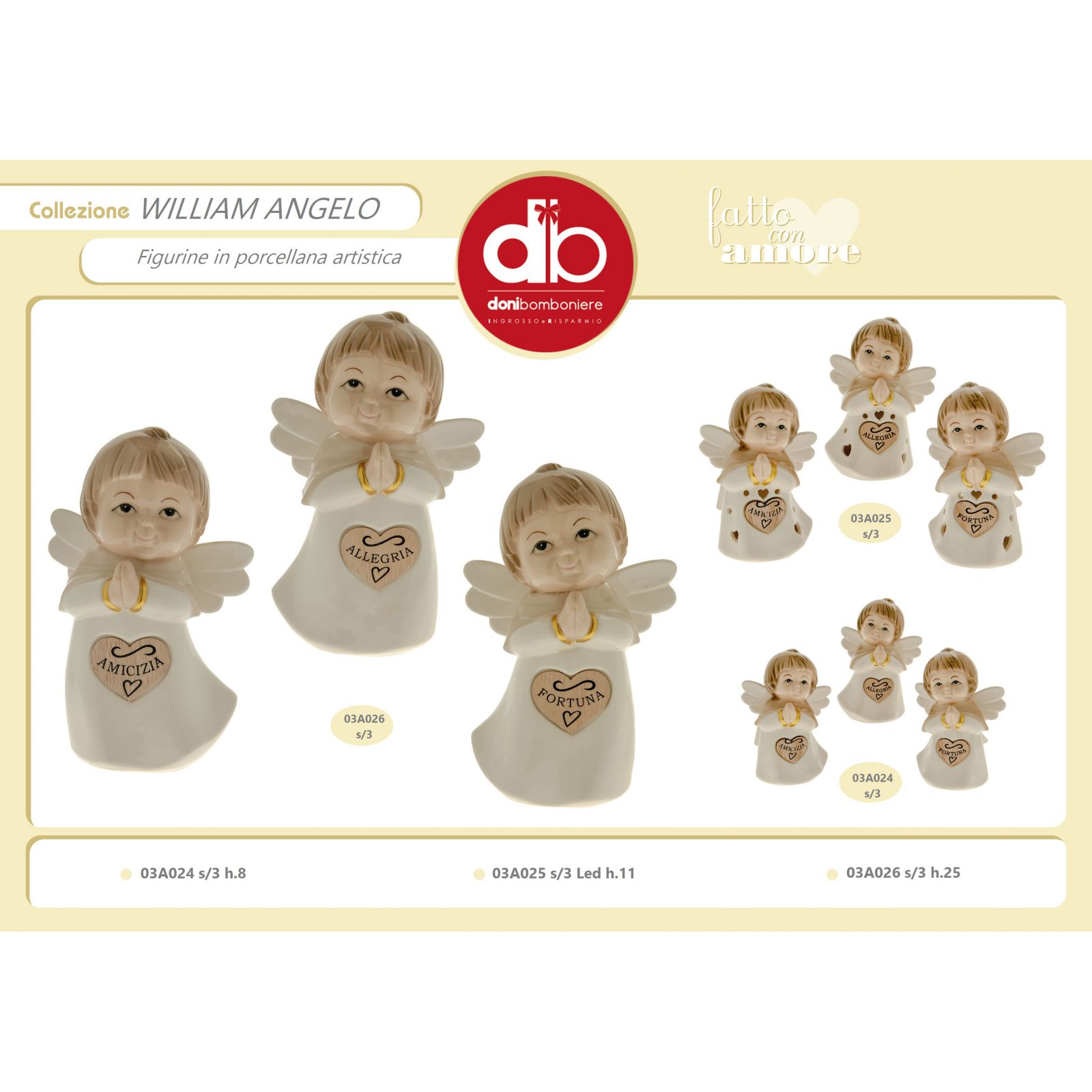 Angioletti in porcellana finissima effetto lucido, raffigurati con le mani giunte in preghiera e la veste bianca. Su tutta la bomboniera sono presenti fori attraverso i quali passa la luce generata dal led presente all'interno e che trasforma l'angioletto in una lucetta notturna. Gli angioletti bomboniere hanno un cuore in legno sulla veste, assortito in tre varianti che si differenziano per la parola presente all'interno: "Amicizia","Allegria", "Fortuna".