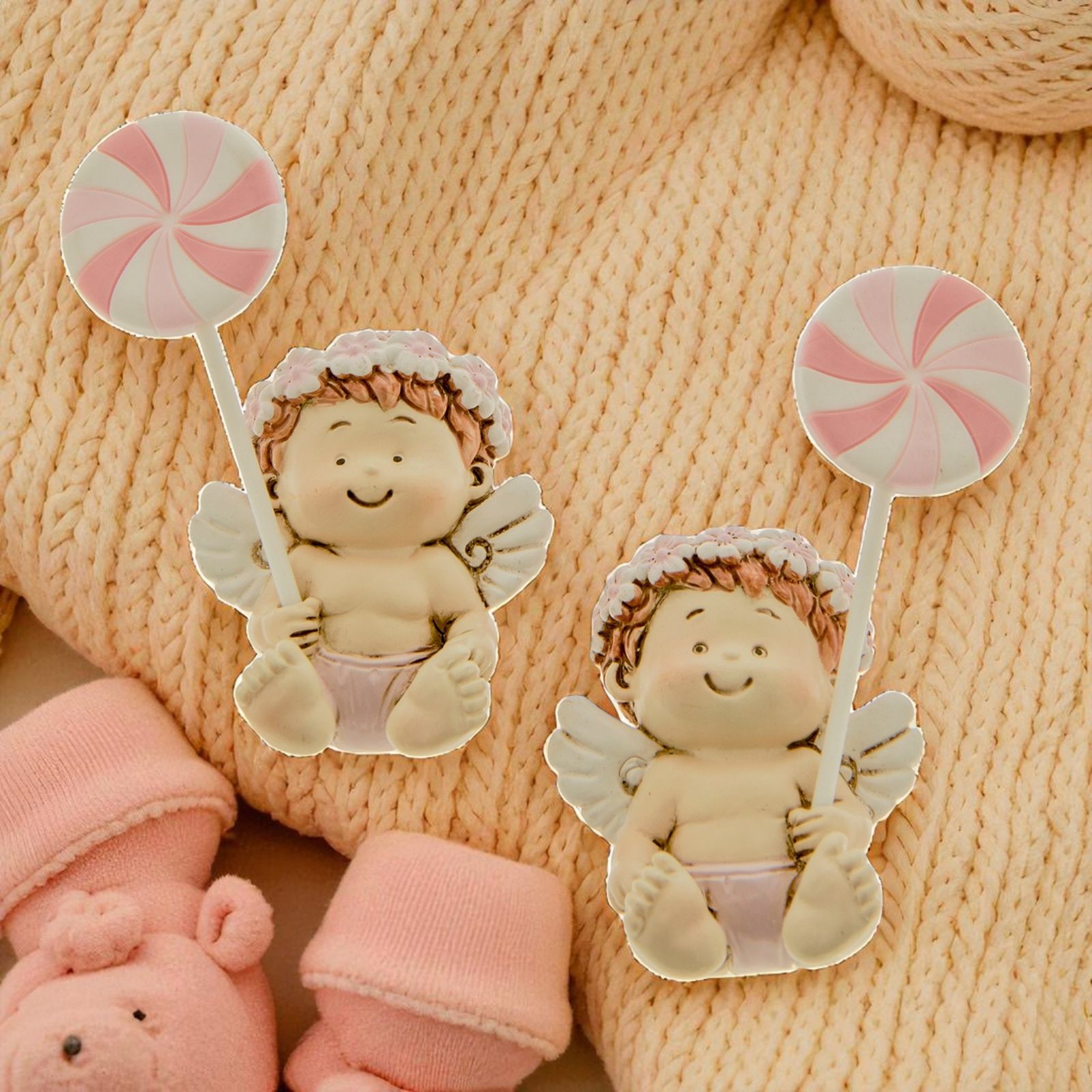 Statuine in resina a forma di angioletto con coroncina di fiori e pannolino rosa baby con magnete applicato sul retro. Ogni angioletto tiene in una mano (destra o sinistra a seconda dell'assortimento) una girandola bianca e rosa.