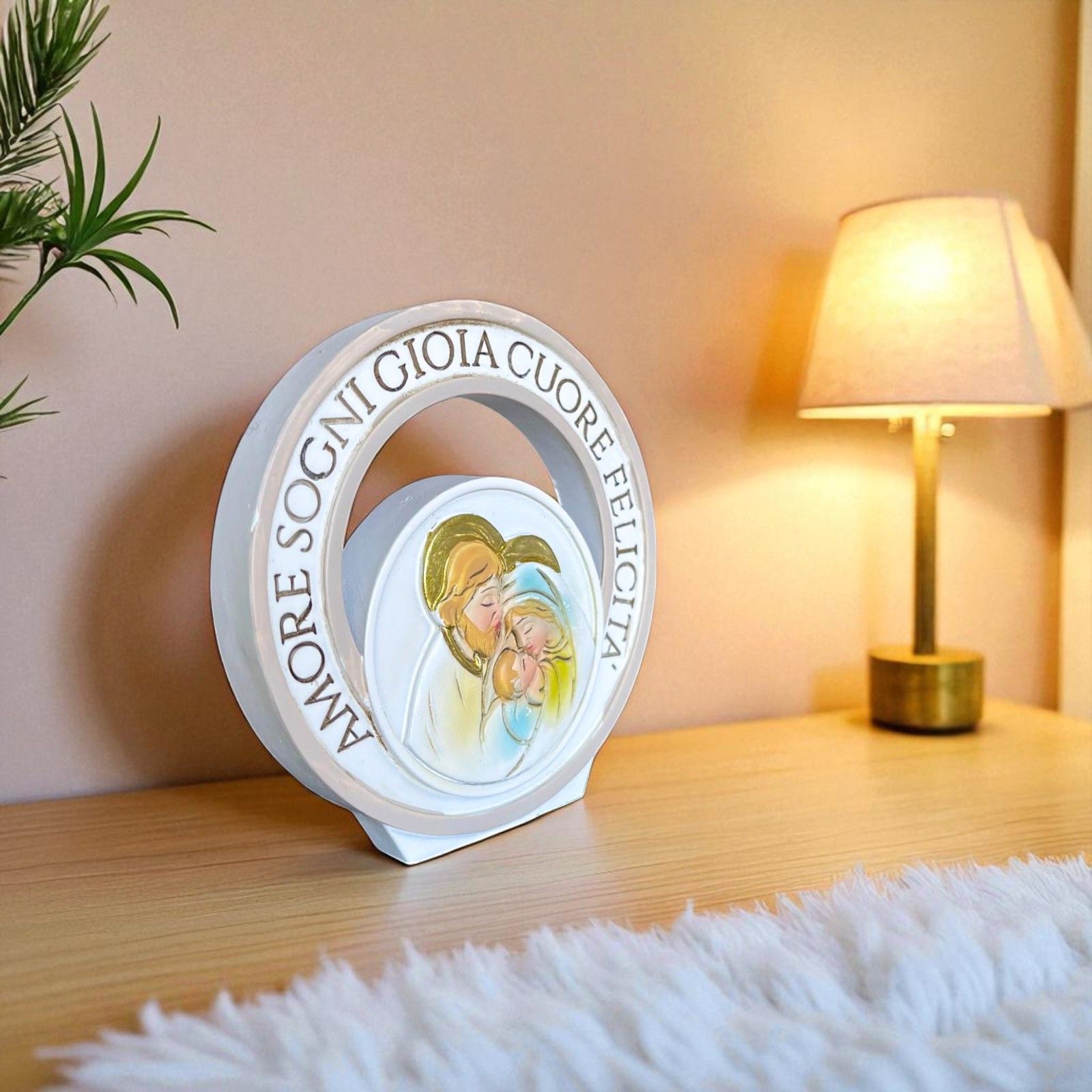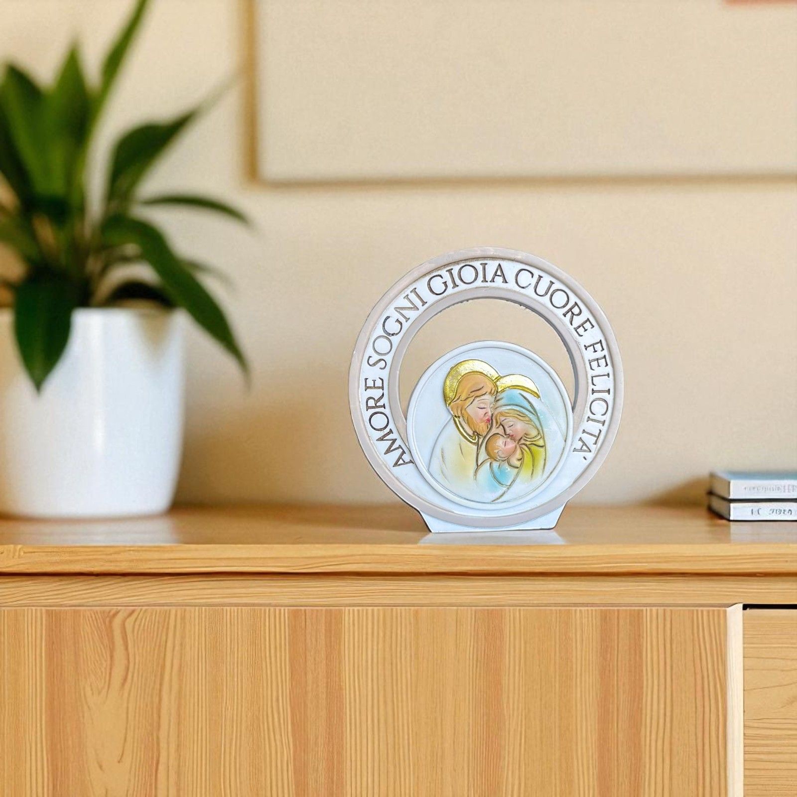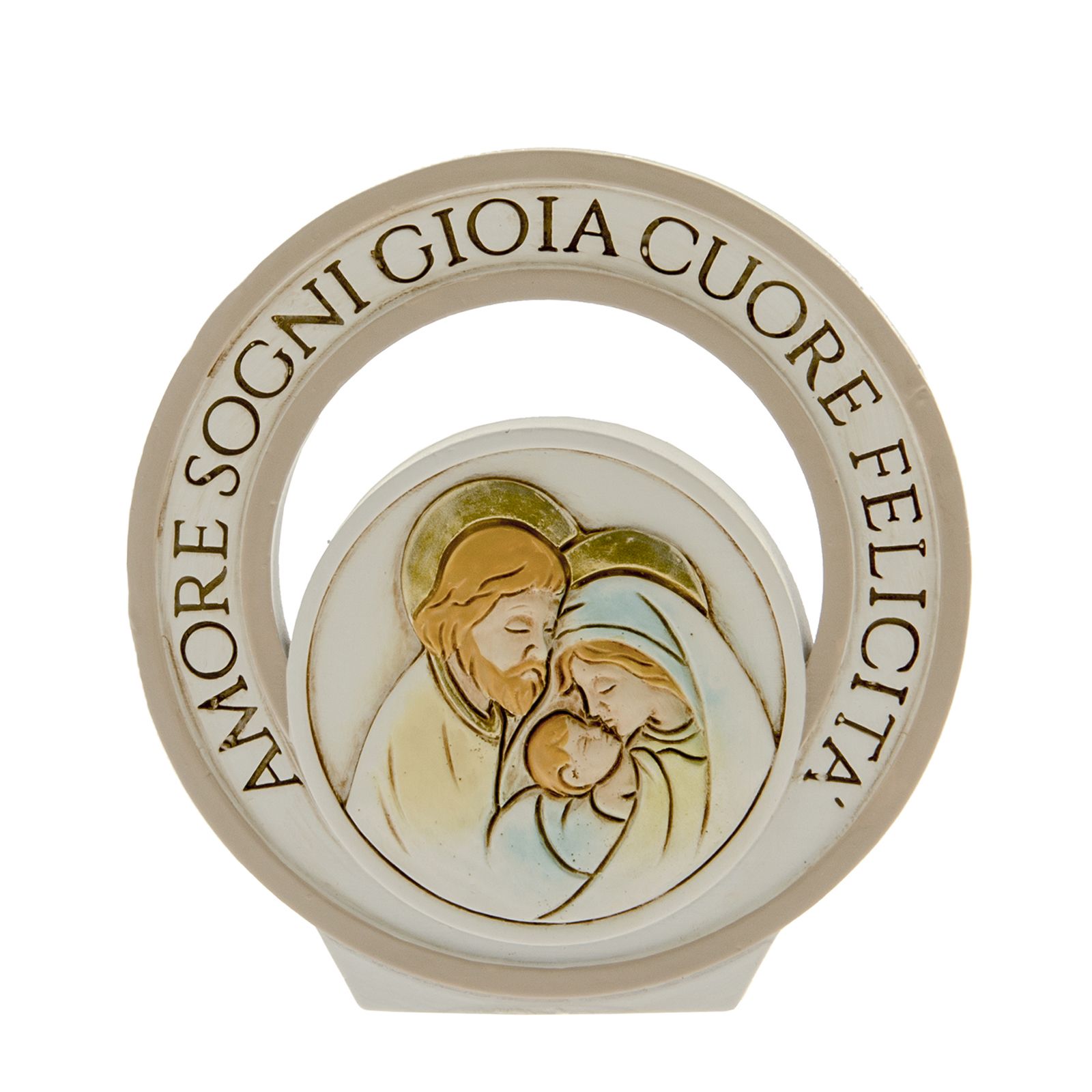 Bomboniere novità 2023, icone da tavolo circolari con raffigurazione della Sacra Famiglia nei toni pastello e sull'anello esterno, i termini: Amore, Sogni, Gioia, Cuore, Felicità.