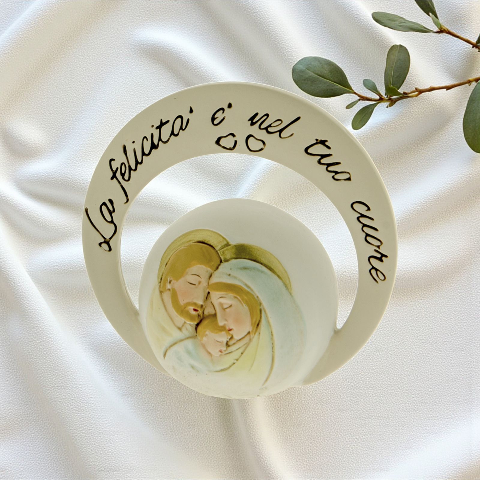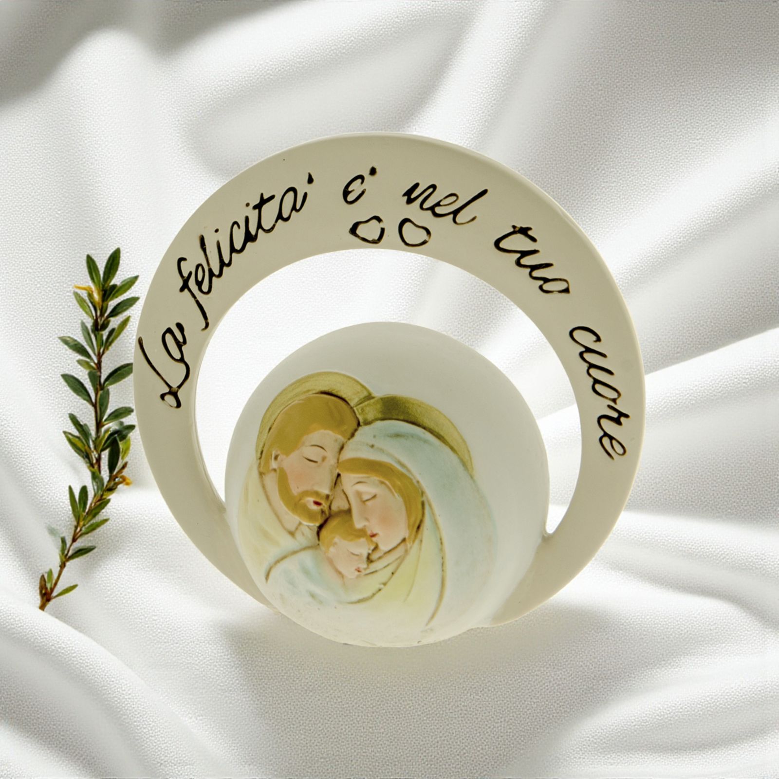 Piccole icone da tavolo in resina a sfondo bianco, con sfera su cui è raffigurata la Sacra Famiglia e anello esterno, su cui è impressa la frase: "La felicità è nel tuo cuore".