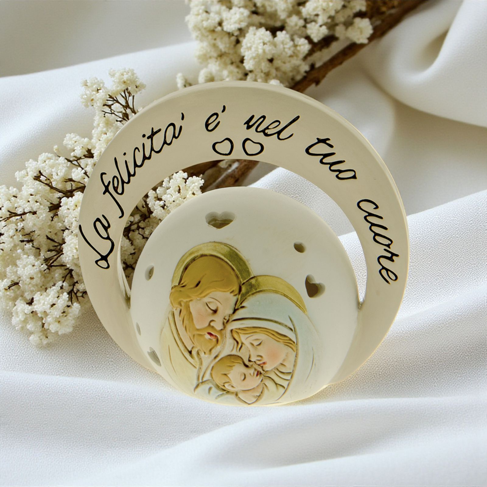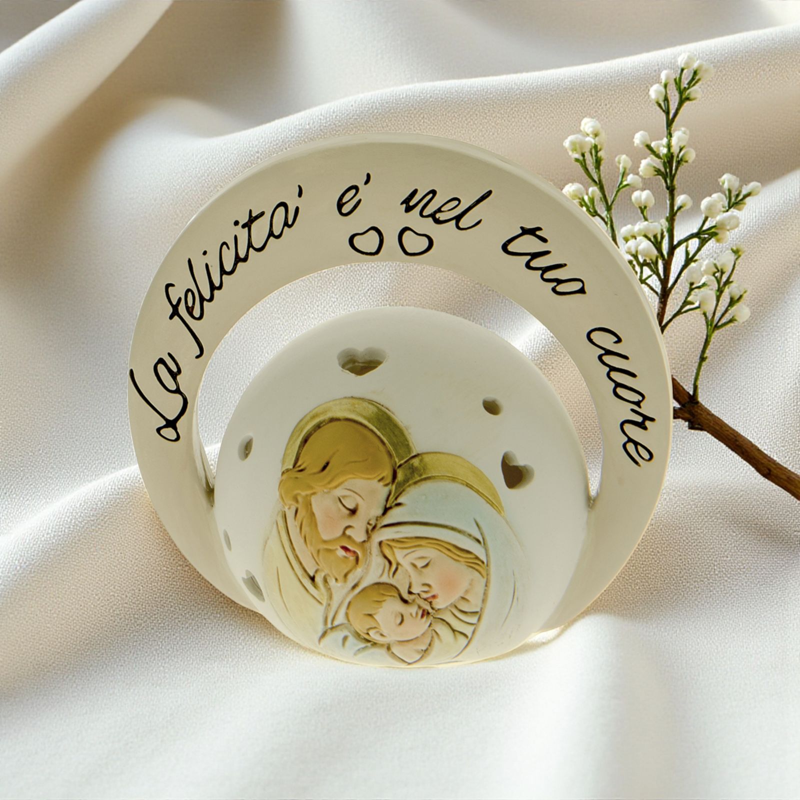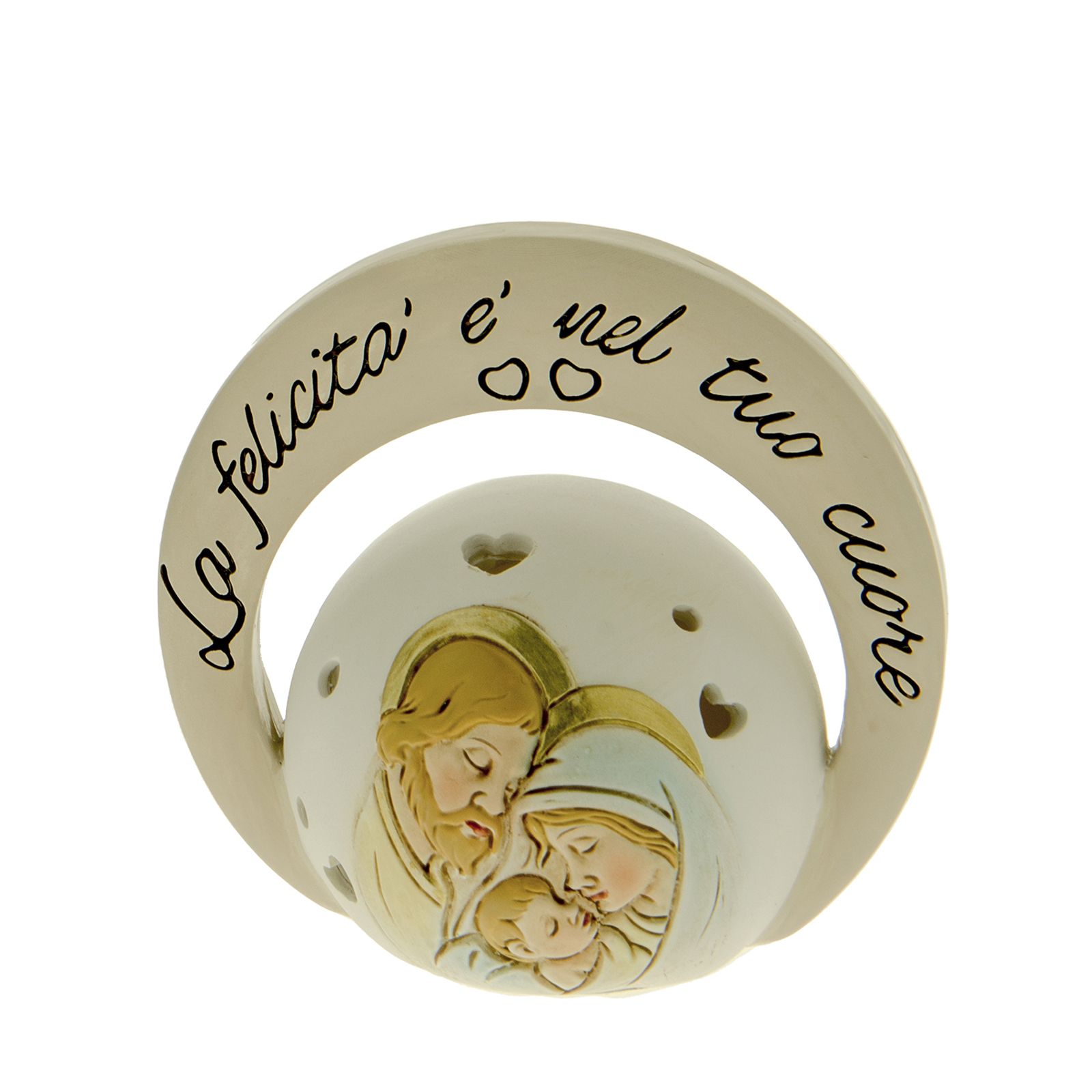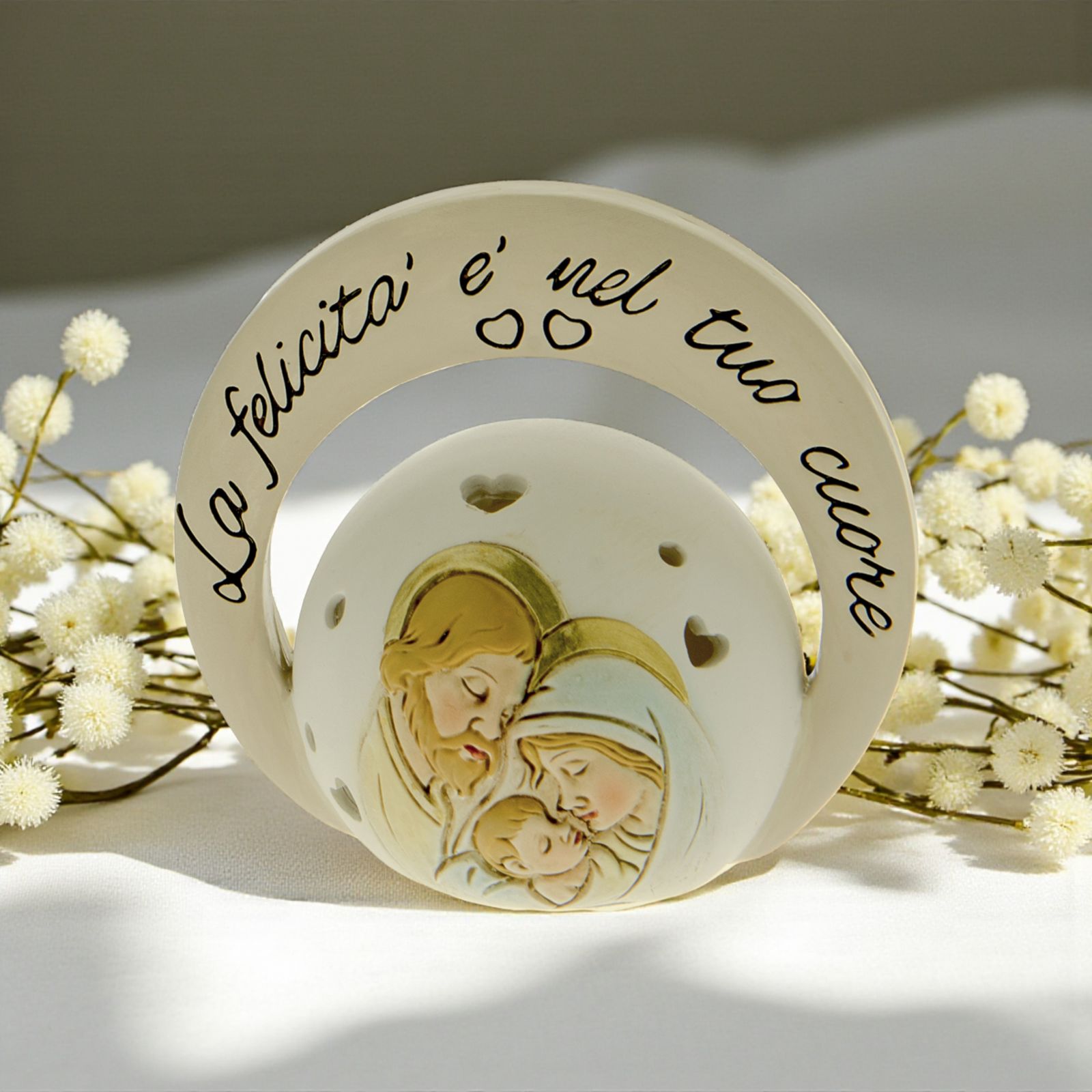 Riproduzione artistica in resina con sfera con raffigurazione della Sacra Famiglia nei colori pastello e anello esterno con impressa la frase: "La felicità è nel tuo cuore". Tutta la sfera è percorsa da fori a forma di cuore per permettere alla luce di filtrare all'esterno trasformando l'icona in una lucetta led.