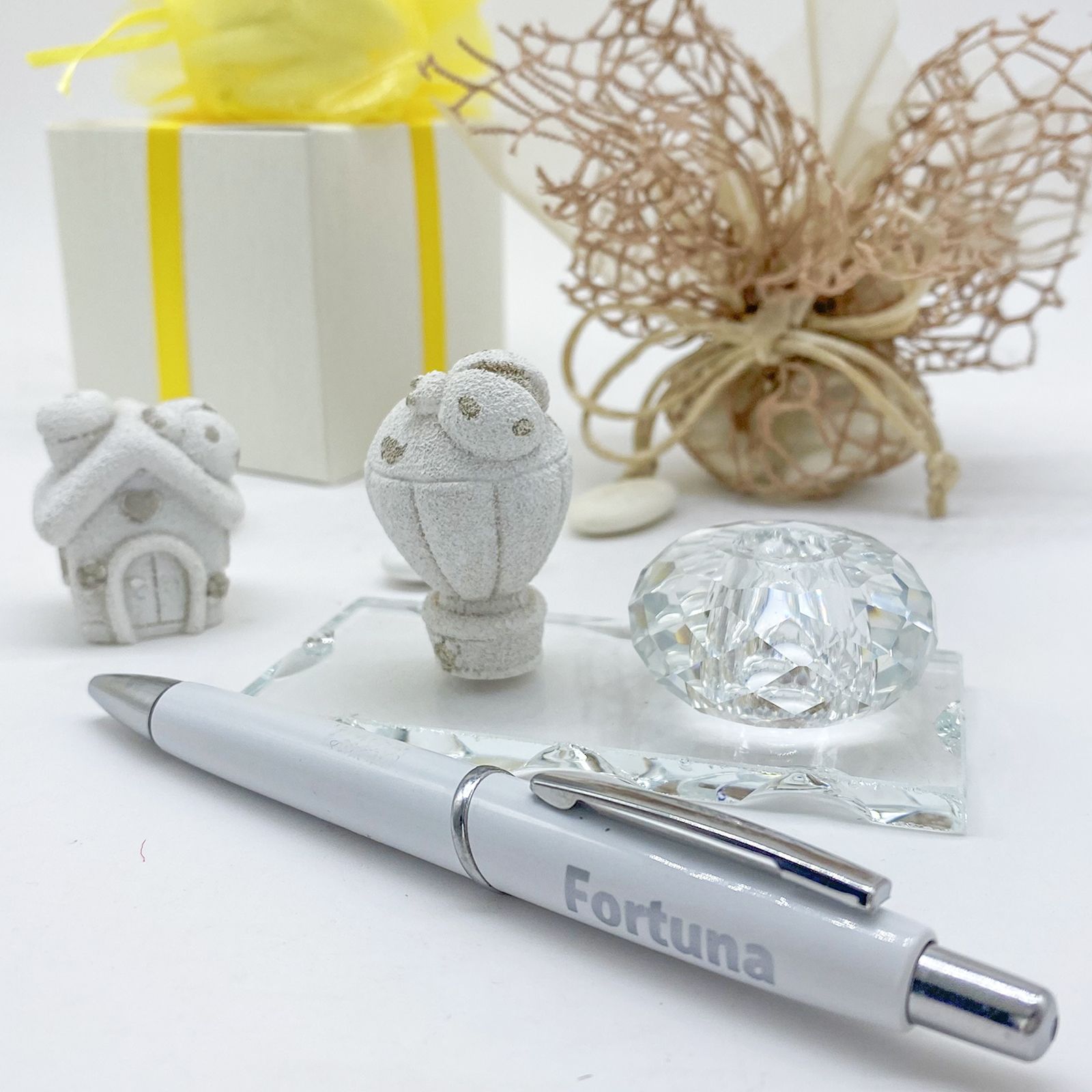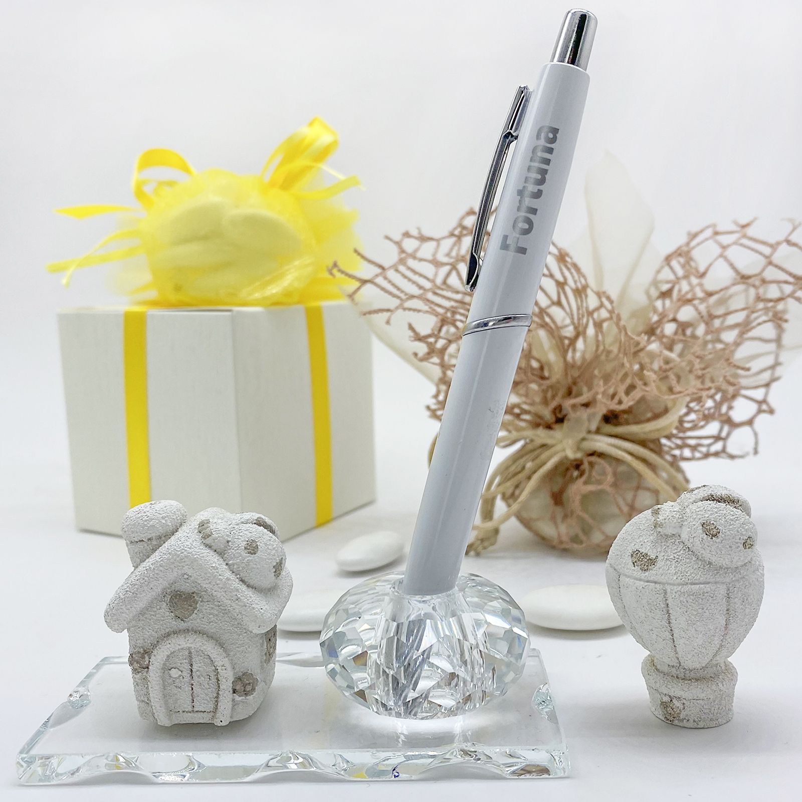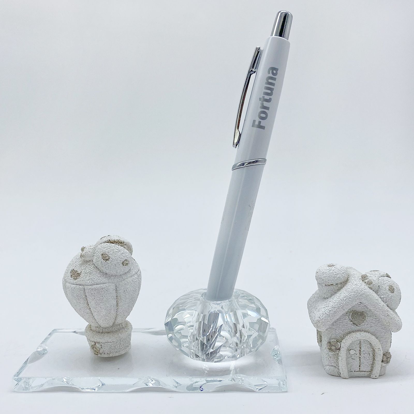 Portapenne in vetro con lavorazione cristallo su cui è posta una statuina assortita in due varianti: casetta o mongolfiera, realizzate in resina nei colori del bianco e tortora. Con ogni portapenne acquistato in omaggio una penna a sfera bianca con la scritta: "Fortuna".