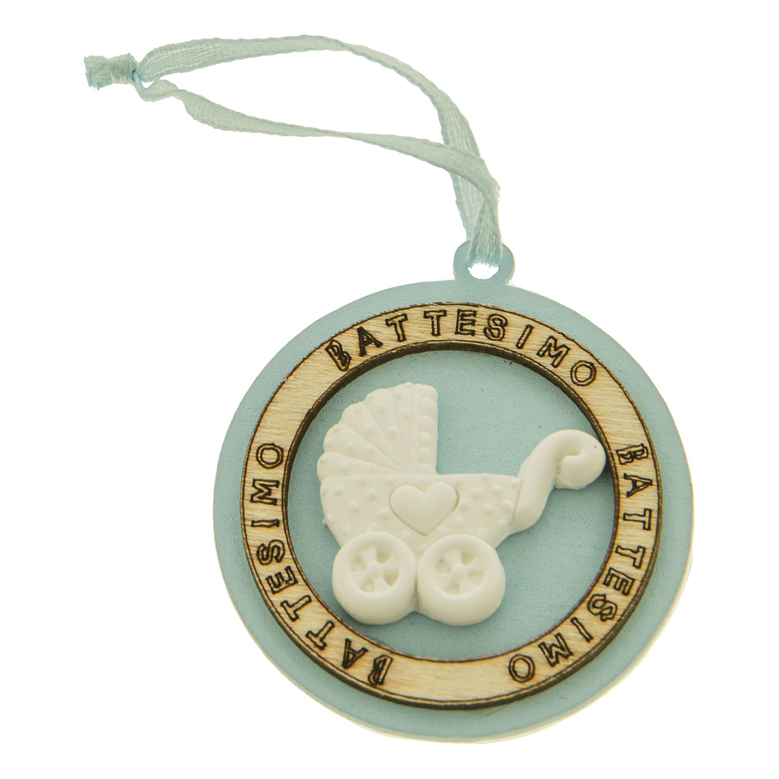 Bellissimi appendini in legno celeste circolari con gessetto bianco a forma di carrozzina centrale per decorare bomboniere, portaconfetti o segnaposto battesimo!