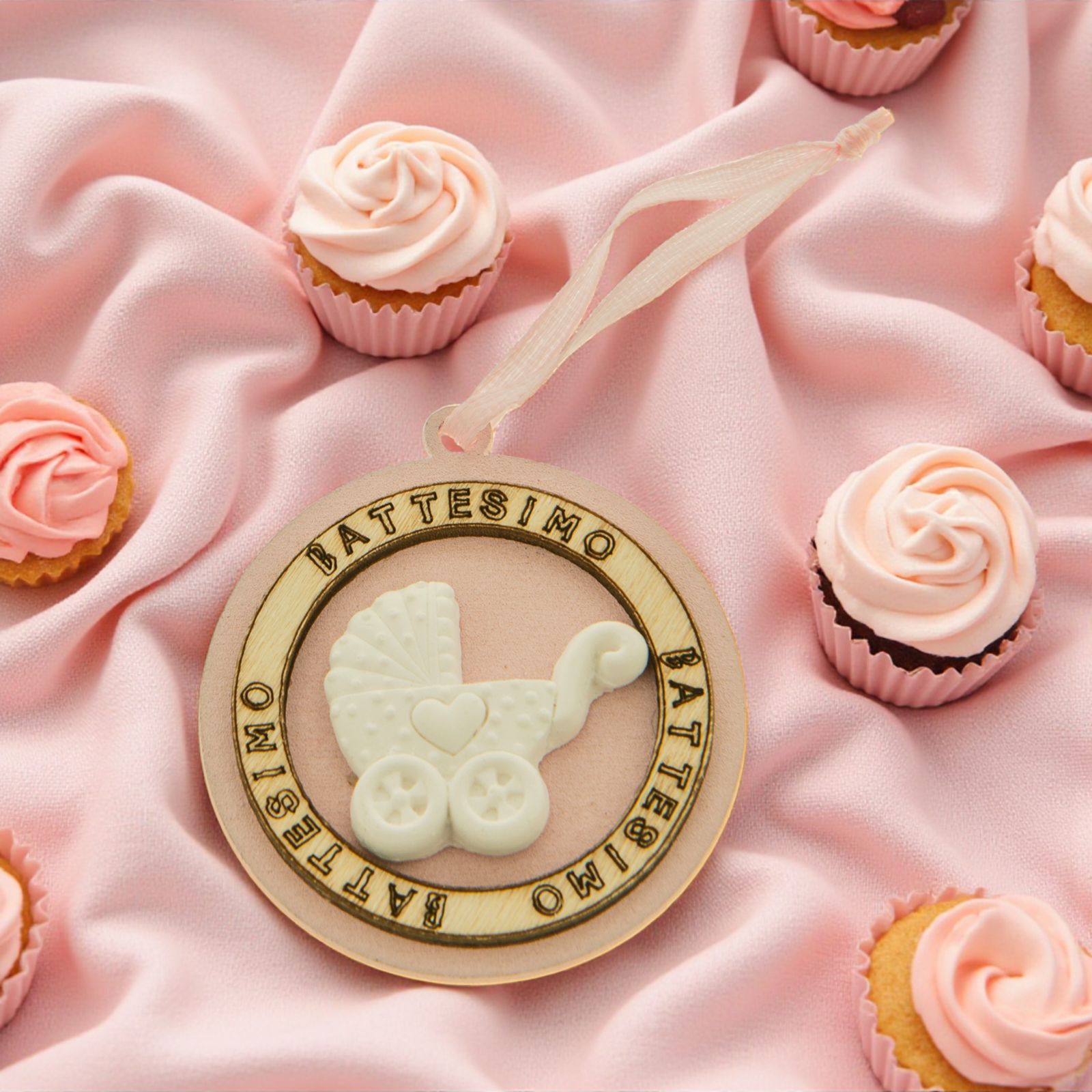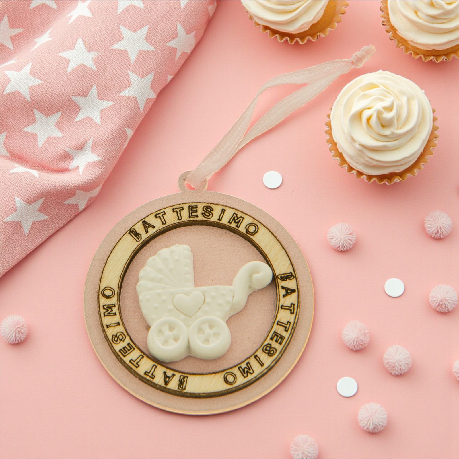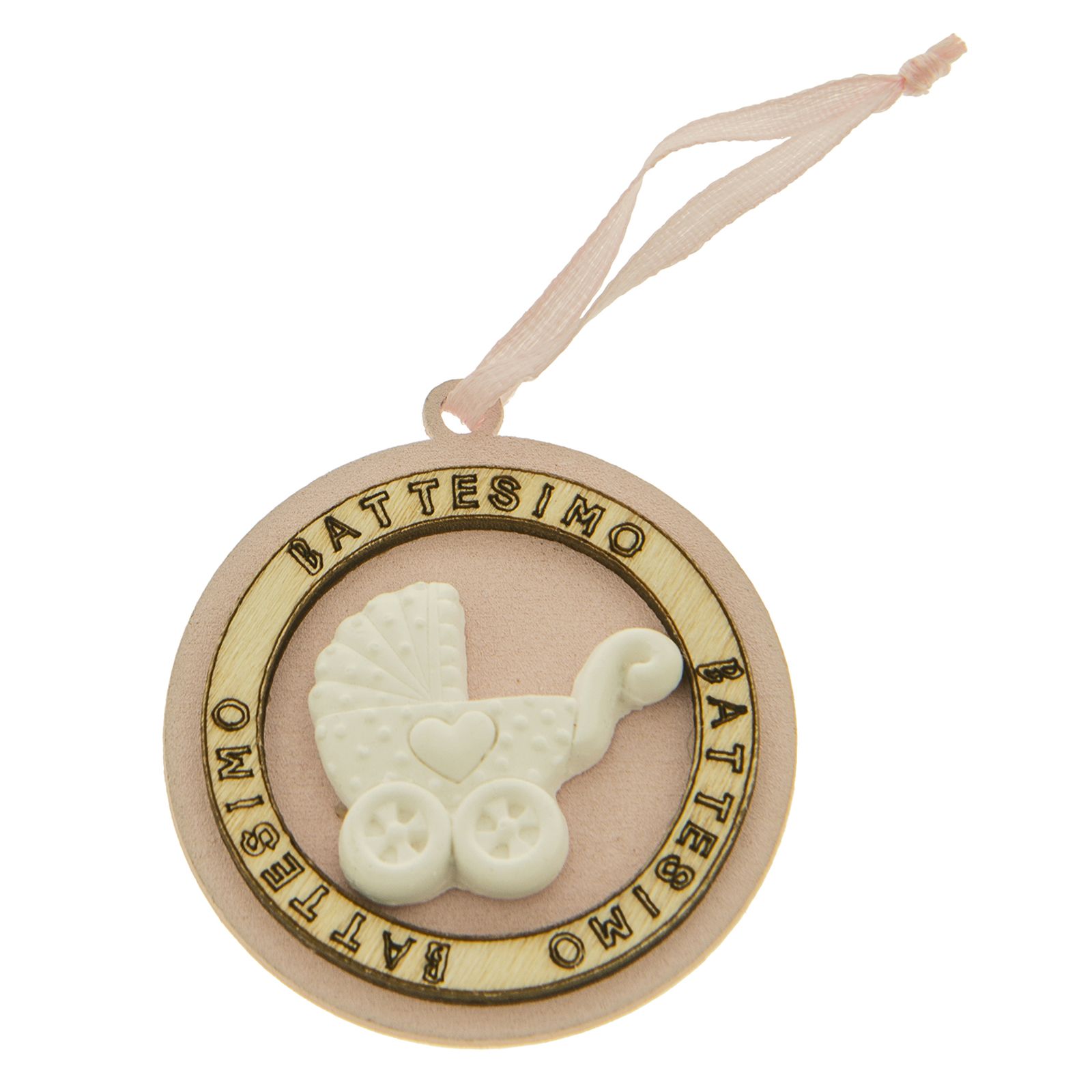 Medaglioni in legno rosa con nastro in raso, con scritta battesimo che percorre tutto il bordo esterno e racchiude un gessetto a forma di carrozzina bianco.