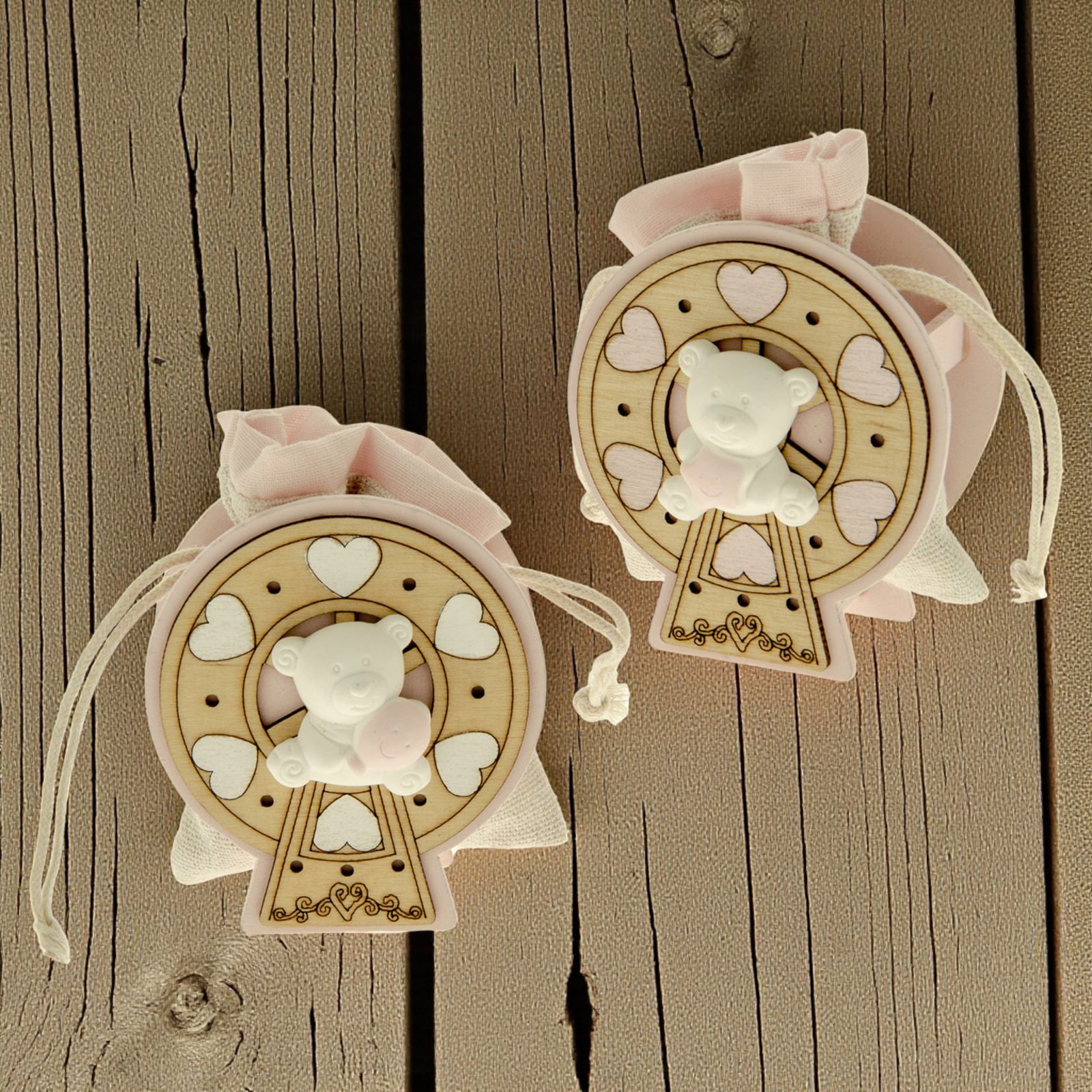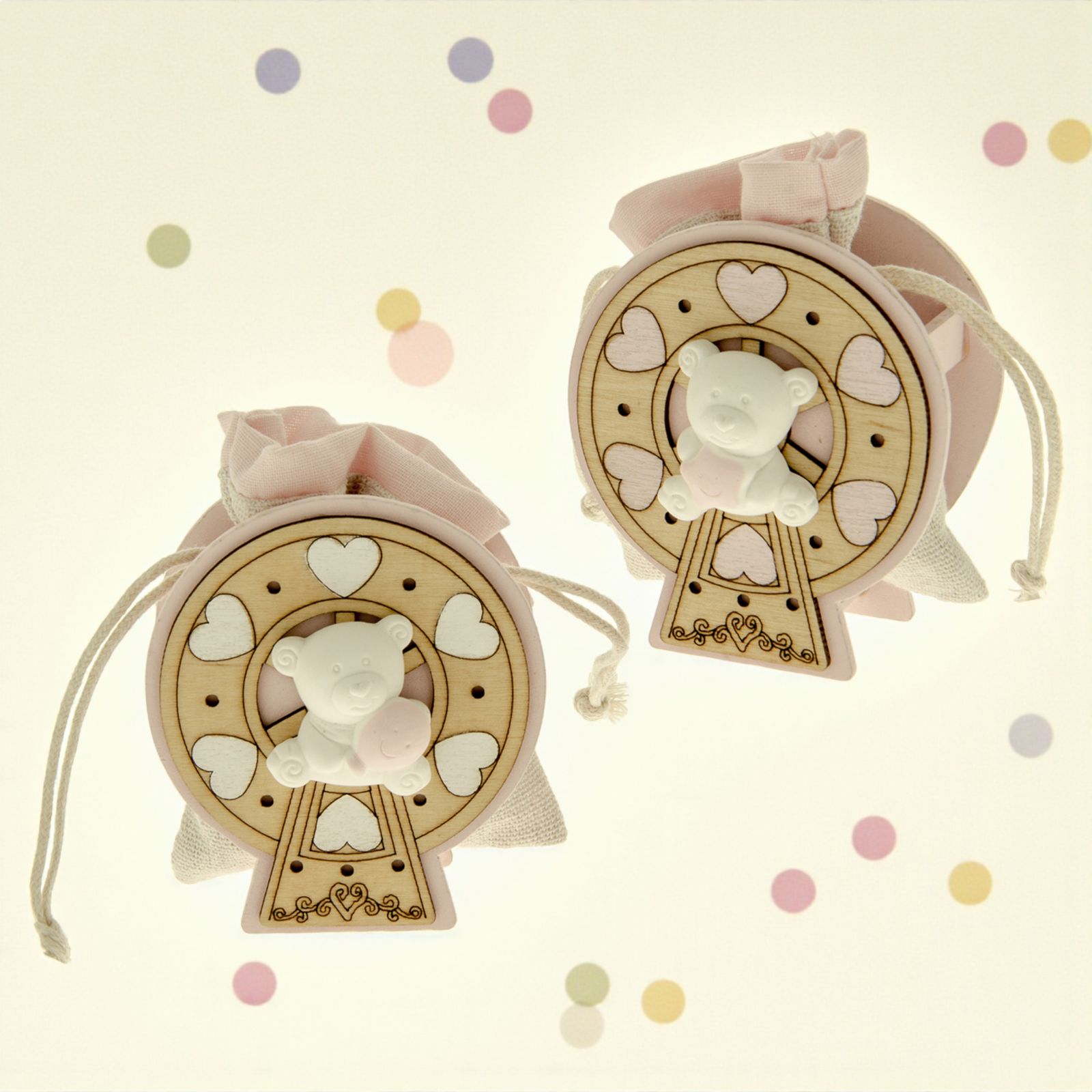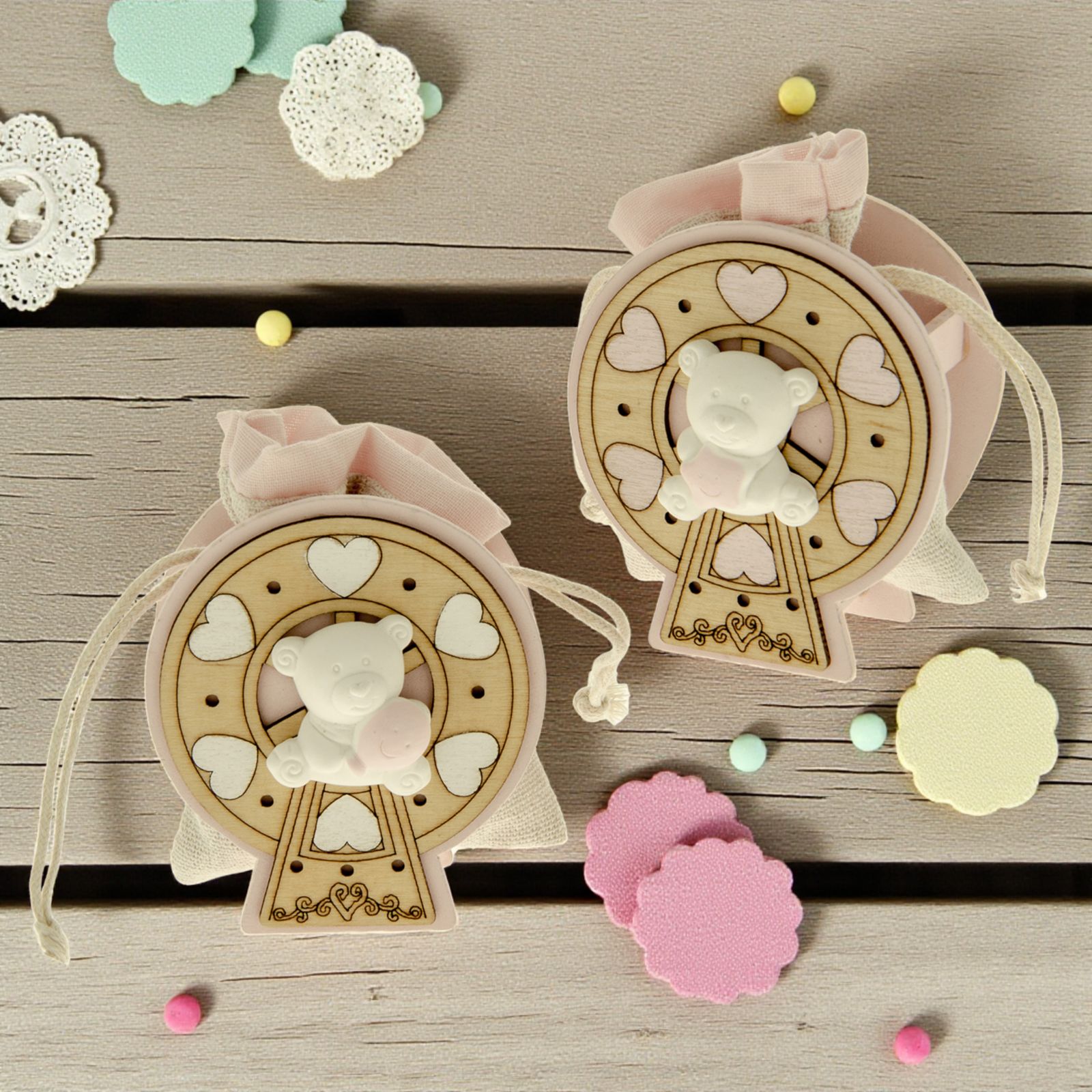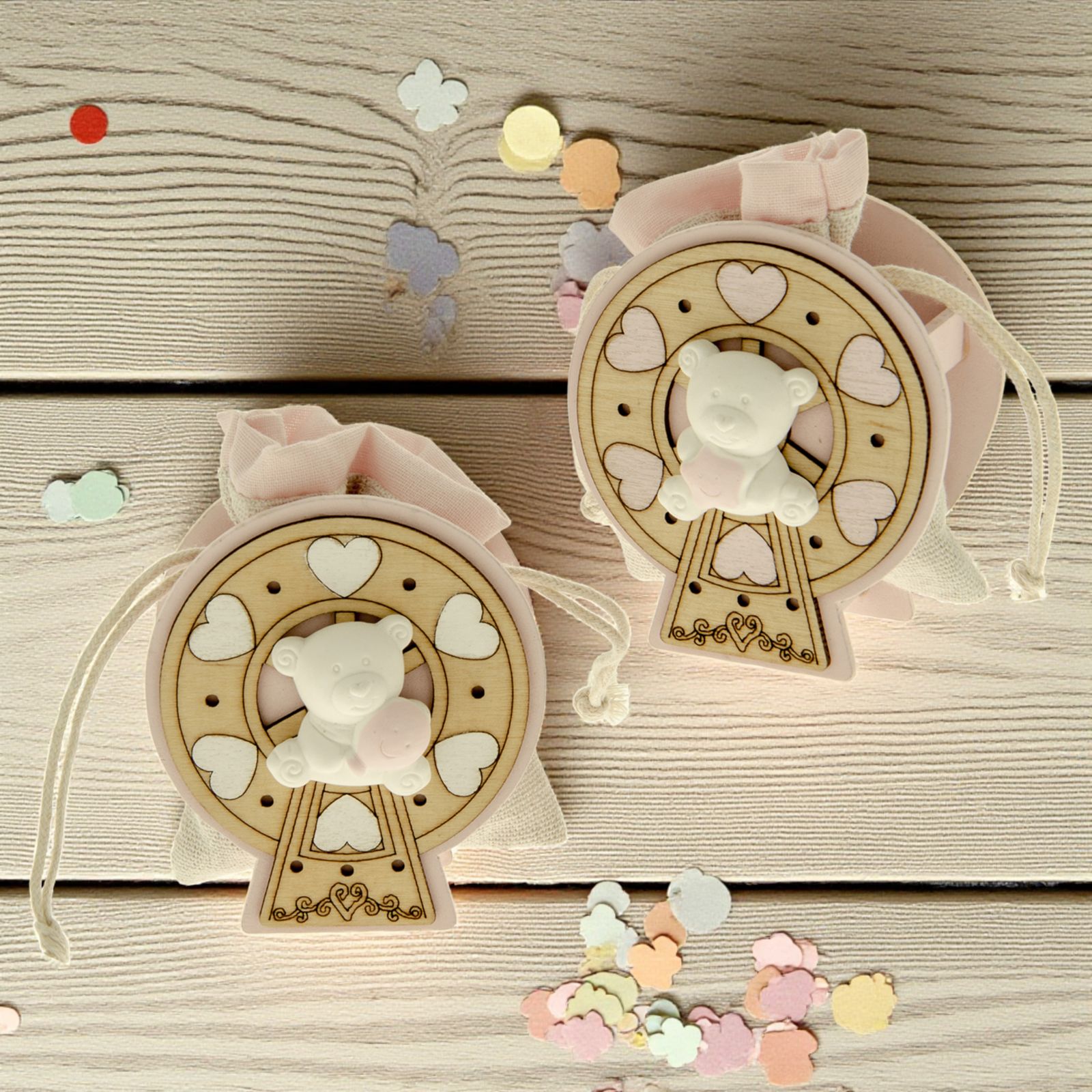 Disponibili per te scatoline portaconfetti in legno a forma di ruota panoramica con dettagli in tonalità naturale e rosa con centralmente un orsetto in gesso bianco con cuoricino rosa. Le scatoline sono assortite in due varianti che si differenziano per la posizione del cuoricino dell'orsetto.