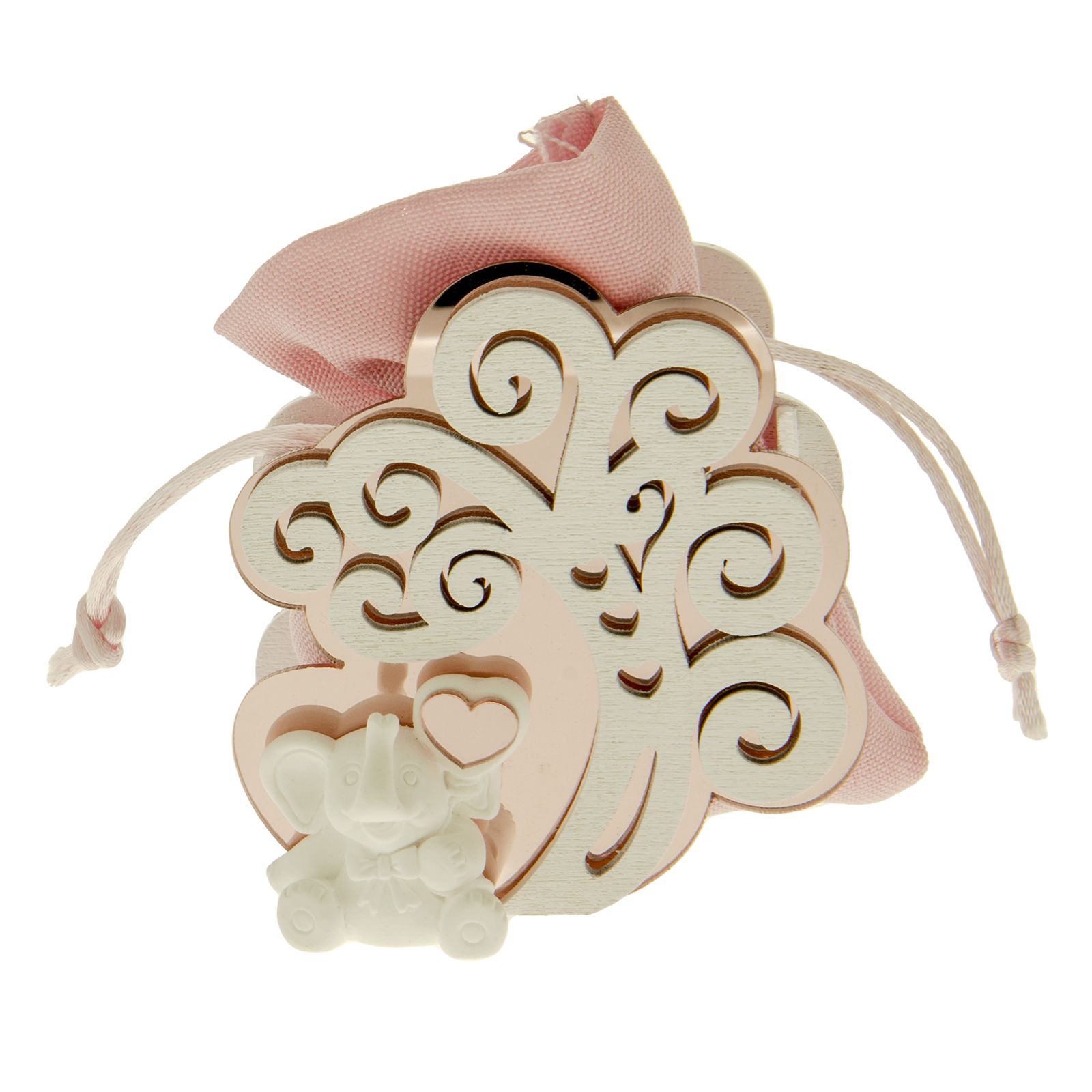 Disponibili per te queste graziose scatoline in pvc rosa e legno, con albero della vita in bianco e alla base un piccolo elefantino in gesso. All'interno della scatolina, troverai, compreso nel prezzo, un sacchettino portaconfetti in tessuto rosa con comodi tiranti.