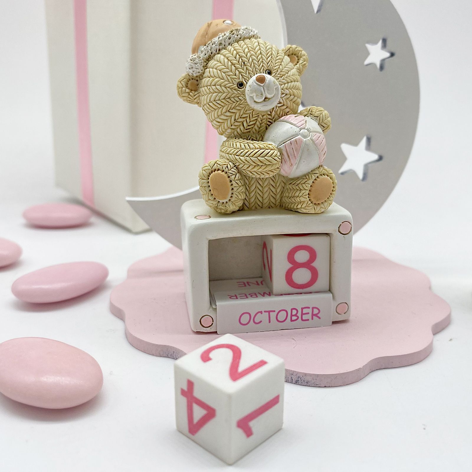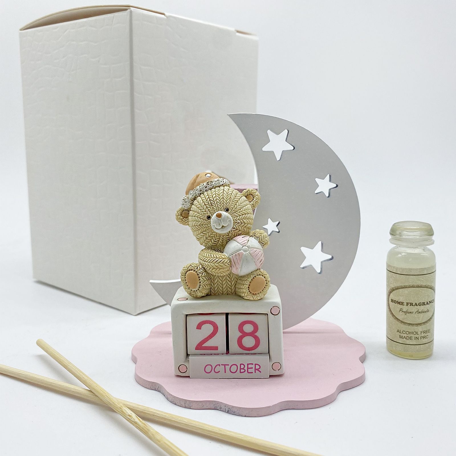 Abbiamo scelto per te questi dolcissimi profumatori per ambiente su base in legno rosa da cui parte una luna trapunta di stelle bianca, che nasconde parzialmente la fiala che va ad accogliere le bacchette con l'essenza profumata. Davanti alla falce lunare, troverai un tenero orsetto in resina con cappello da notte seduto su un calendario perpetuo/datario funzionante ed utilizzabile.
