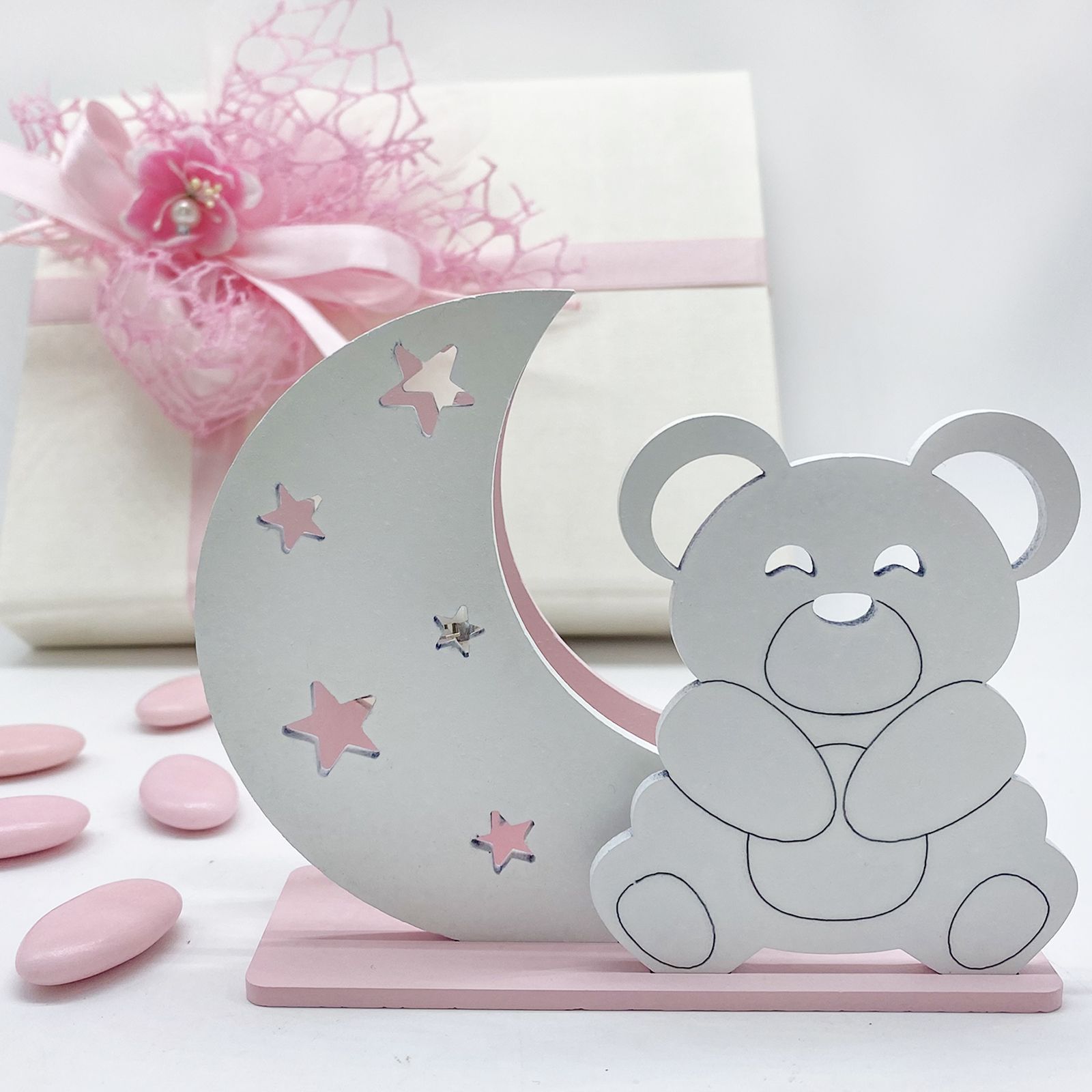 Disponibili per te queste luci led con struttura in legno in tonalità rosa e bianca a forma di mezzaluna con piccole stelline da cui fuoriesce la luce sprigionata dal modulo a batteria. Accanto alla luna è inoltre presente la sagoma bianca di un tenero orsetto sorridente.