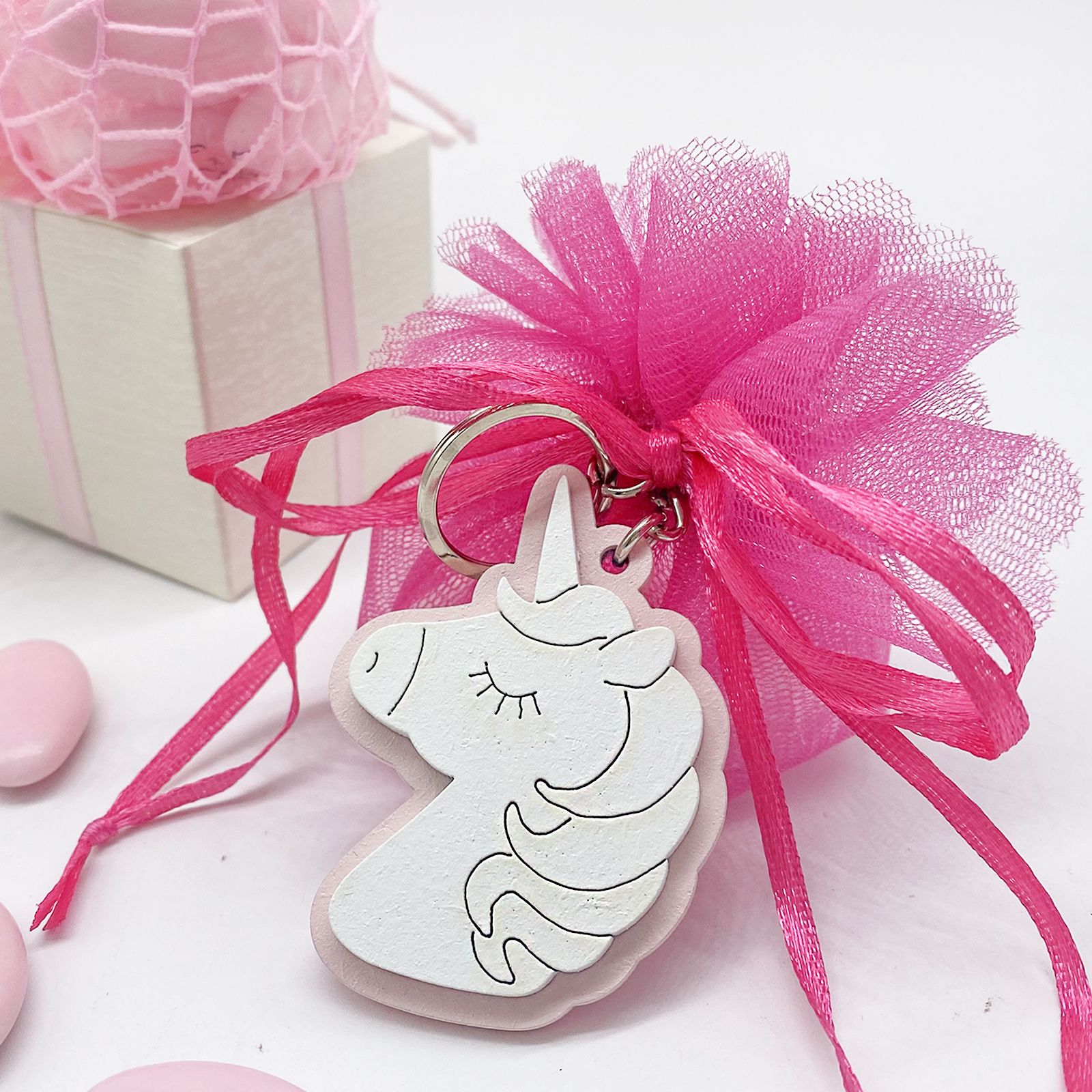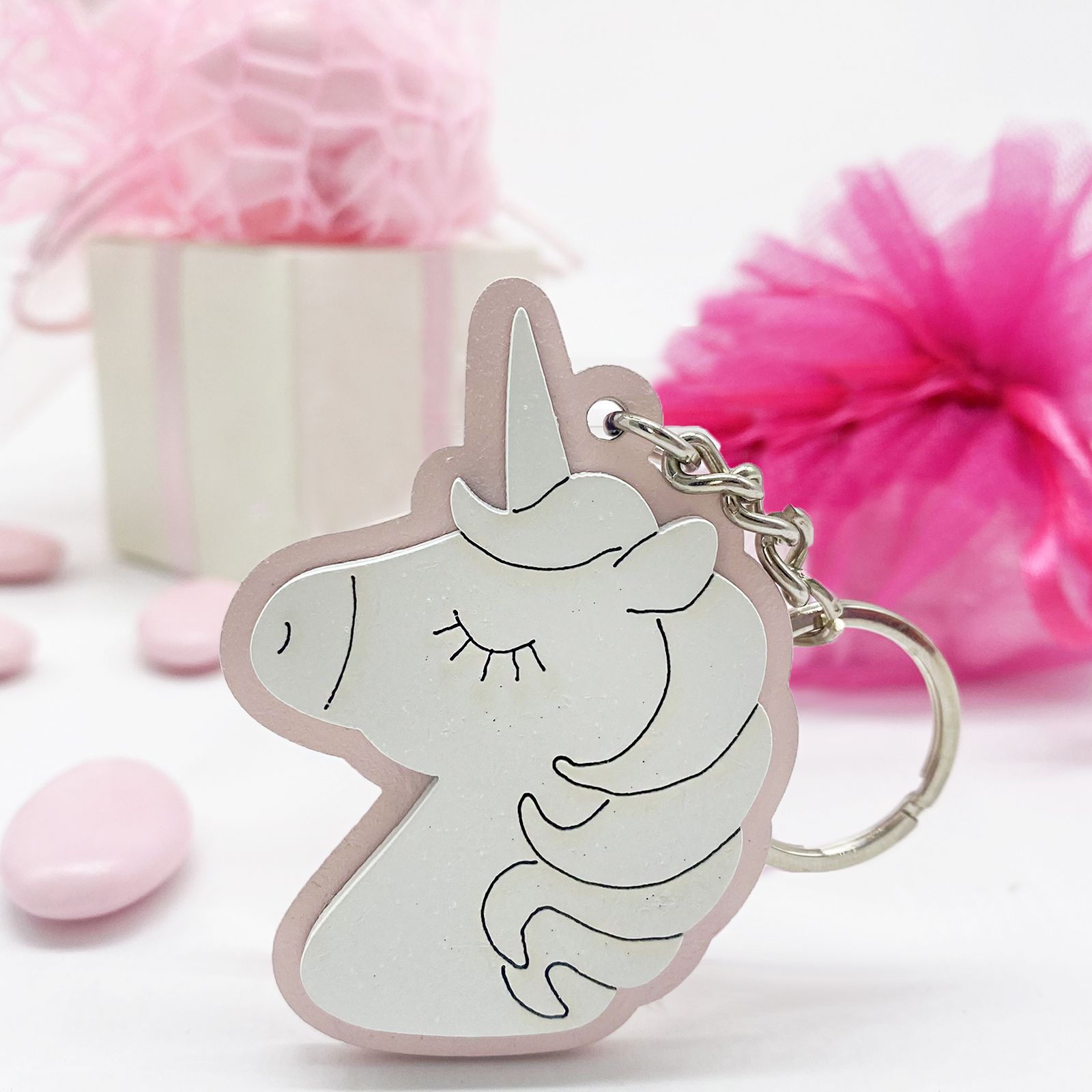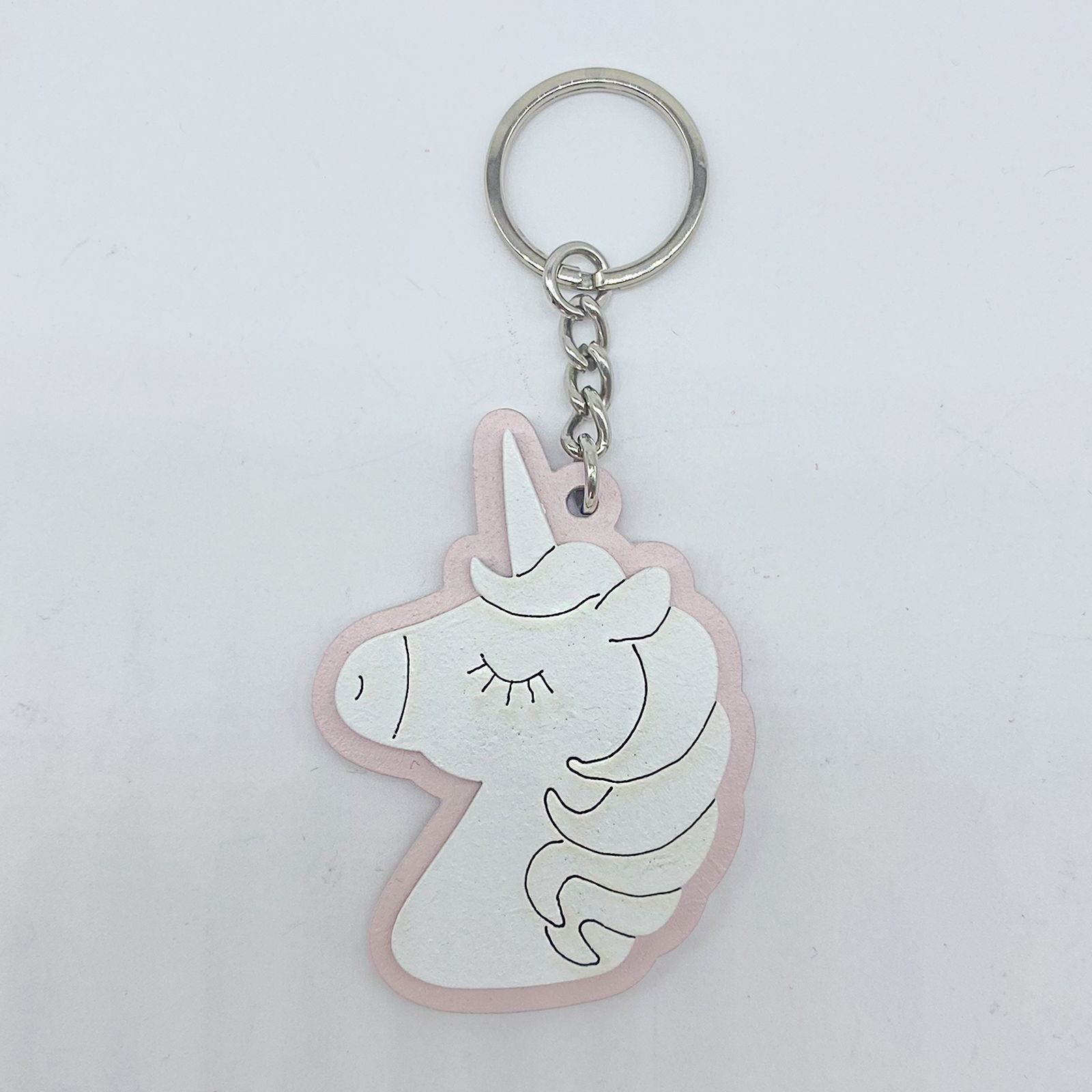 Ti presentiamo i nostri portachiavi in legno, con base rosa a forma di unicorno bianco, con anello e catena in metallo.