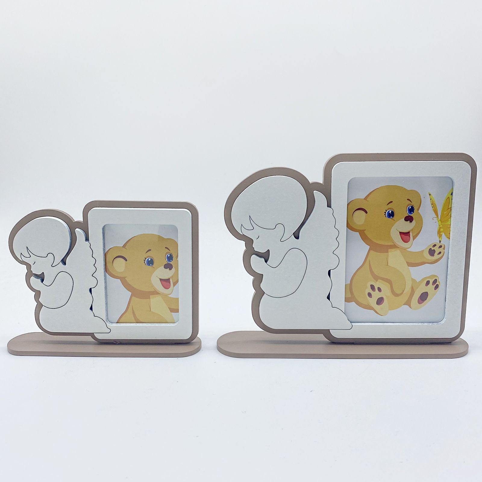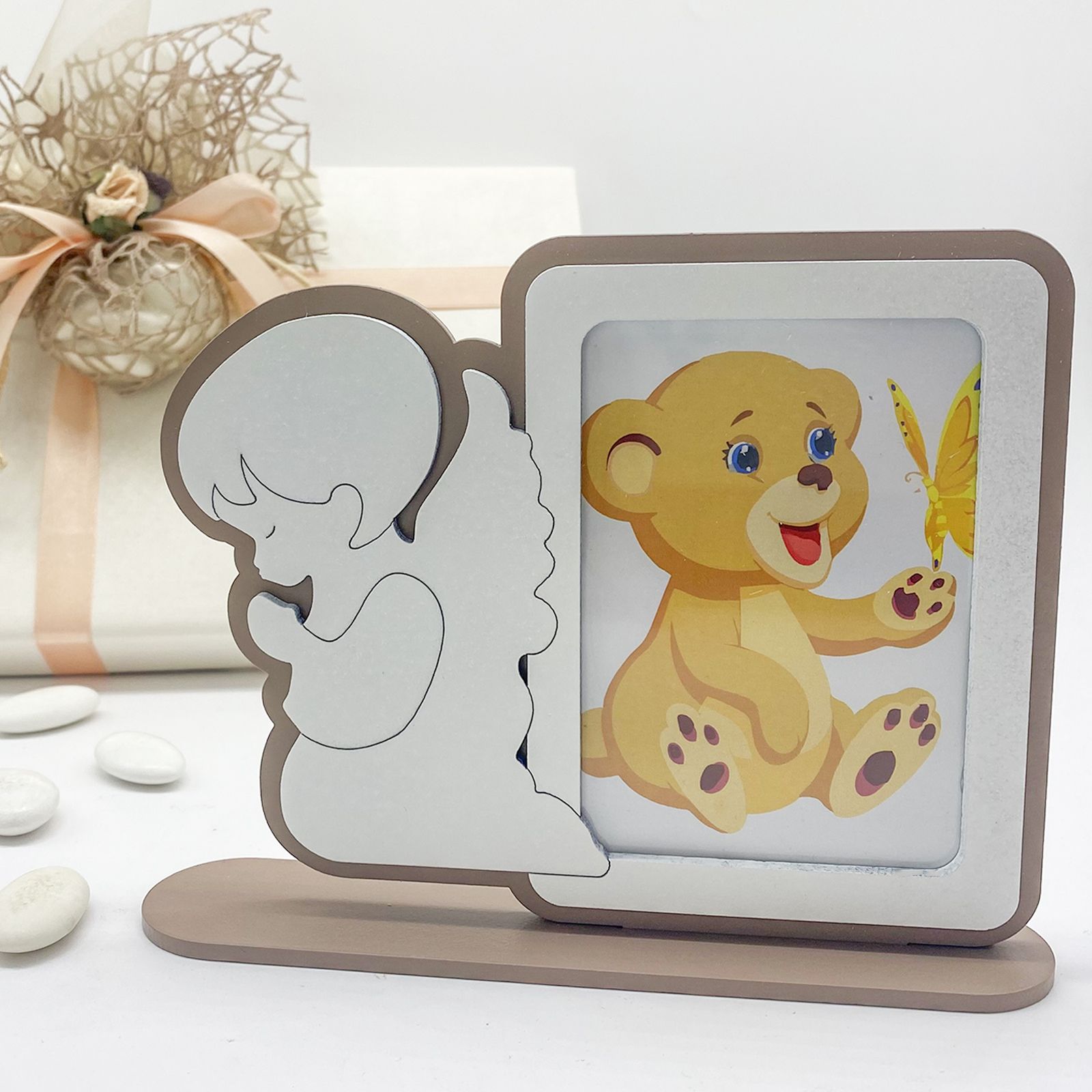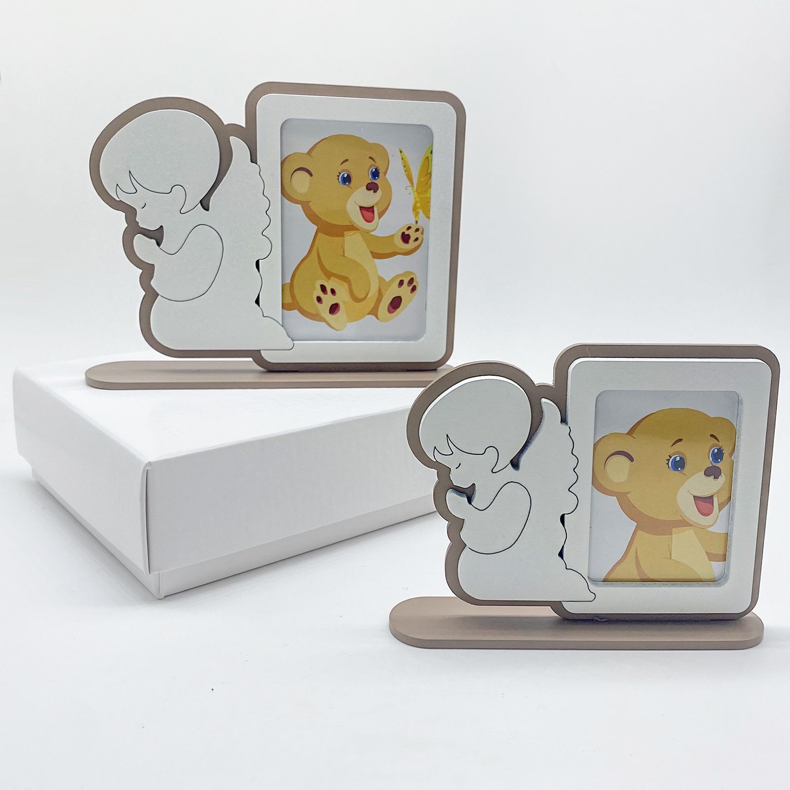 Disponibili per te queste cornici portafoto da tavolo in legno color tortora con dettagli bianchi e sagoma di profilo raffigurante un angioletto bianco in preghiera. L'immagine all'interno della cornice è puramente decorativa.