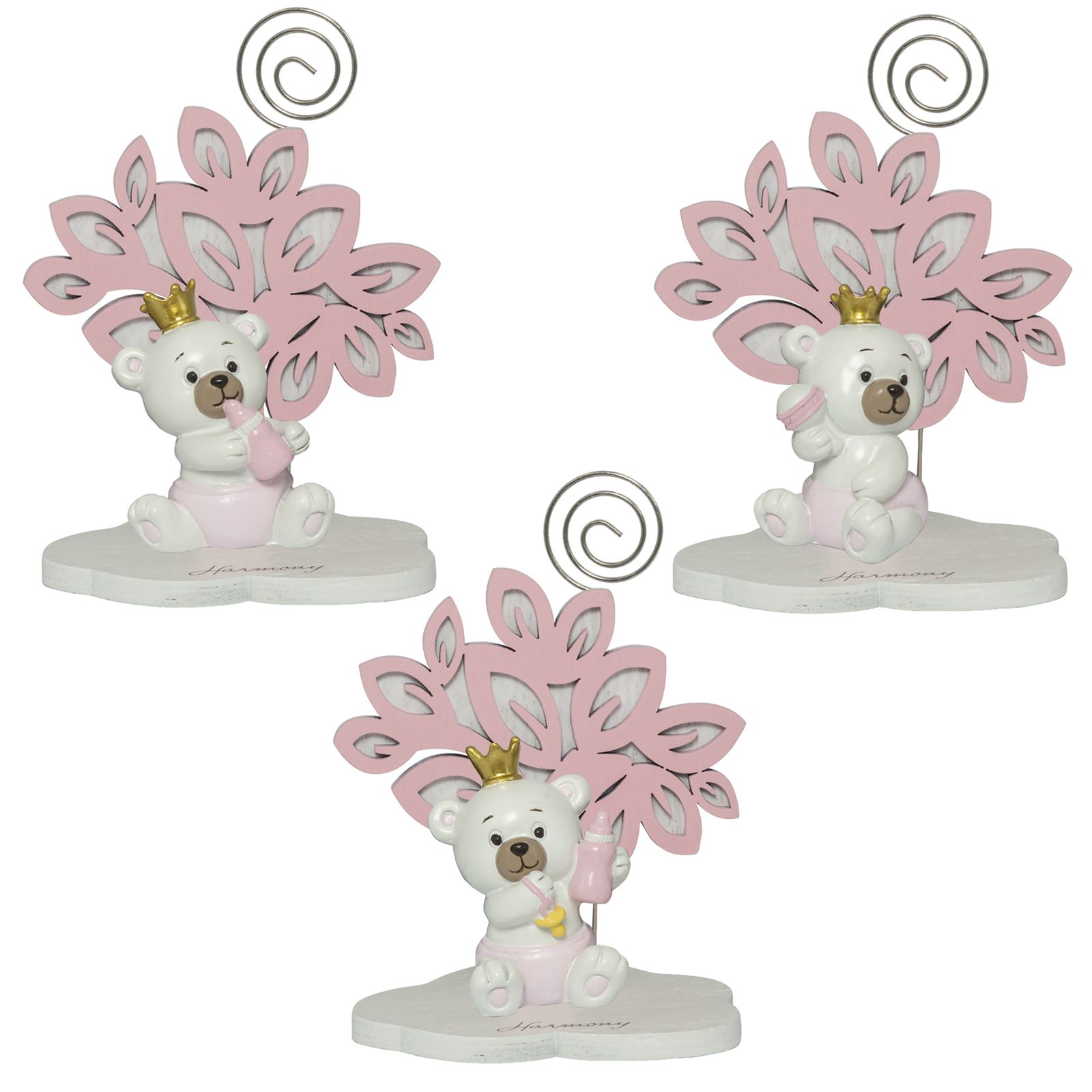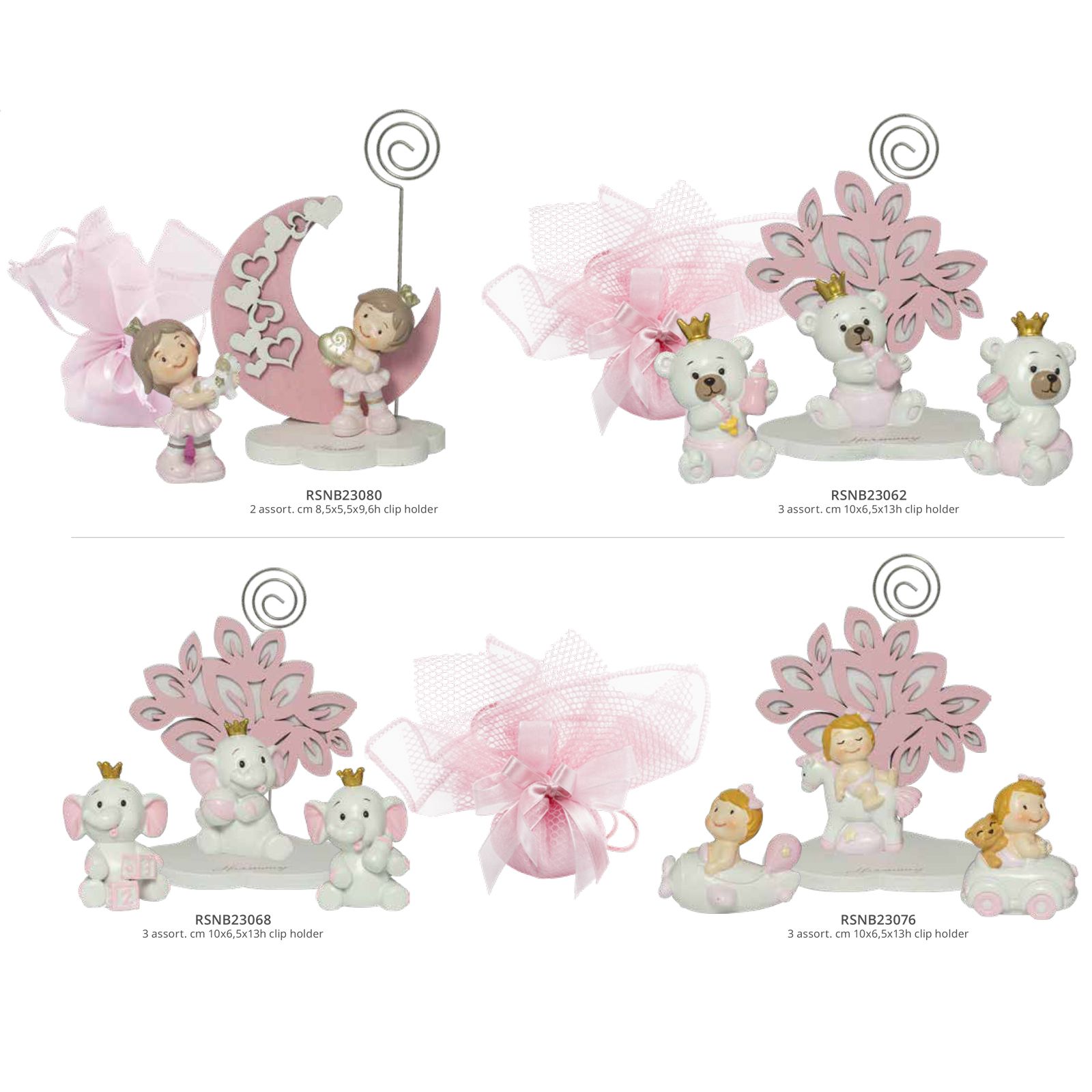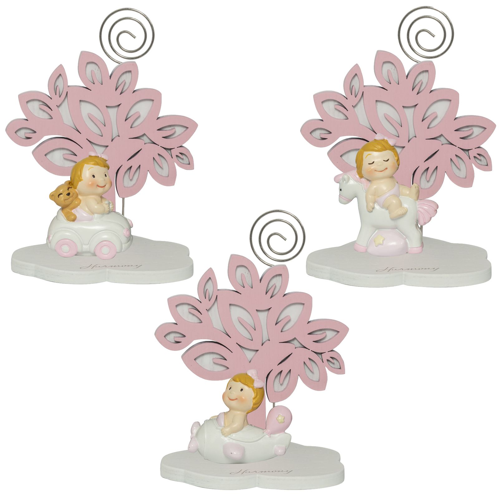 Bomboniere per battesimo composte da statuine in resina colorata con dettagli di colore rosa, con asta spiralata in metallo disponibili con vari modelli che potrai scegliere comodamente dal menù a tendina.