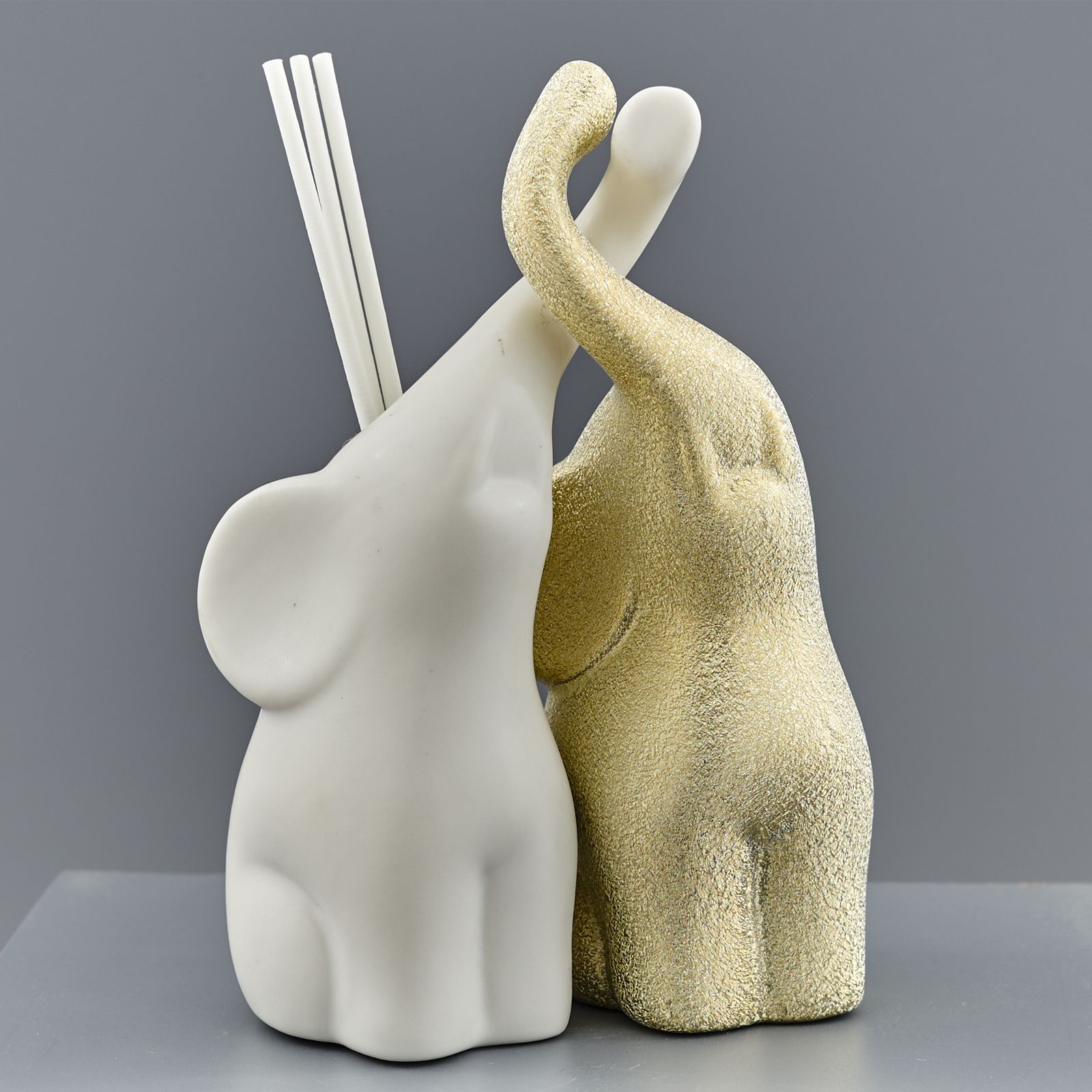 Bomboniere elefante portafortuna con funzione di profumatore per ambienti! Doppio elefante in tonalità bianco e oro, con il foro per l'inserimento della fiala porta profumo posto sul retro.
