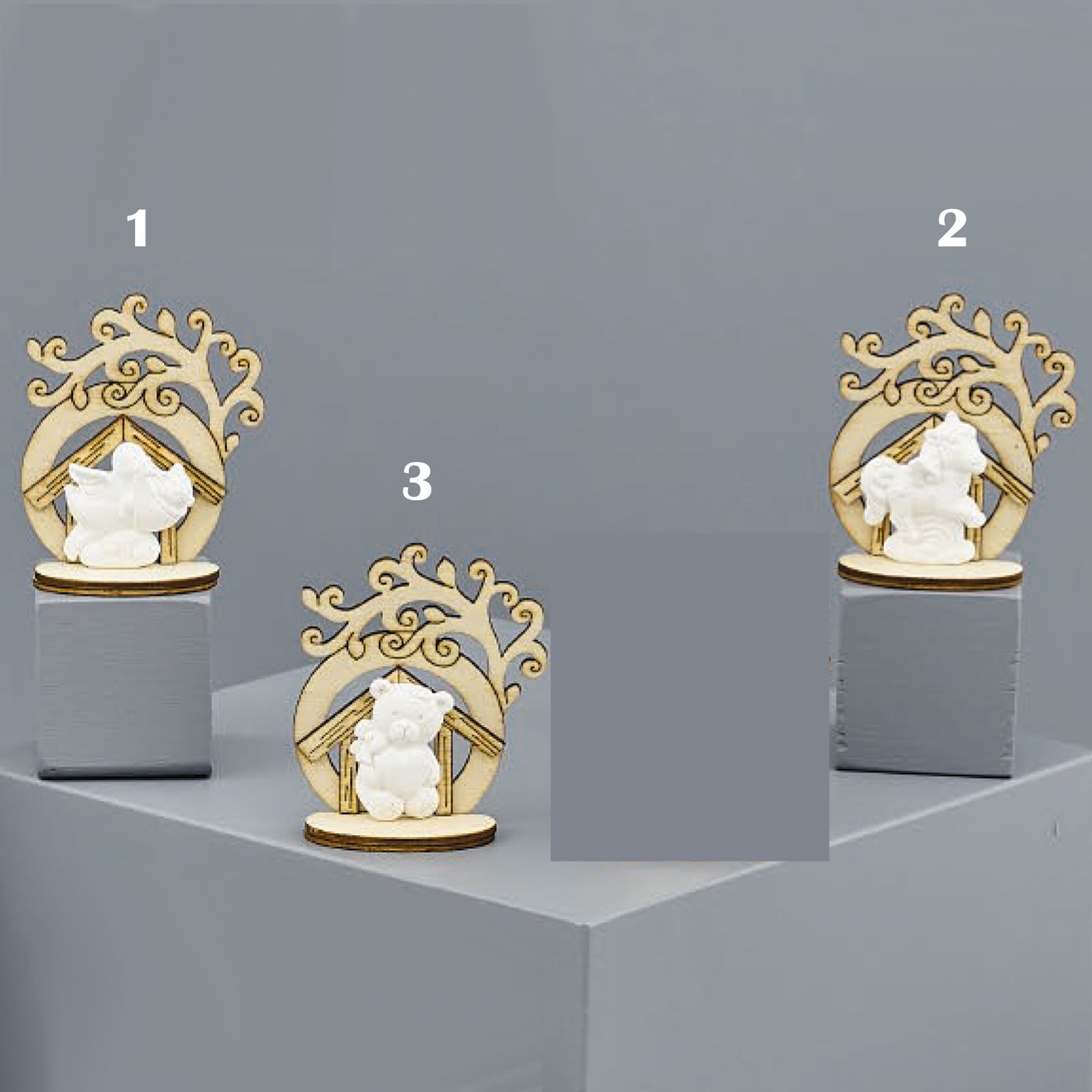 Alberi della vita con casetta in legno su cui sono raffigurati dei gessetti bianchi con soggetto unicorno, cicogna o orsetto, da scegliere come segue: