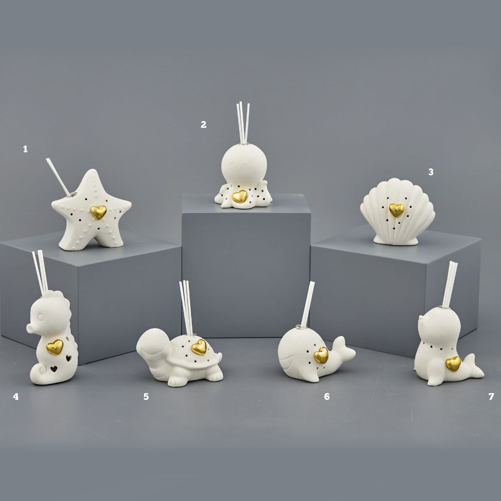 Profumatori per ambienti tema mare originalissimi diffusori di aromi in resina bianca con particolari color oro e luce led interna!