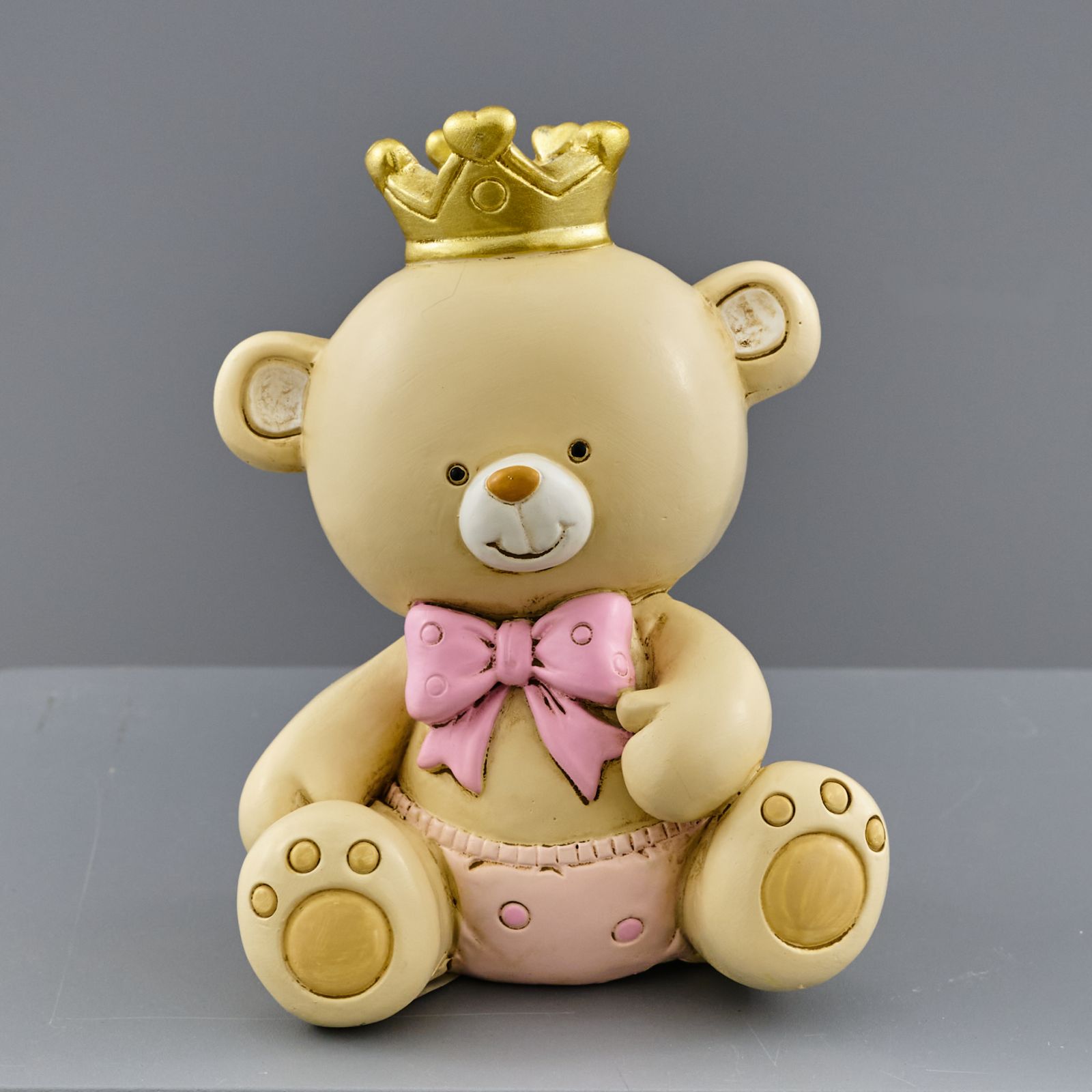 Principesse orsetto salvadanaio in resina, con pannolino e fiocco rosa e corona dorata sul capo. Sul restro è presente la fessura per l'inserimento delle monete.