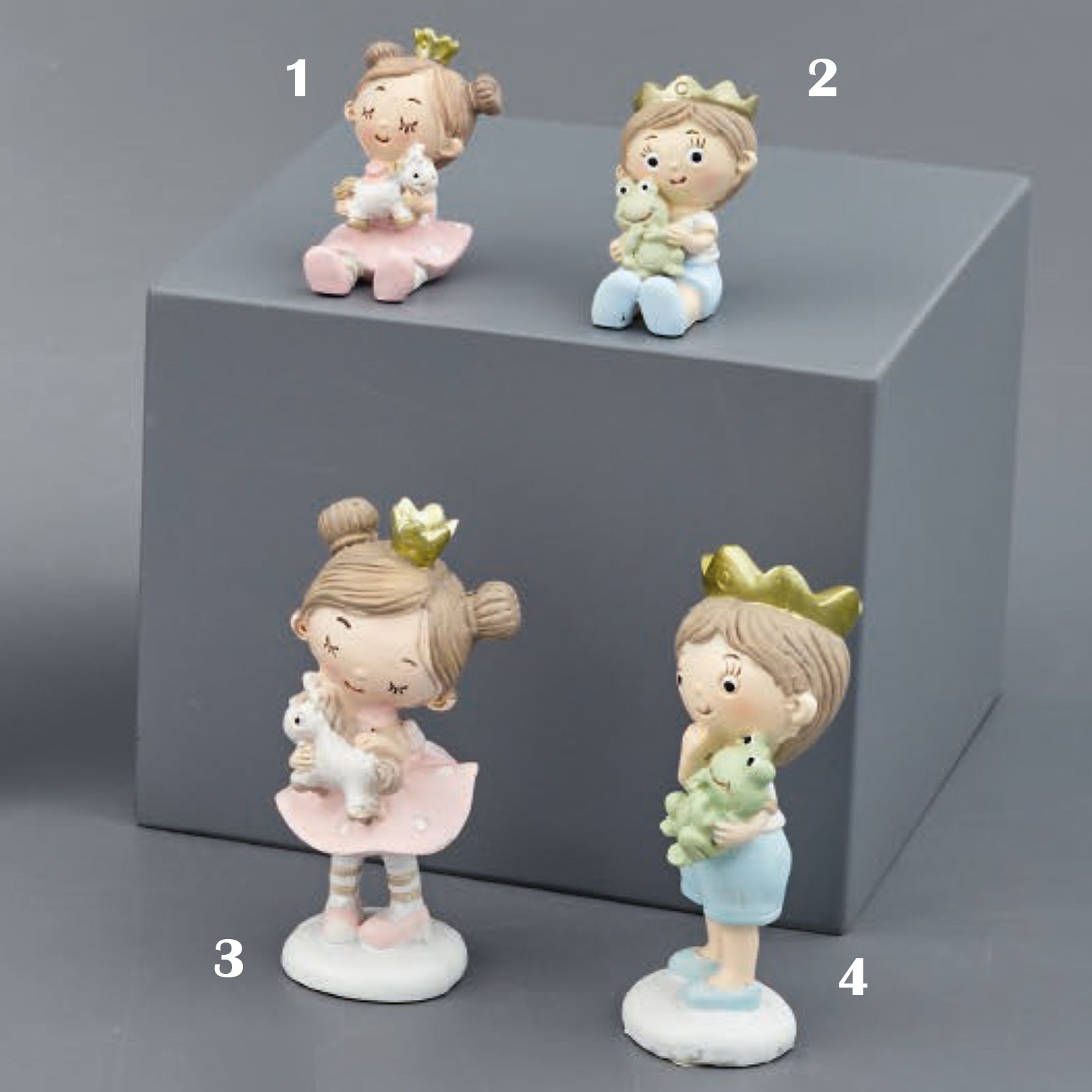 Statuine in resina raffiguranti a scelta un principe con ranocchio o una principessa con unicorno, entrambi raffigurati con corona dorata e disponibili in due dimensioni differenti.