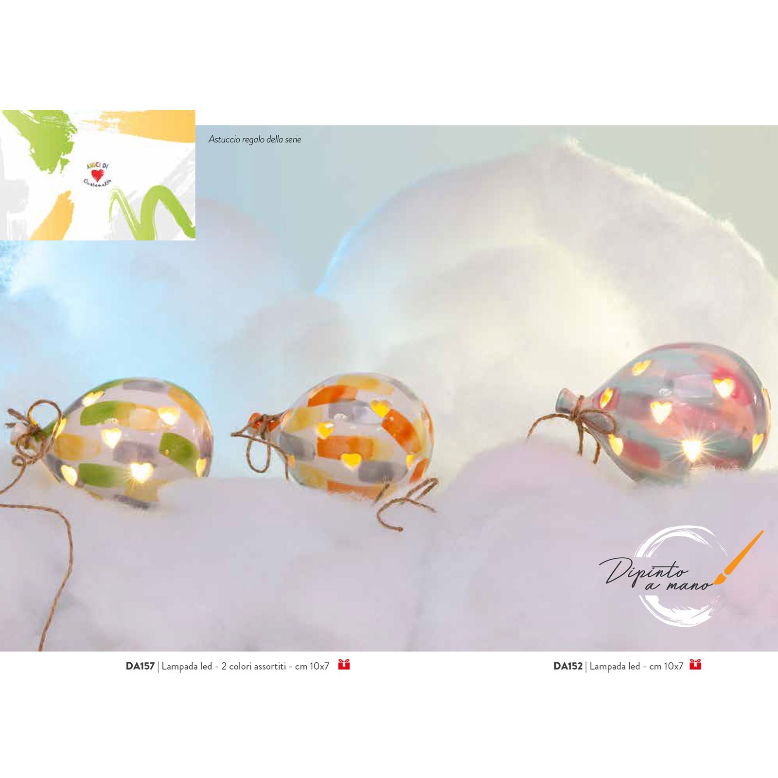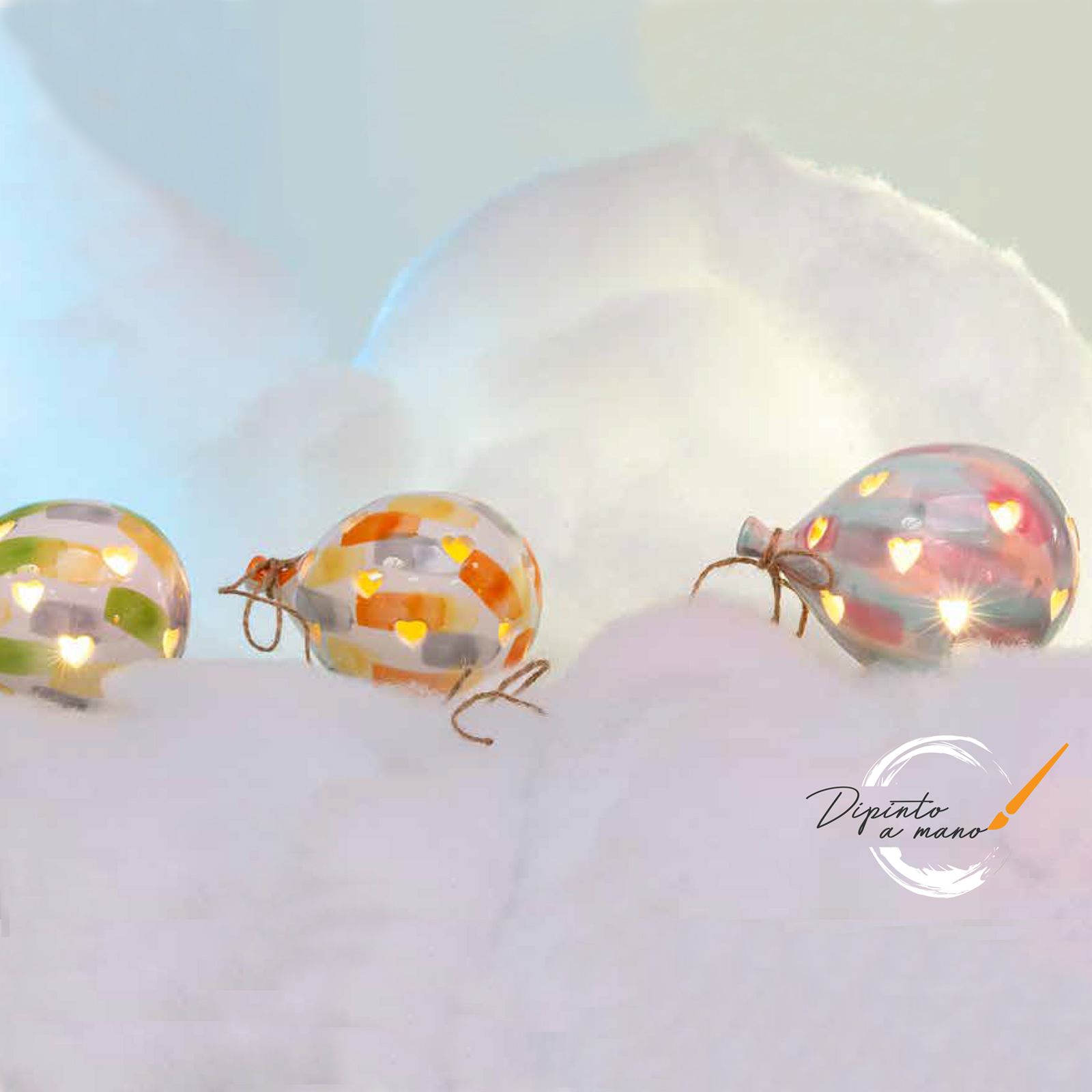 Palloncini bomboniere in ceramica, delicatamente dipinti a mano, provvisti di luce led che filtra dai fori a forma di cuore. Completi di fiocco in corda.