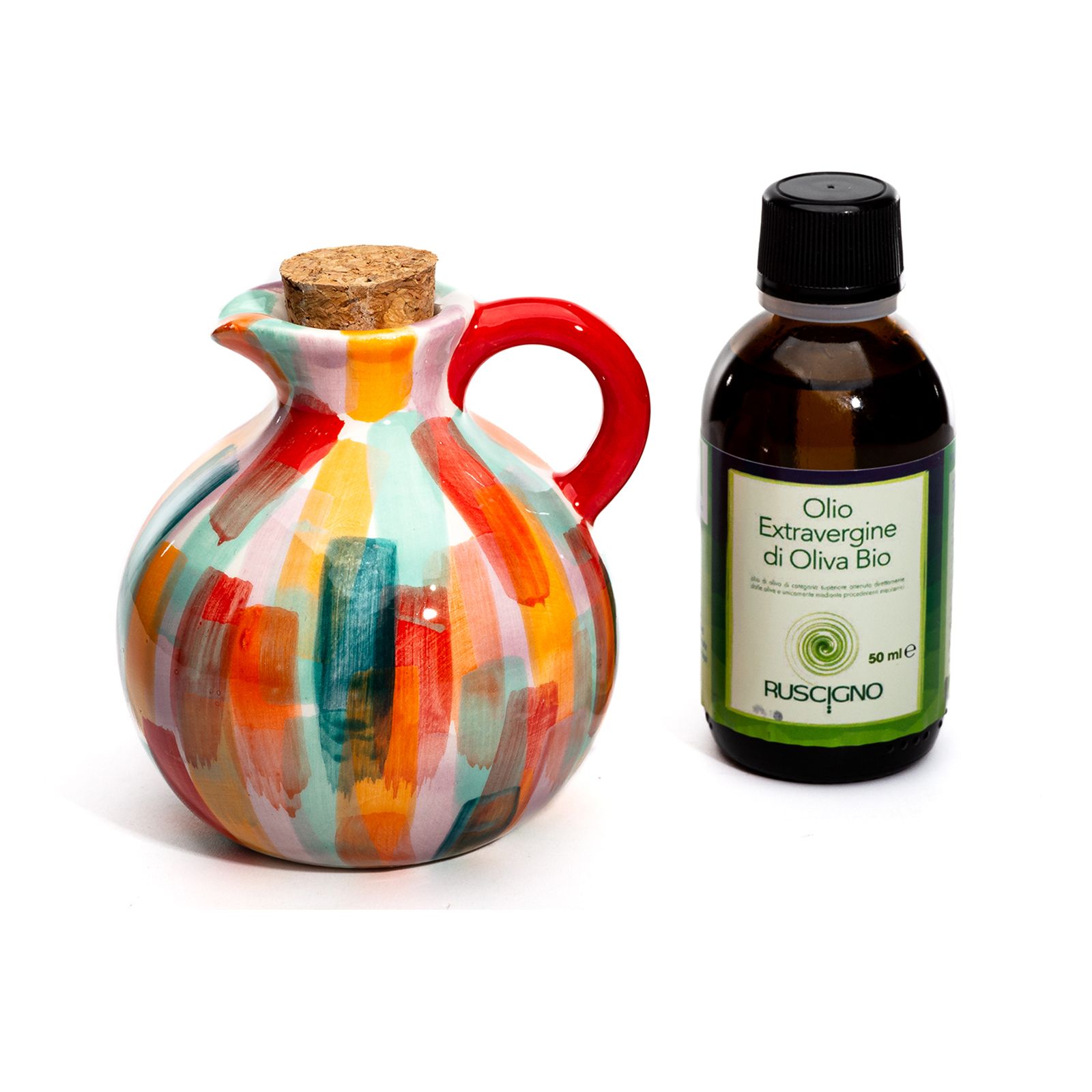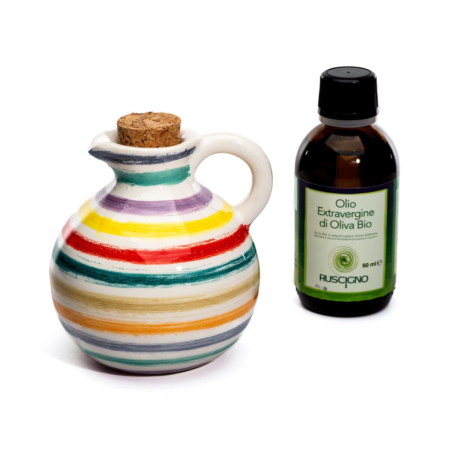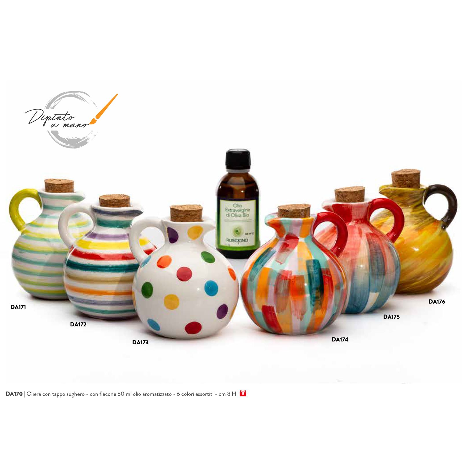 Acquista le nostre oliere palla in ceramica della linea Amici di Cuorematto, con tappo in sughero e flaconcino da 50 ml di olio d'oliva extravergine biologico del frantoio Ruscigno.