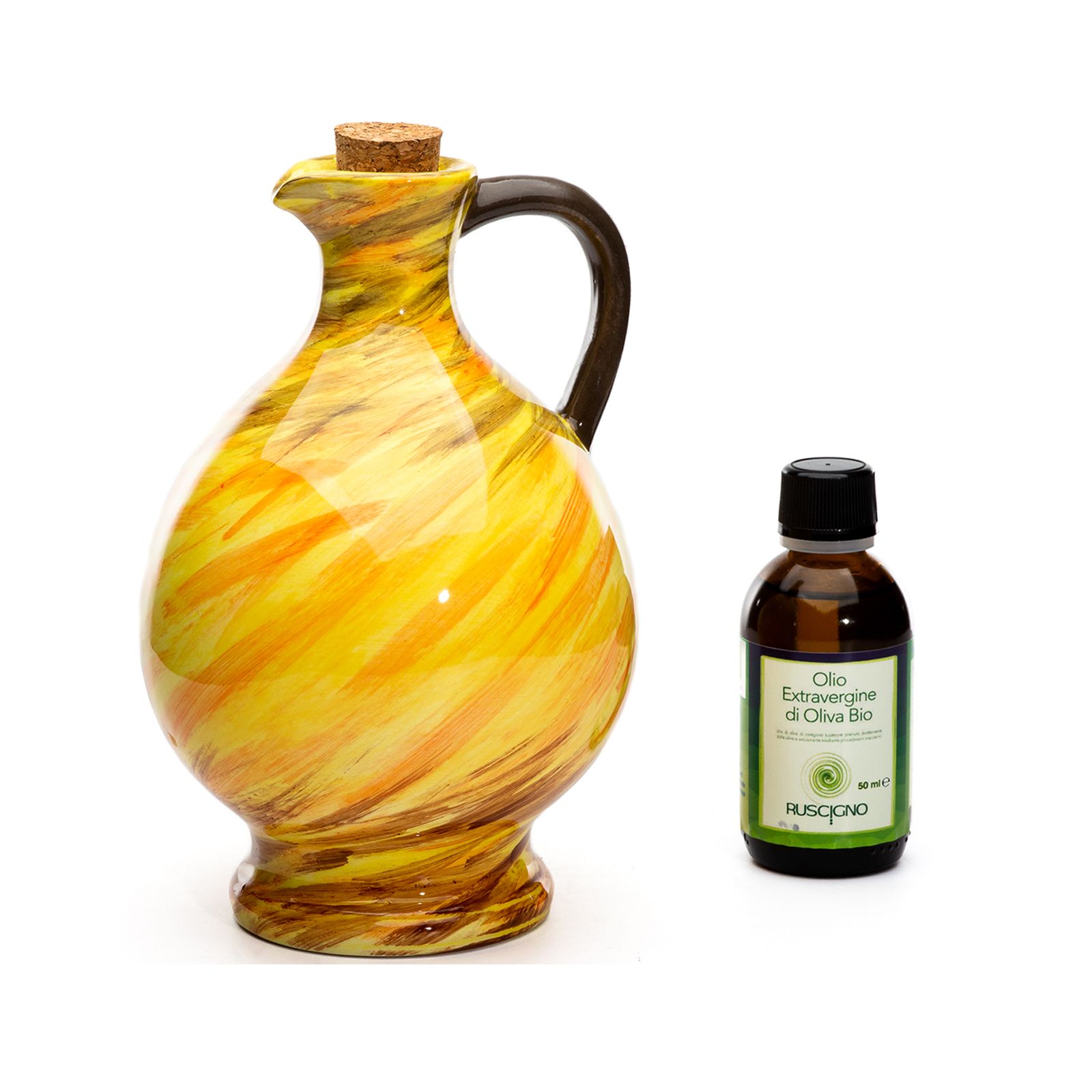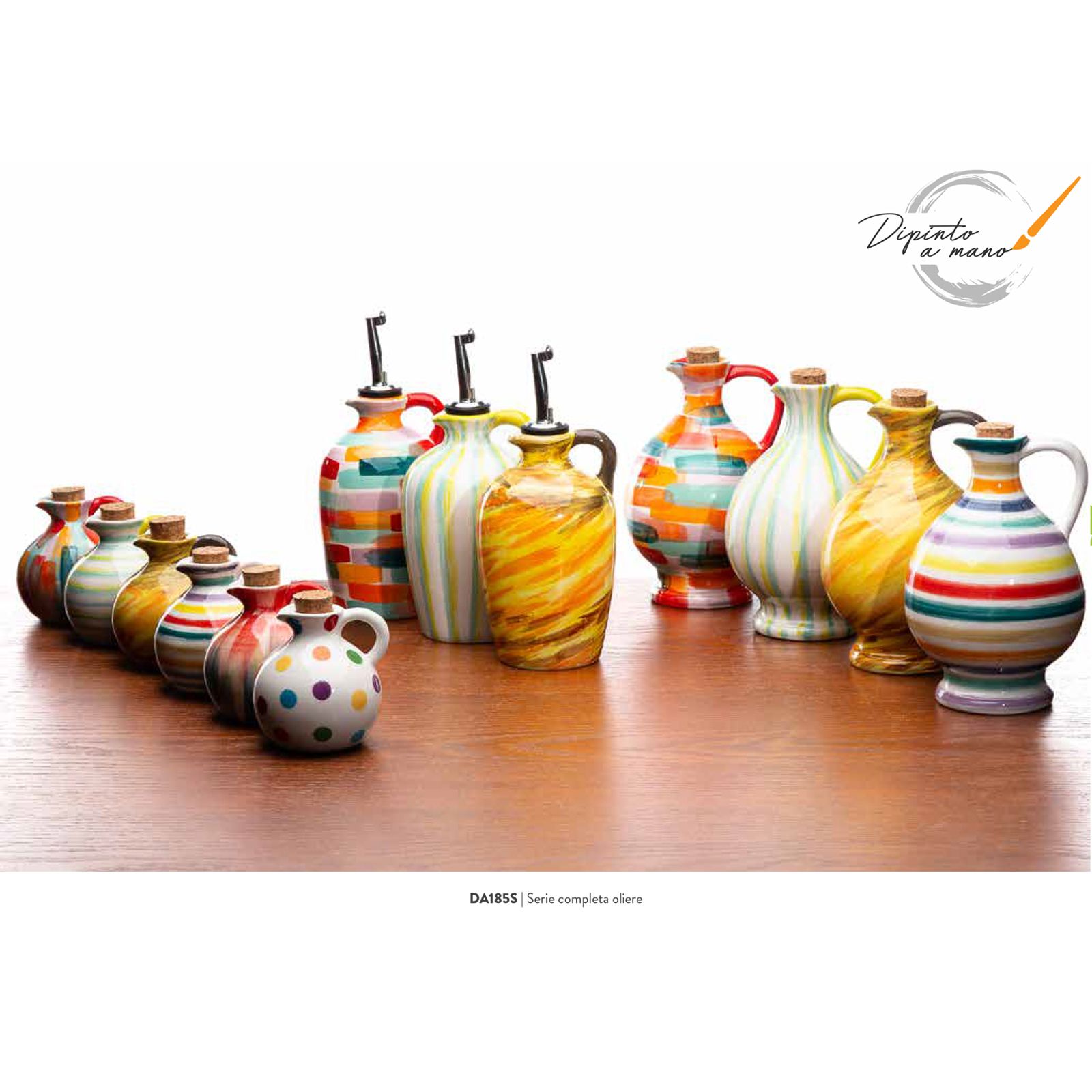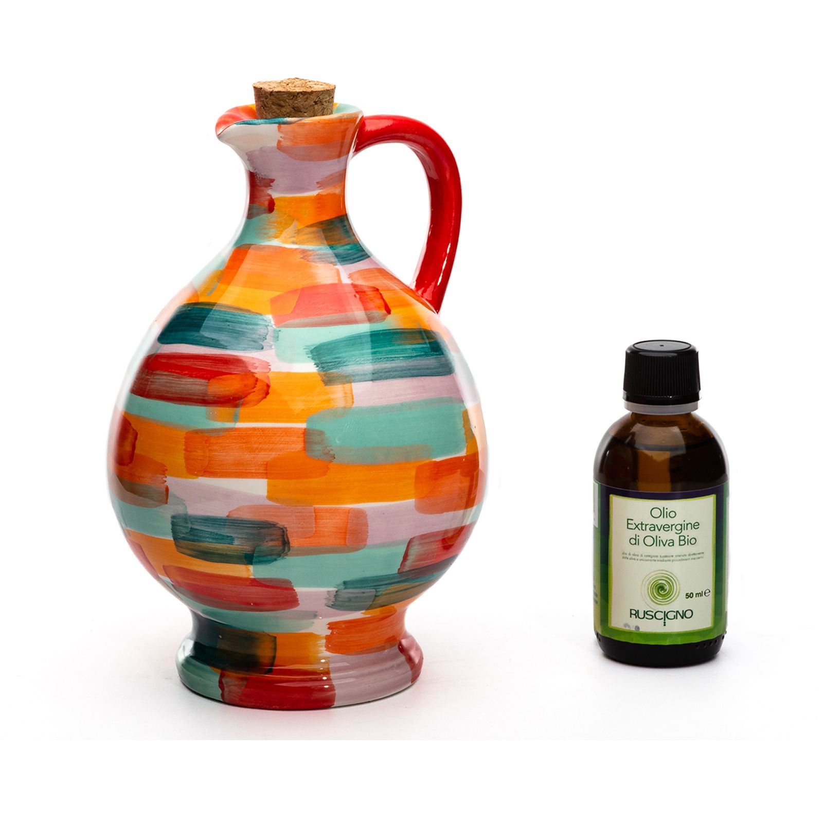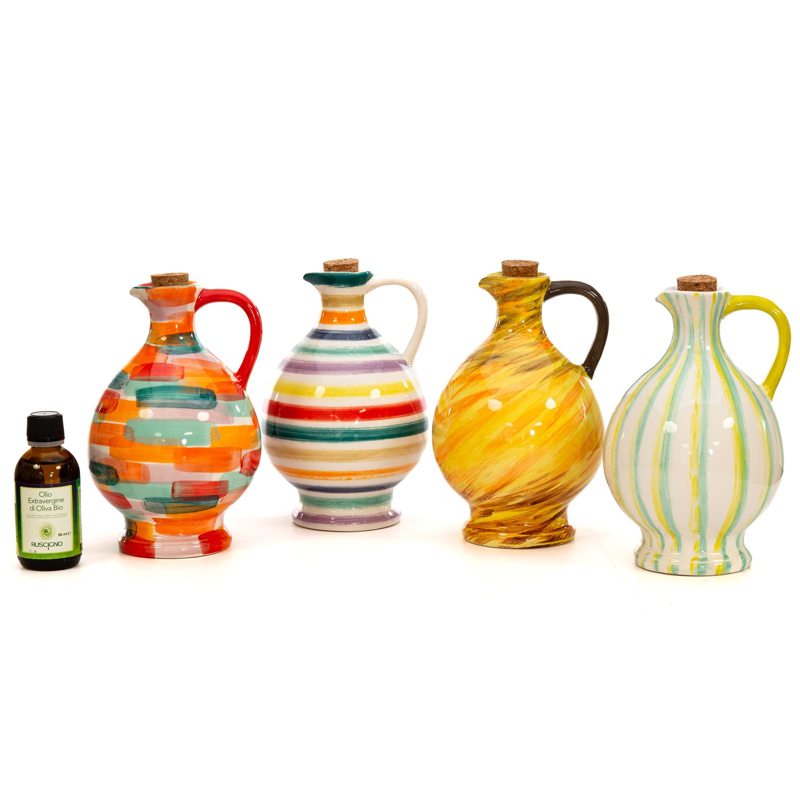 Per le tue bomboniere originali matrimonio scegli le nostre anfore oliere in ceramica decorate, della linea Amici di Cuorematto, con tappo in sughero e flaconcino da 50 ml di olio d'oliva extravergine biologico del frantoio Ruscigno.