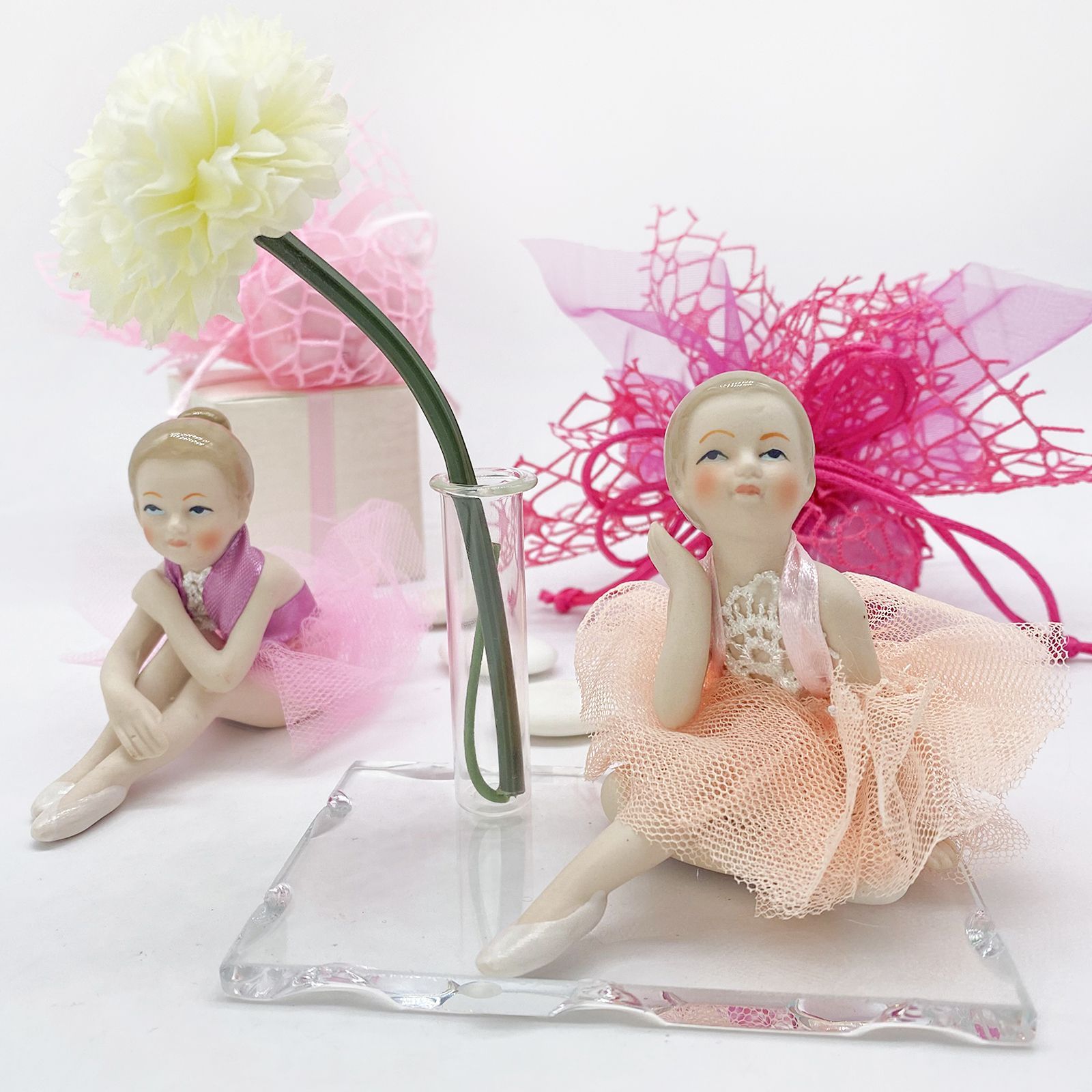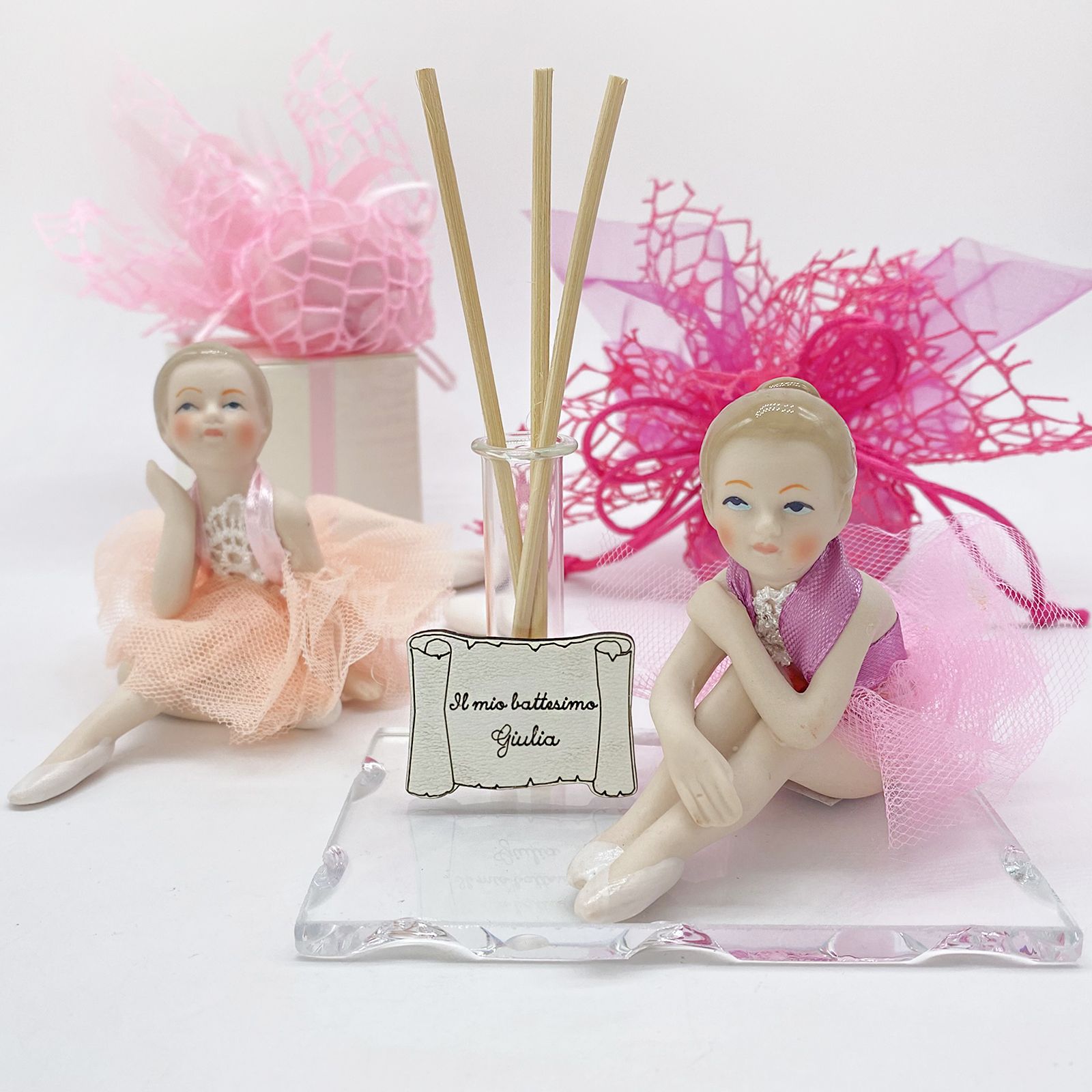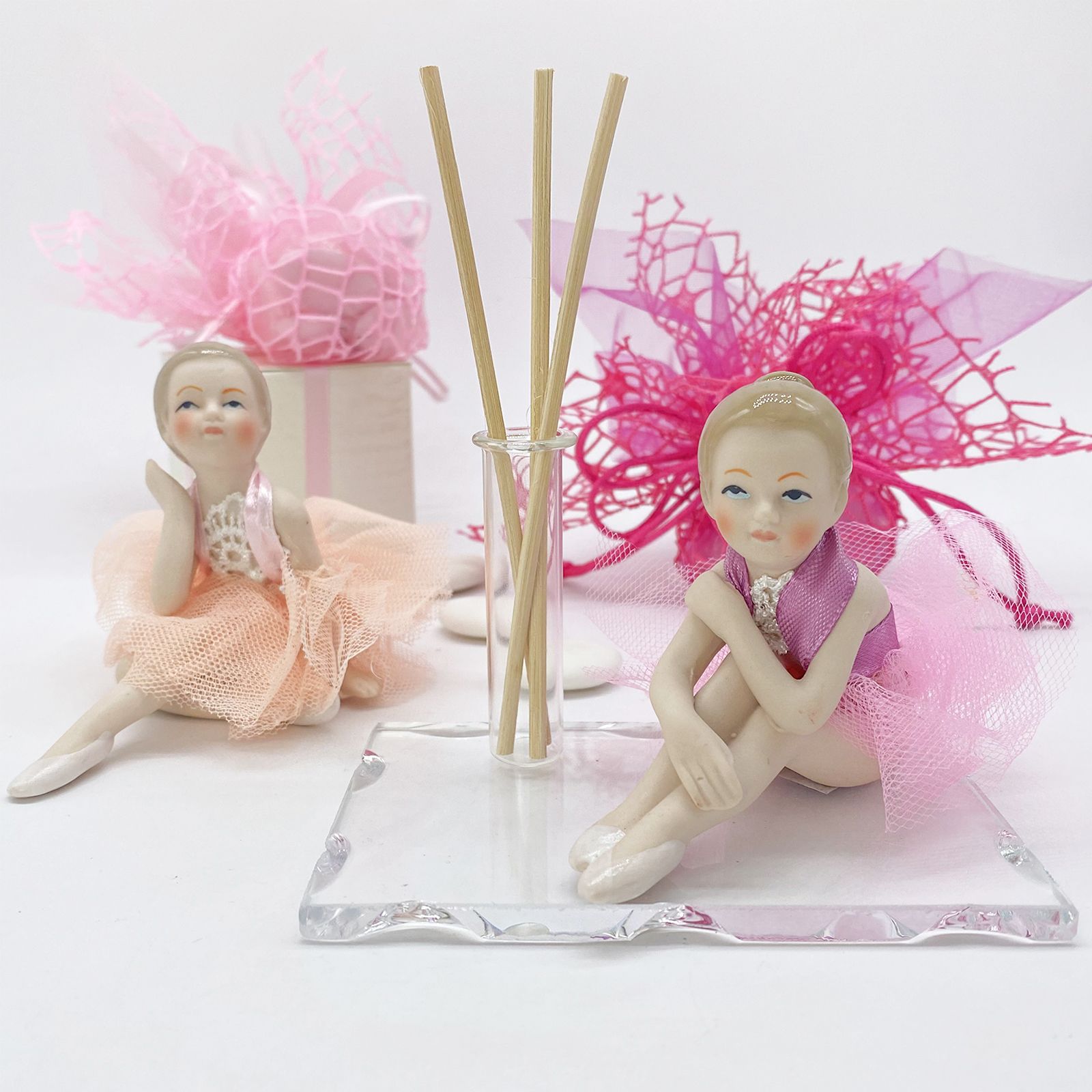 Il profumatore è composto da una base in vetro intagliato che conferisce un tocco di raffinatezza e un'ampolla provetta utile come porta profumo, consentendoti di diffondere una fragranza piacevole e delicata nell'ambiente circostante. Ma la vera protagonista di questa bomboniera è la ballerina in resina con un grazioso tutu realizzato in microrete. Le ballerine sedute, con i loro vestiti colorati di rosa , rappresentano la grazia e la bellezza dell'arte della danza.