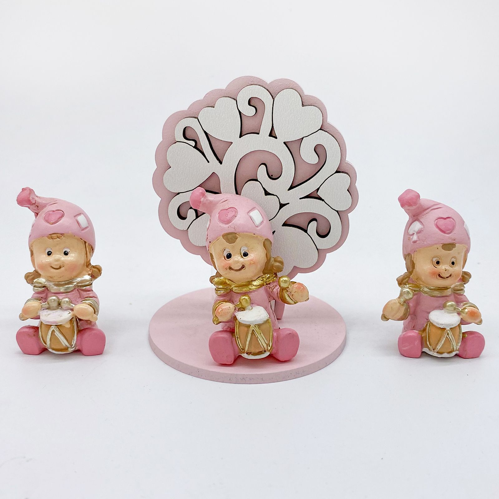La bomboniera include sulla parte frontale una statuina bambina jolly con una graziosa divisa rosa e un cappello adornato da cuoricini e rombi. Realizzata in resina con dettagli in oro, la statuina è unica e speciale, con diverse pose che esprimono vivacità e spontaneità. È un simbolo di dolcezza e allegria che porterà un sorriso a tutti i presenti.