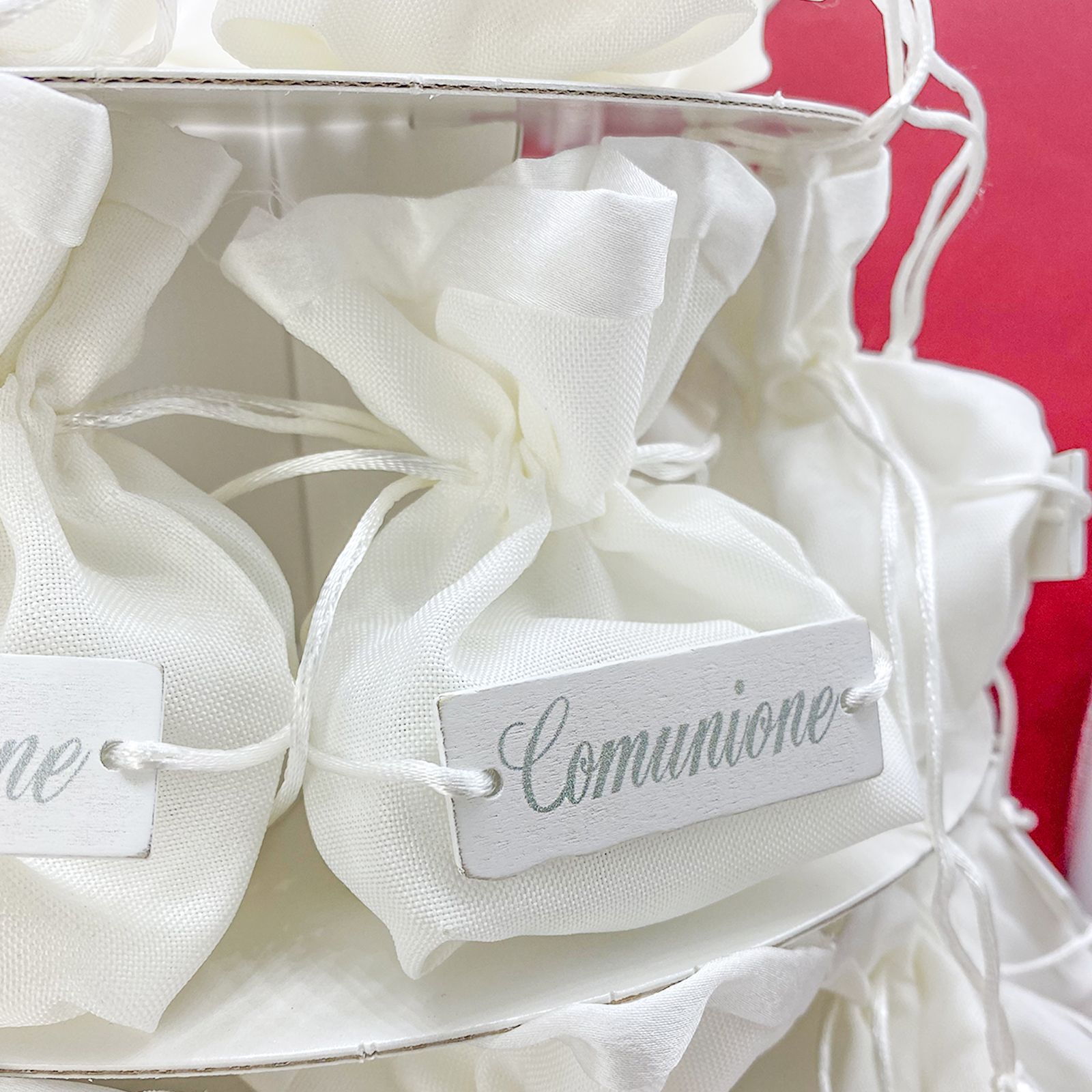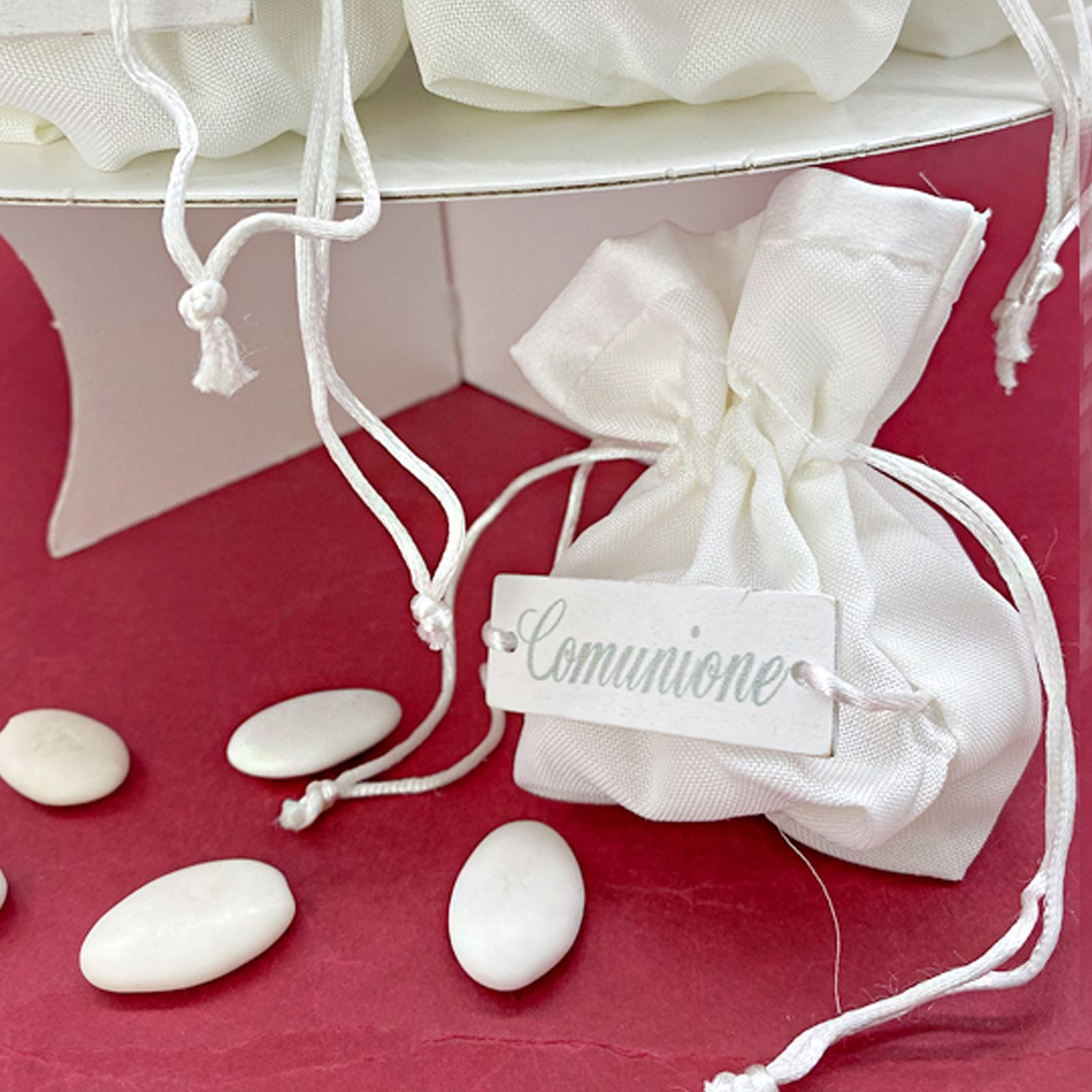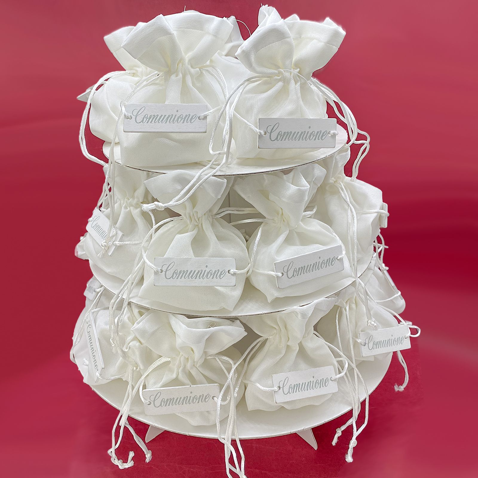 Celebra un momento speciale con la bomboniera alzata in cartone con sacchettini porta confetti in cotone bianco, perfetta per la Comunione. L'alzatina è realizzata in cartone bianco di alta qualità, i sacchettini porta confetti, realizzati in cotone bianco dalla forma rotonda, sono il complemento ideale per creare un'atmosfera di dolcezza e gioia. La parte superiore dei sacchettini è impreziosita da raso bianco, che conferisce un tocco di classe al regalo. La targhetta in legno sulla parte centrale reca incisa la parola "COMUNIONE" e un grazioso cordoncino decorativo completa splendidamente l'aspetto complessivo della bomboniera.