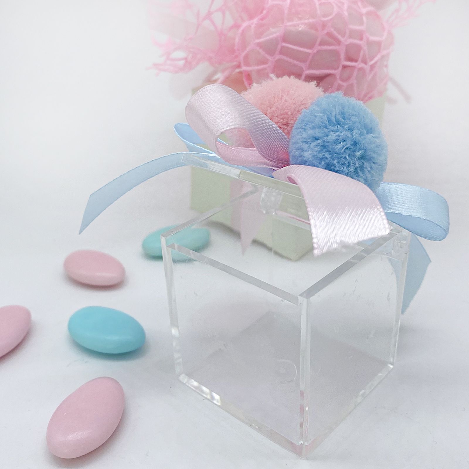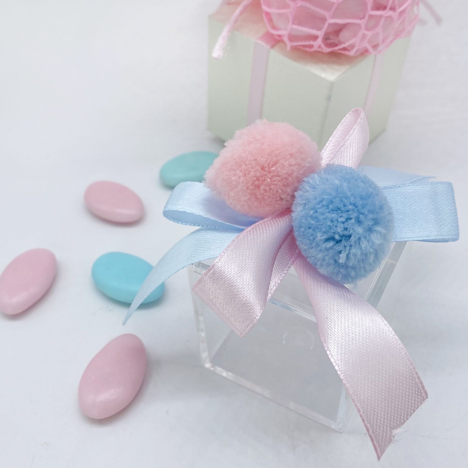 Le scatole, realizzate in plexiglass, incarnano la delicatezza e la purezza che caratterizzano un evento così gioioso come la nascita dei gemellini, il battesimo o compleanno. Le decorazioni non passano inosservate: le piccole palline pon pon in peluche, realizzate in materiale acrilico, aggiungono un tocco di morbidezza e gioia alle scatole, invitando al tatto e al sorriso.