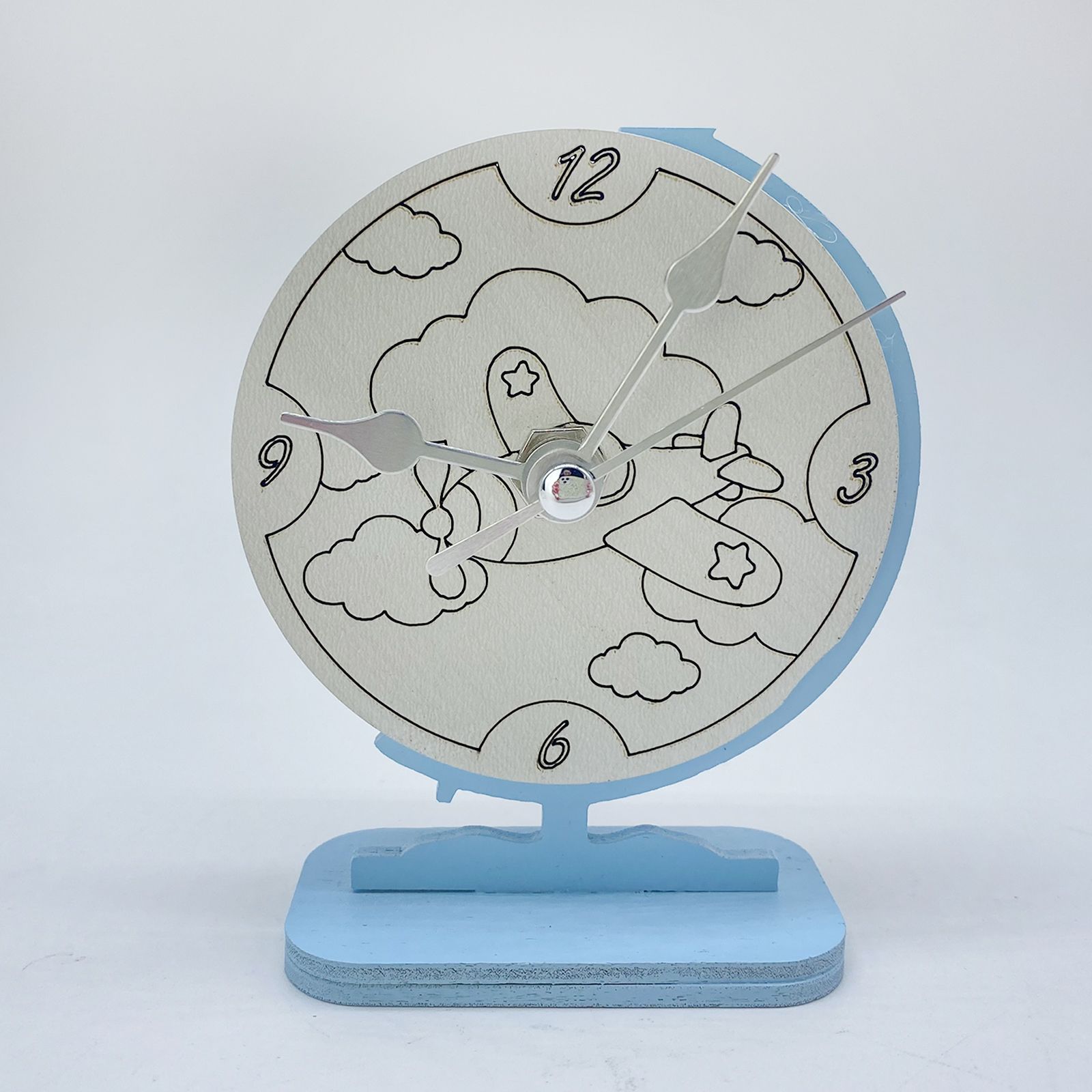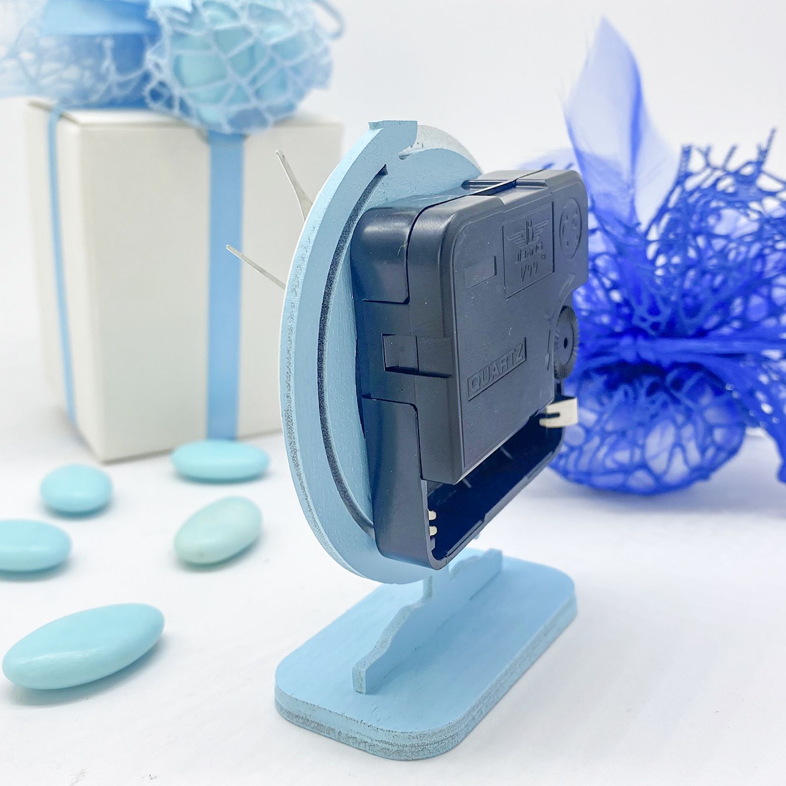 La base e la struttura in un delicato colore celeste si distinguono per un raffinato effetto doppiato con sovrapposizione in rilievo in una tonalità di bianco ottico. Le lancette dell'orologio sono realizzate in metallo, e il suo funzionamento è alimentato da una batteria AA da 1,5 volt (non inclusa).