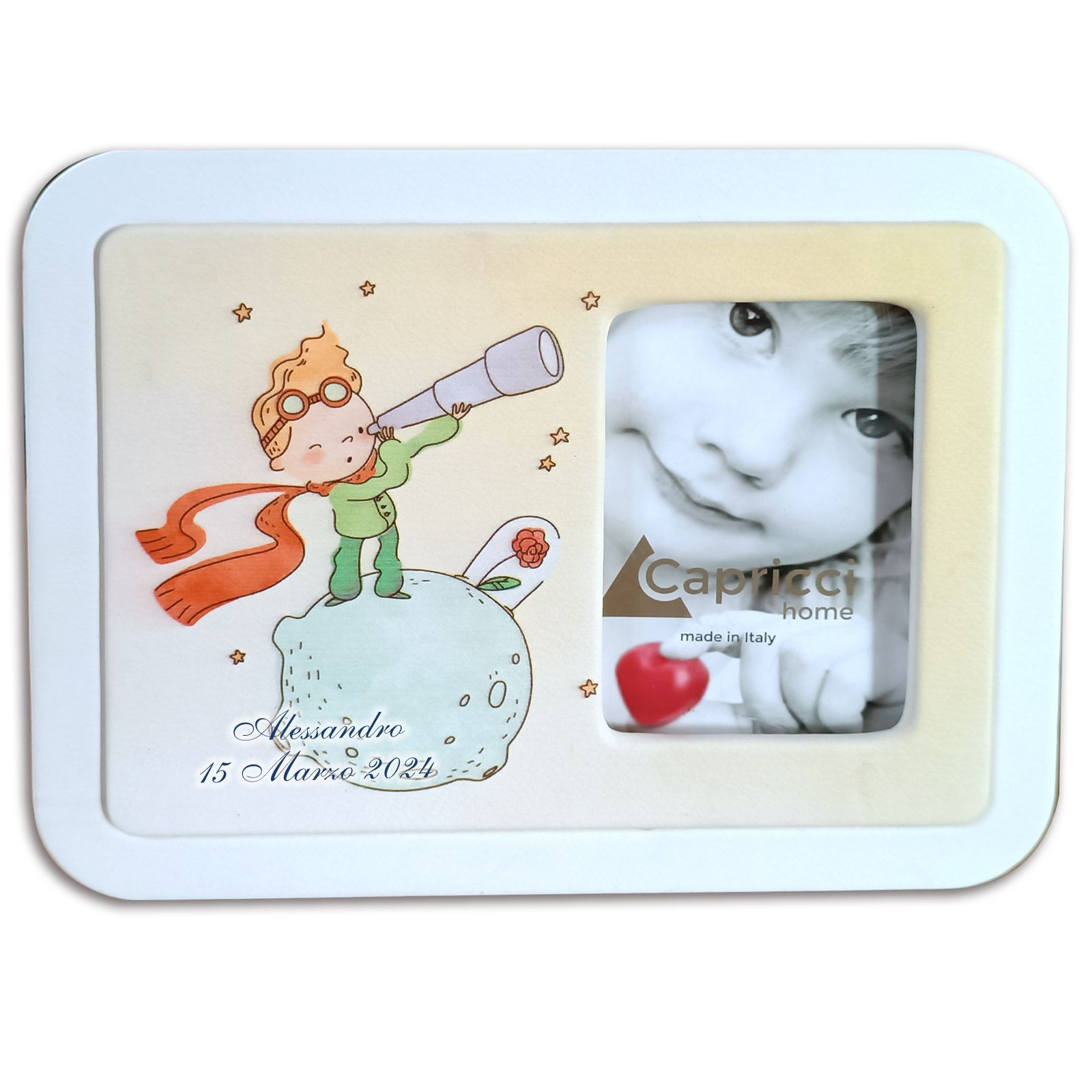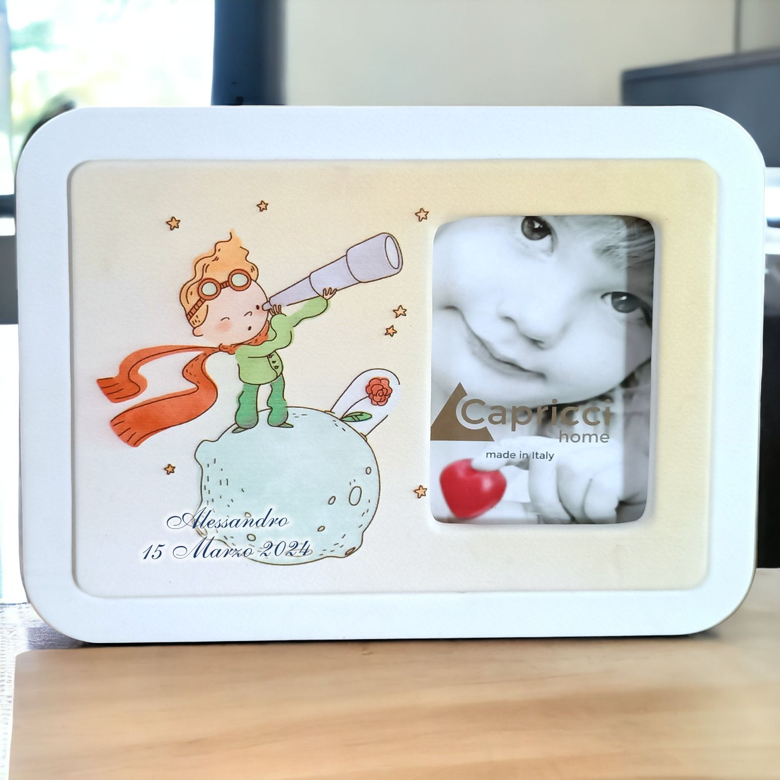 Realizzata con cura in Italia, questa cornice porta foto con il Piccolo Principe è un ricordo che durerà nel tempo. Con il doppio strato di legno rivestito di ecopelle, questa bomboniera è un omaggio all'eterno fascino del Piccolo Principe. La possibilità di personalizzare con i nomi e la data dell'evento, stampati sul lato con il Piccolo Principe, la sua rosa e il cannocchiale, aggiunge un tocco personale. Non solo per comunioni, è perfetta anche per battesimi e altri eventi speciali dedicati ai più piccoli.