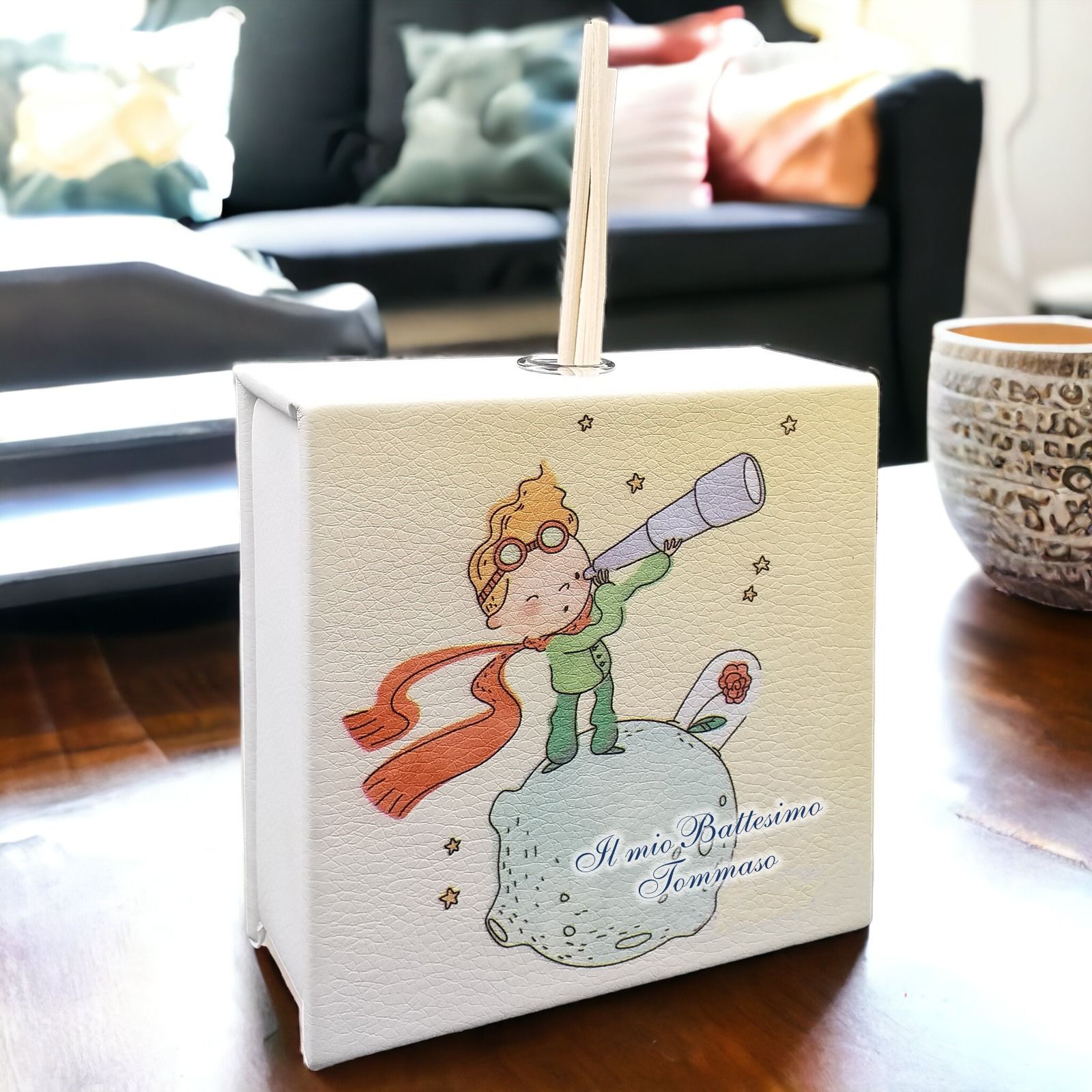 Realizzato con orgoglio in Italia, questo diffusore porta essenze con il tema del Piccolo Principe è un omaggio incantevole. Con una base in legno rivestito di ecopelle decorata con il Piccolo Principe, questo diffusore è personalizzabile con i nomi e la data dell'evento. È perfetto non solo per le comunioni ma anche per i battesimi e per donare un regalo magico ai bambini.