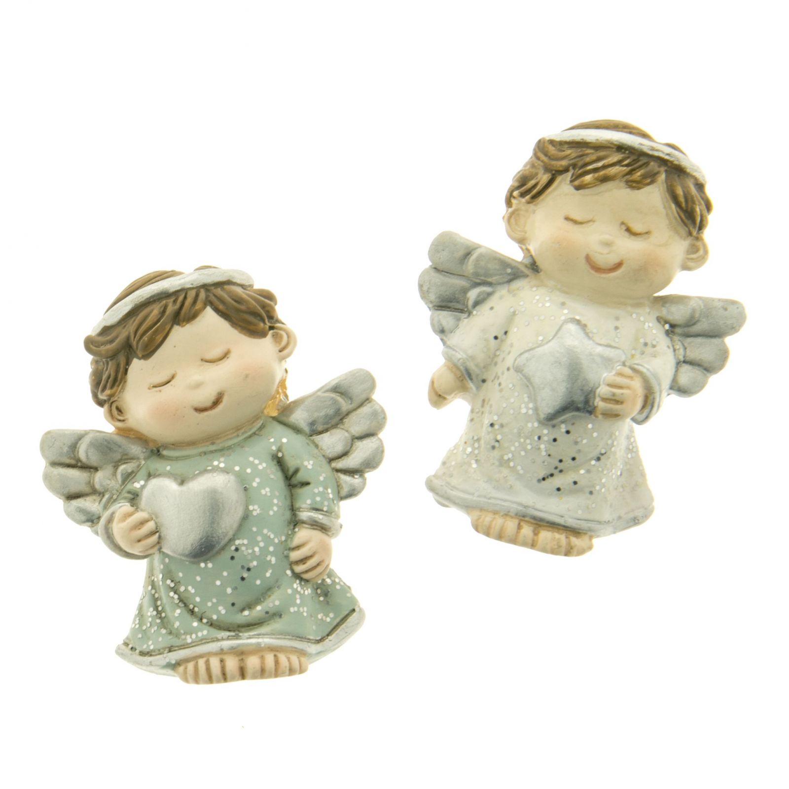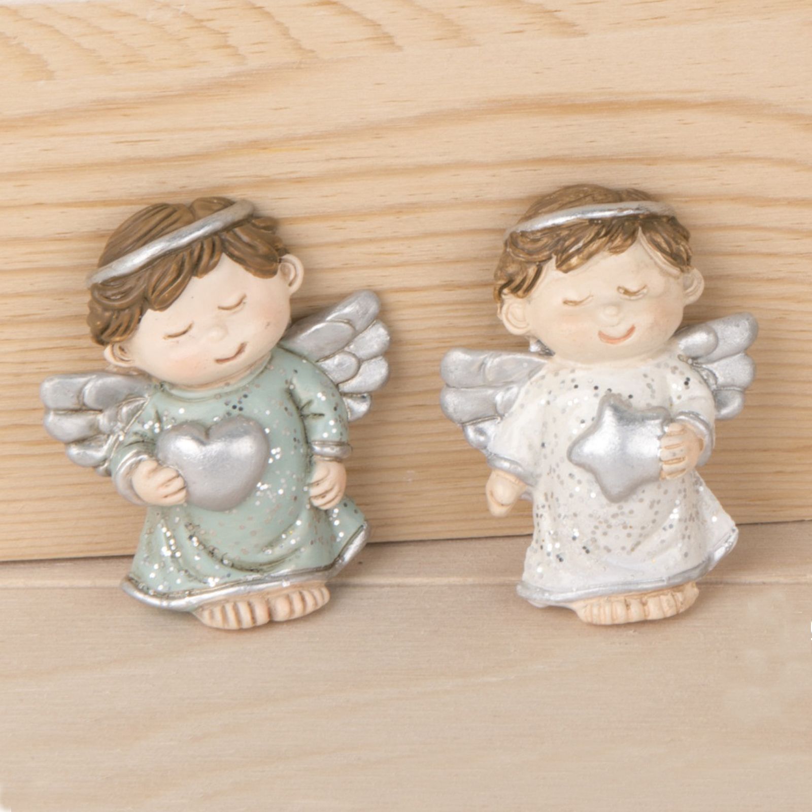 Realizzata in resina argentata, la calamita angioletto con cuoricino misura circa 5 cm di altezza ed è disponibile in due varianti. Il prezzo è riferito ad un singolo prodotto.
