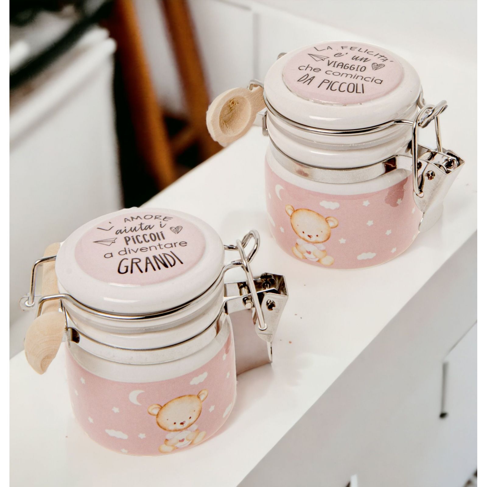 Scopri il Vasetto ermetico bianco e rosa con orsetto e frasi sul coperchio, l'idea perfetta per i più eventi come nascita, battesimo, primo compleanno, baby shower, gender reveal. Con un design unico, questo oggetto ti aiuterà a ricordare i bei momenti condivisi con la tua famiglia e gli amici.