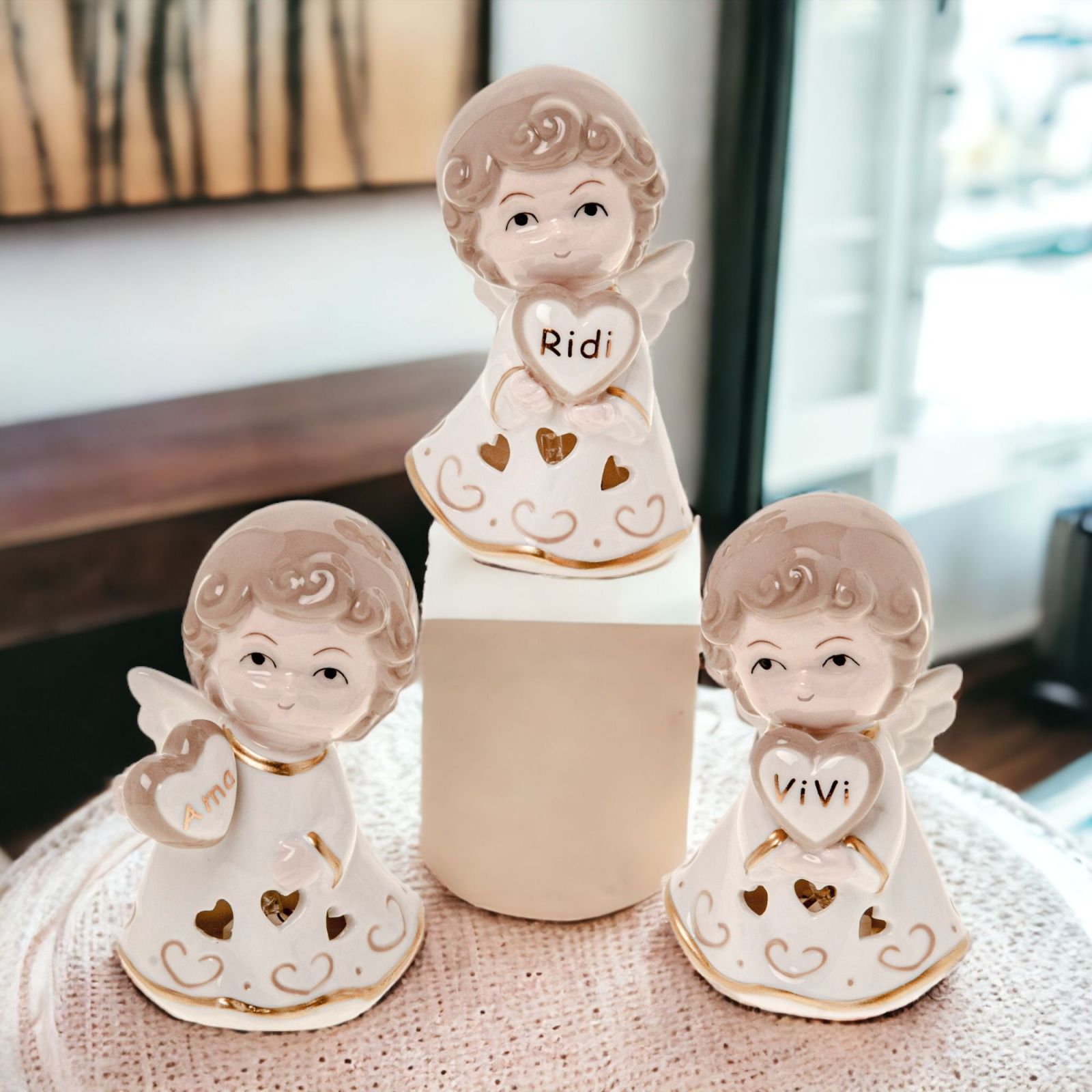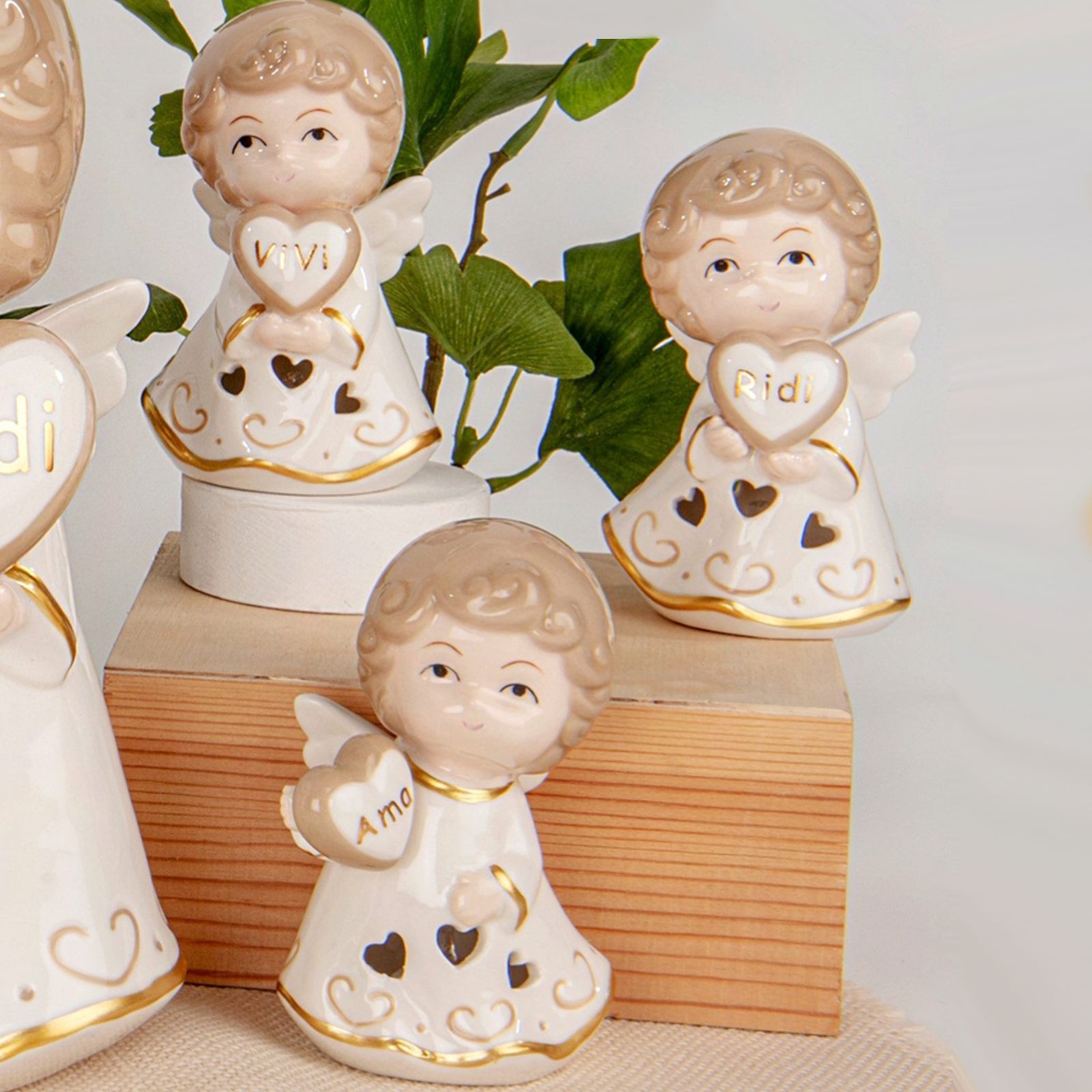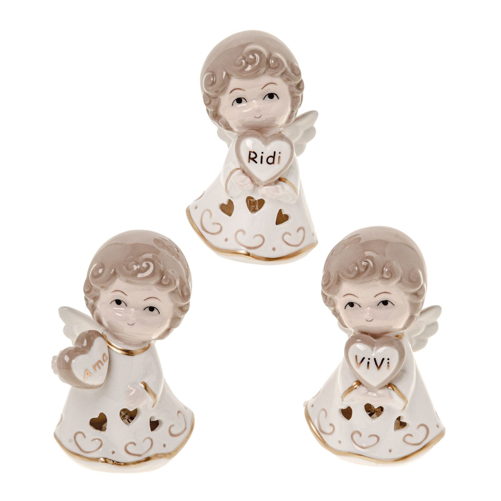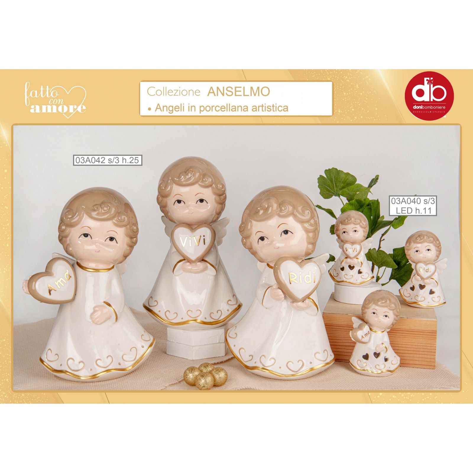 Regala un momento di gioia e protezione con questa speciale Bomboniera Battesimo luce led a forma di Angioletto linea Anselmo Angelo in porcellana artistica assortito in tre varianti con un cuore nelle mani con parole ama, ridi, vivi, trafori a forma di cuori dai quali esce la luce.