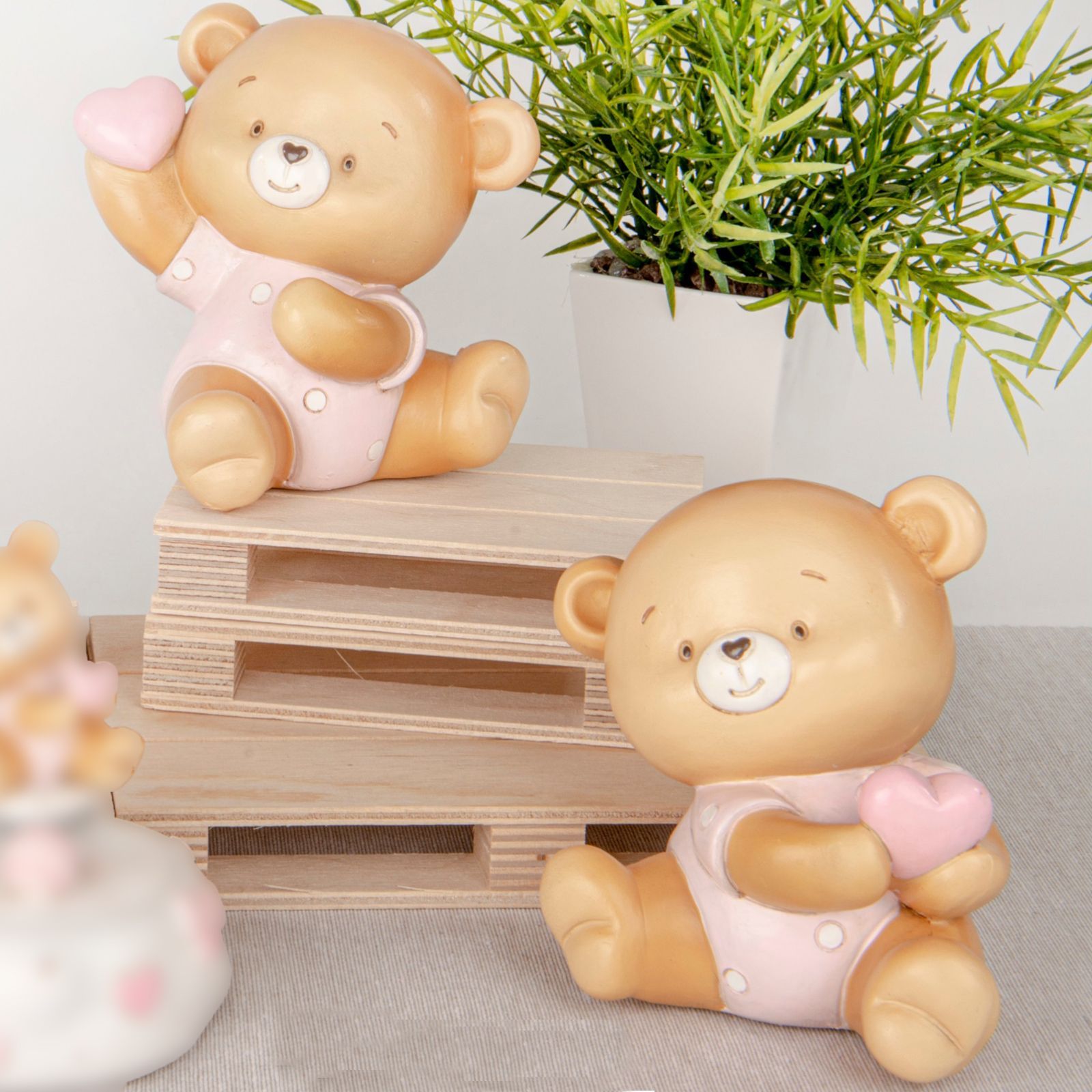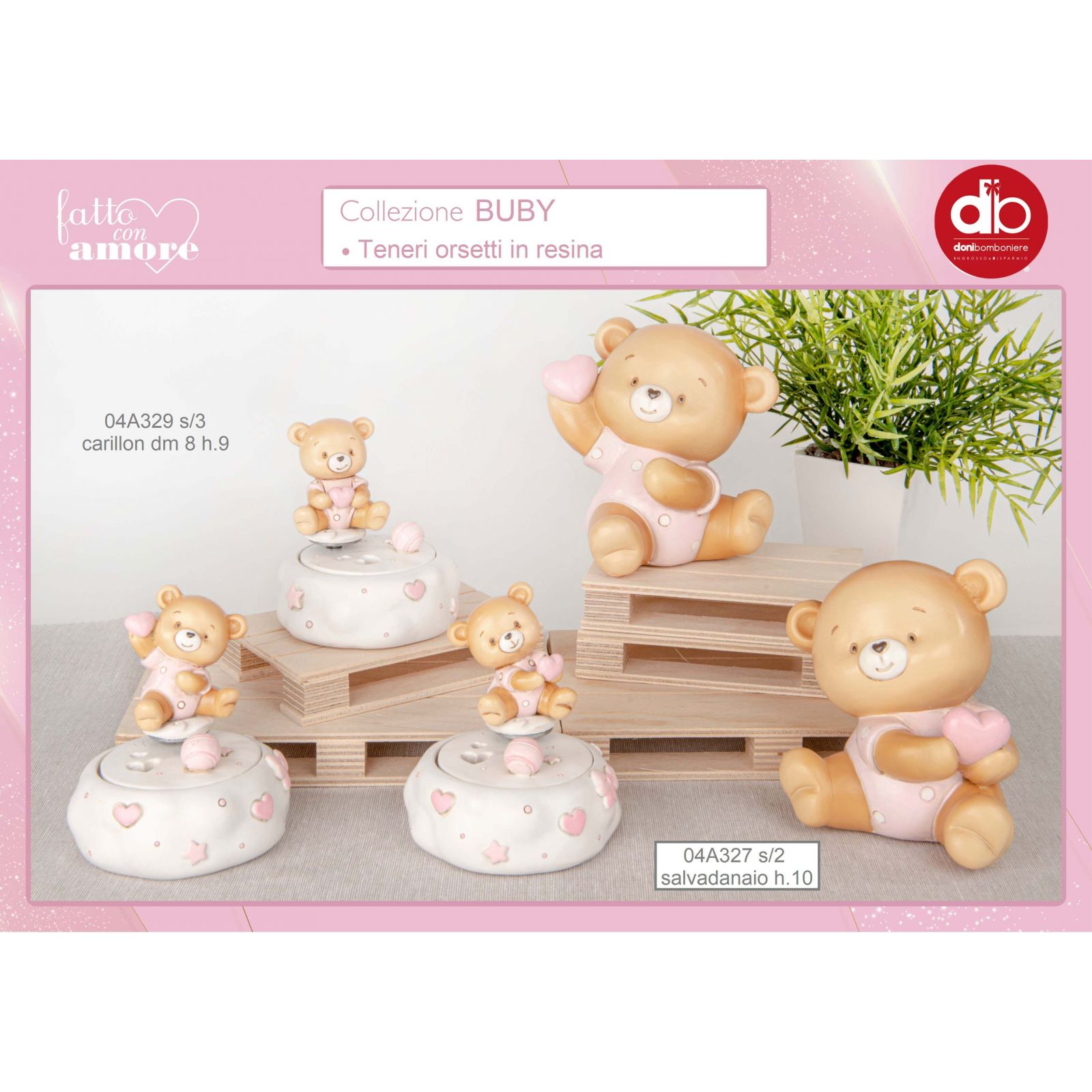 Regala un salvadanaio davvero unico e speciale, dalla linea Buby , con un orsacchiotto che tiene un cuore tra le mani. Una scelta ideale come regalo utile per qualsiasi occasione speciale, come la nascita, il battesimo o il primo compleanno di una bambina. Realizzato in resistente resina dai colori sgargianti, il salvadanaio è di dimensioni contenute - 10 cm circa - e riproduce con grande fedeltà l'adorabile orsacchiotto noto anche come deddy.