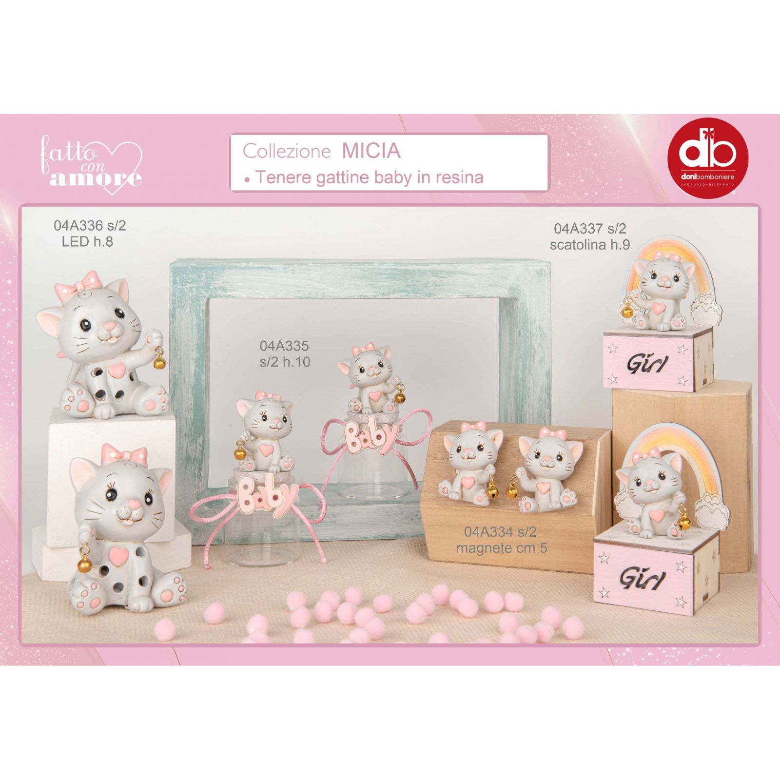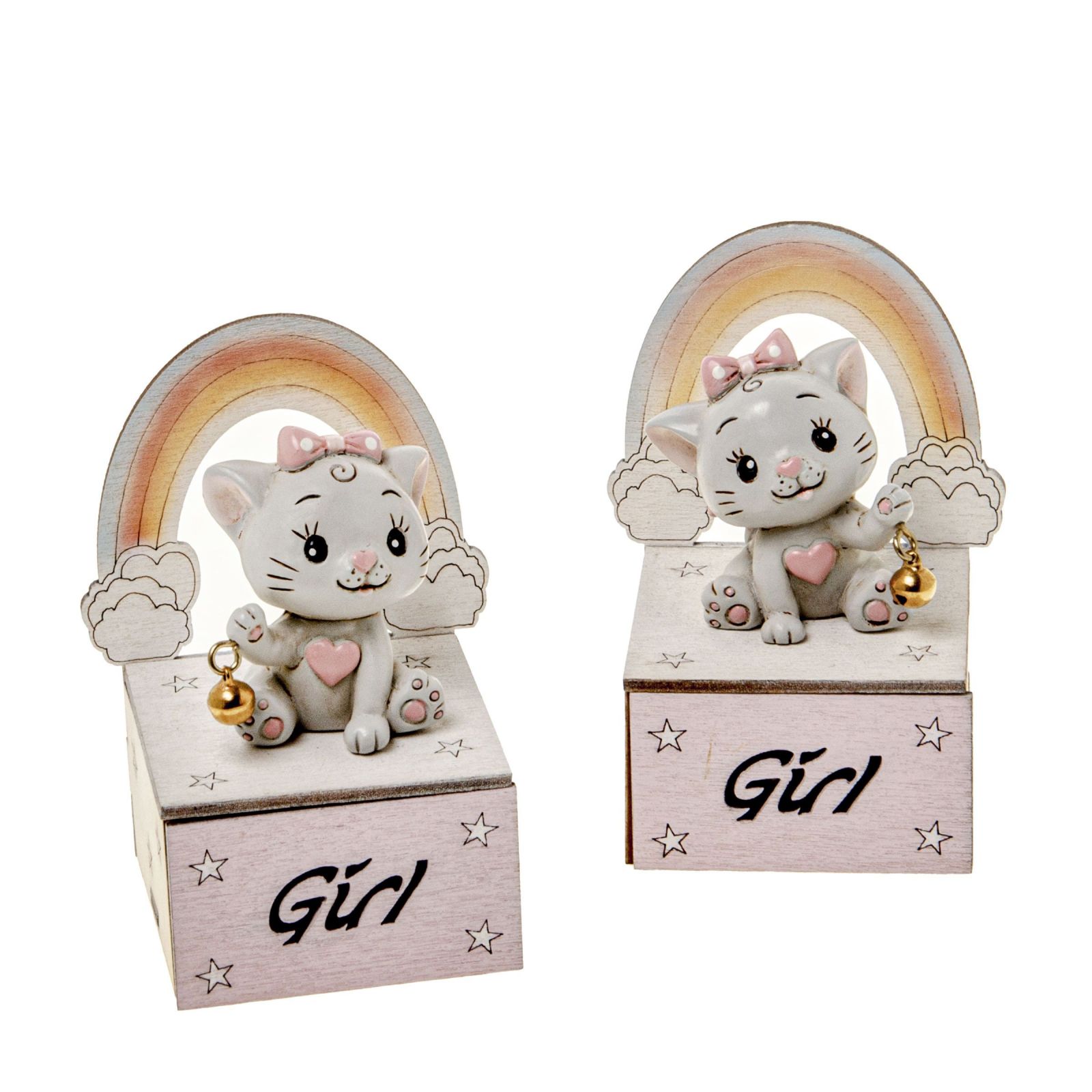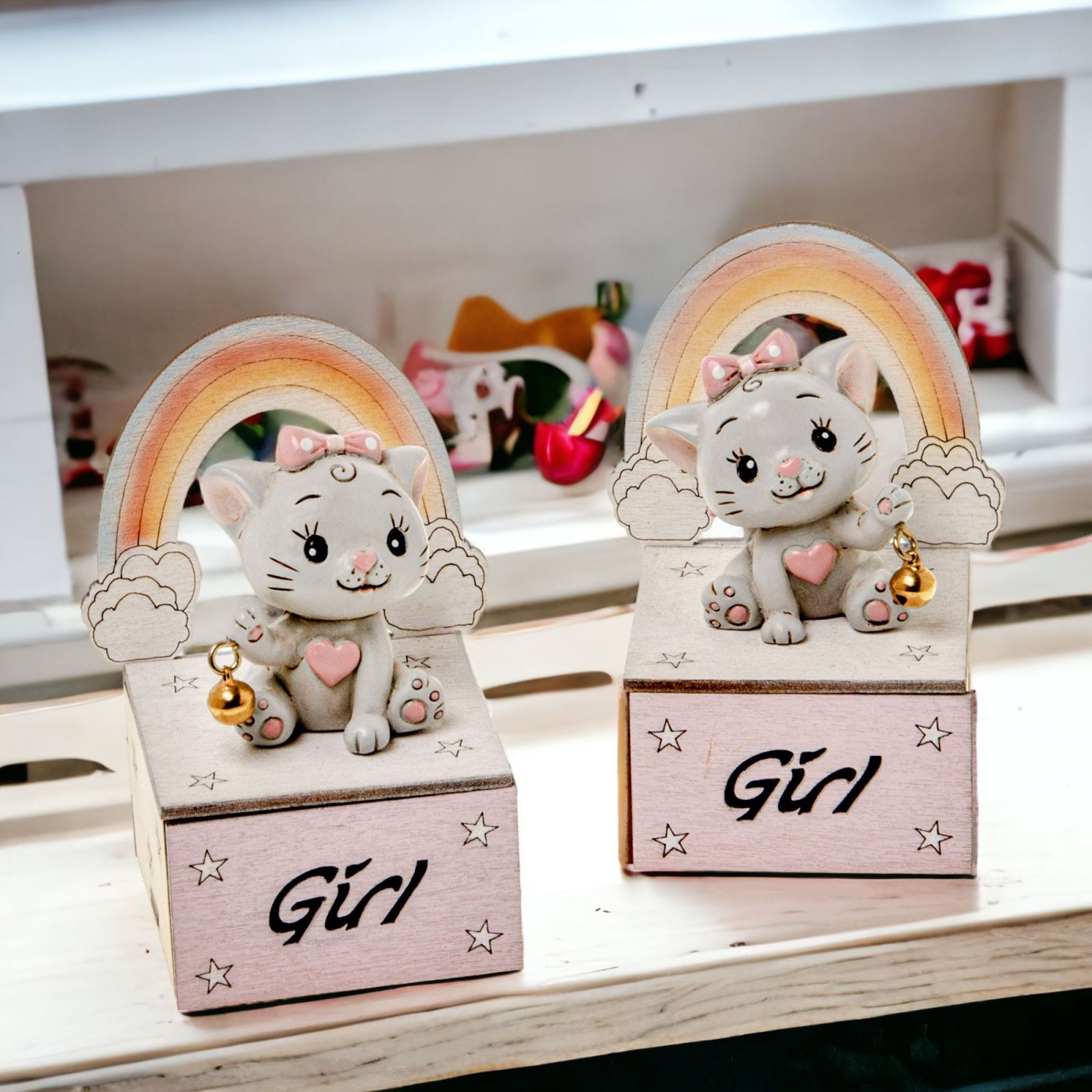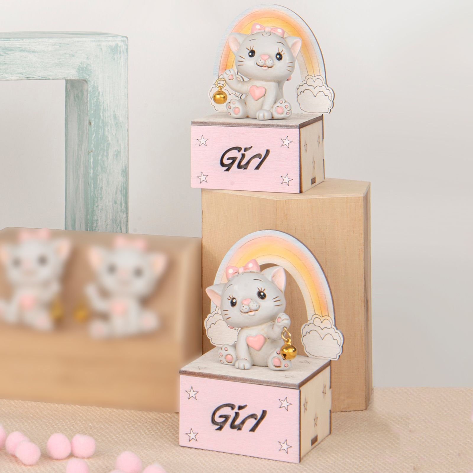Regala la nostra Scatolina Girl porta confetti linea Micia come bomboniera per il battesimo. Il dolce gattino con sognaglino e arcobaleno in legno rosa è adatto sia per la nascita che per il primo compleanno e tutte le feste tema animaletti. Ideale come dono invitati o regalo utile, questa scatolina è perfetta come pensierino invitati alla fine della festa, come segna posto o porta caramelle, cioccolatini o altri dolci. Può anche essere usata come decorazione per i tavoli o come bomboniera per un baby shower con tema arcobaleno o gattino, con una misura di 9 cm circa.