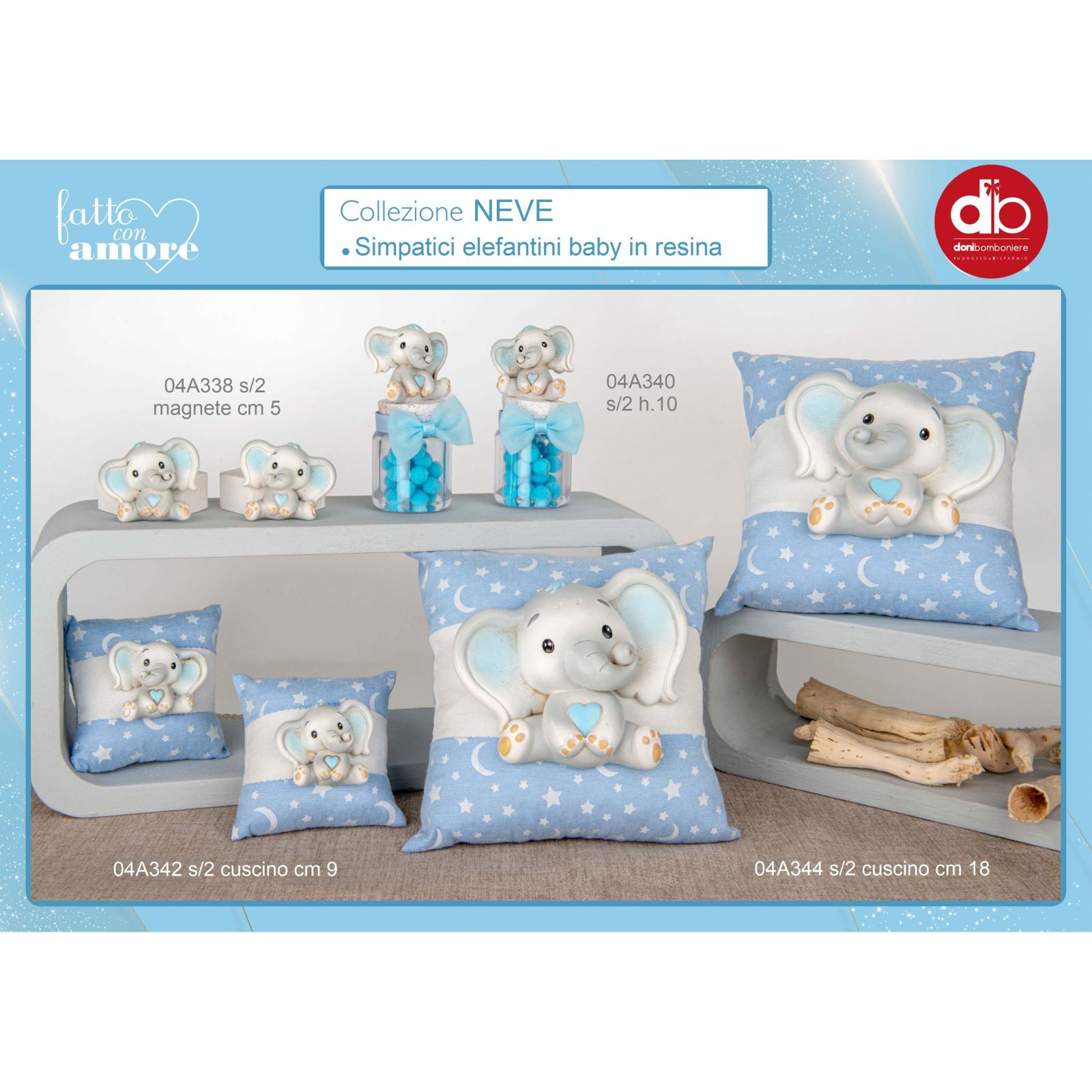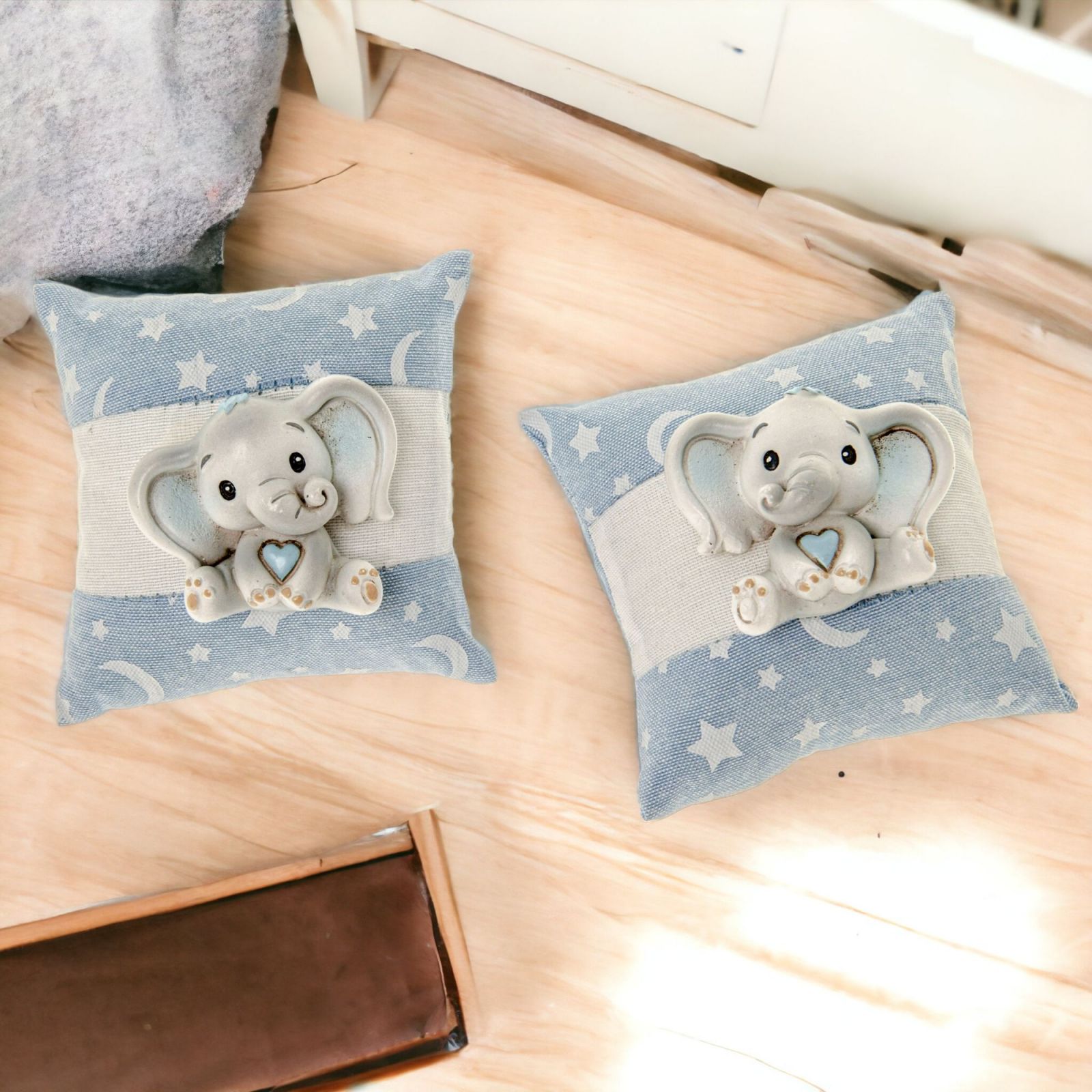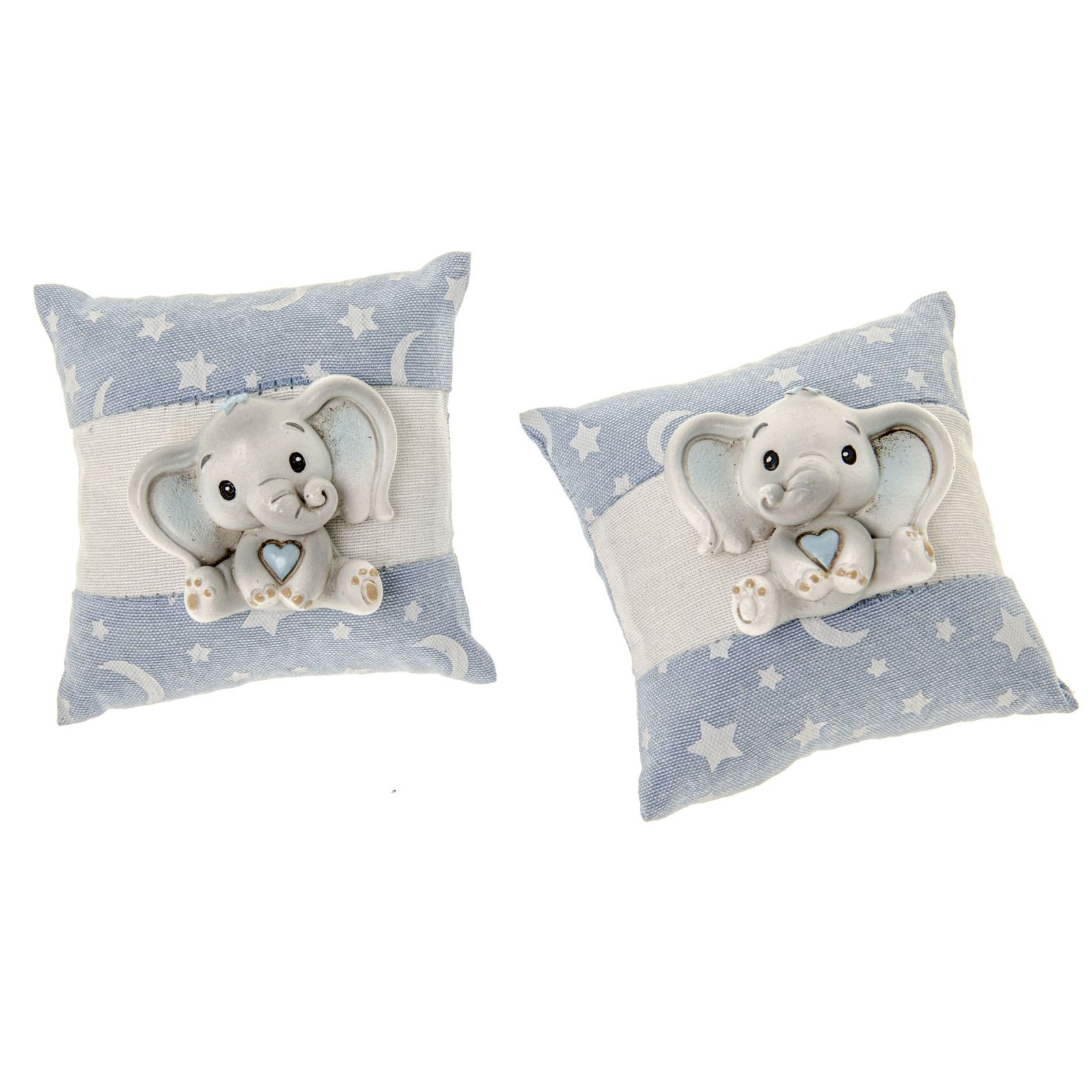 Regala un cuscino unico ed esclusivo, linea Neve, perfetto per ogni occasione speciale. Il cuscino ha un applicazione elefantino seduto con un cuoricino fra le braccia, in uno sfondo a stelline e nuvole. Il tutto in un colore celeste e grigio davvero delicato e raffinato.