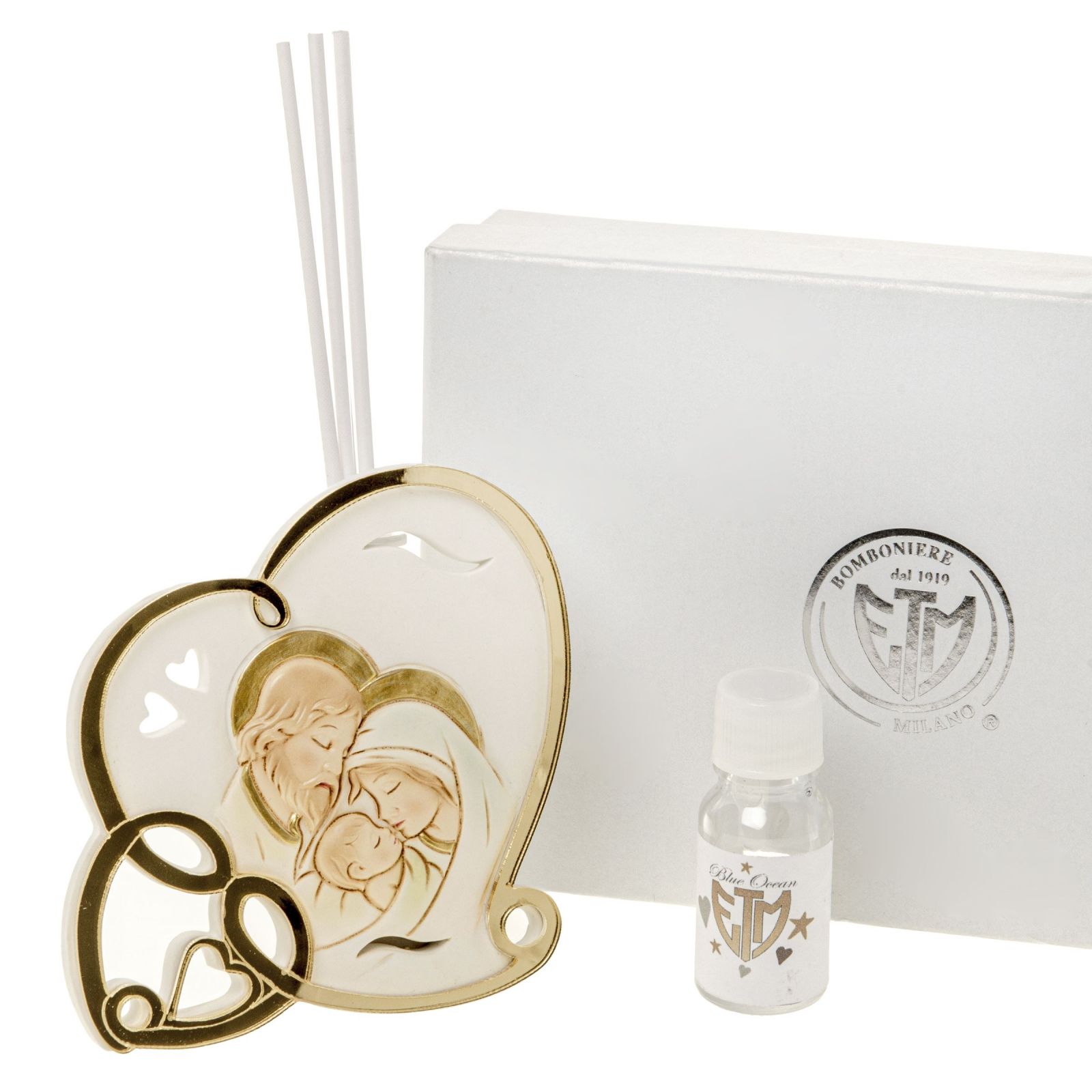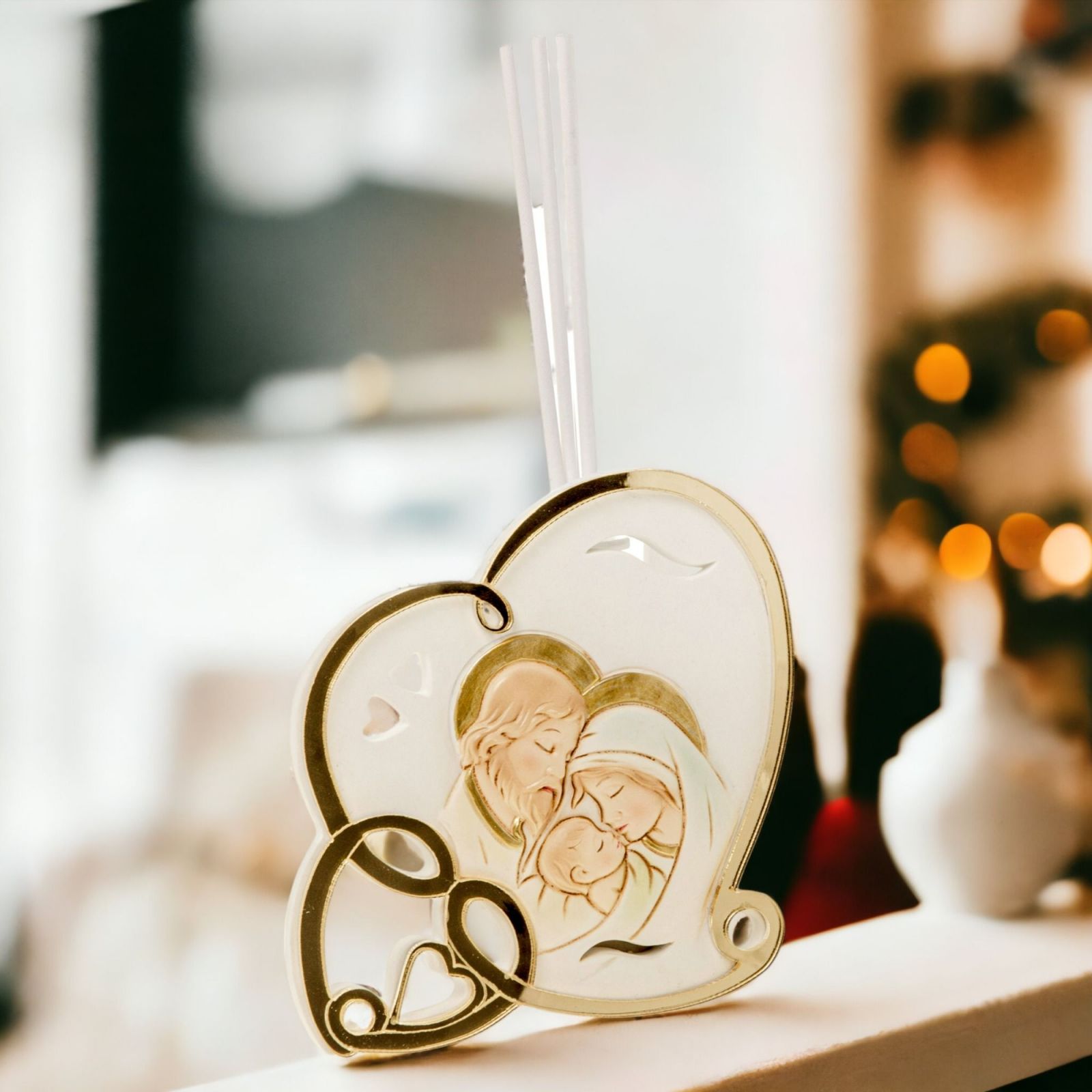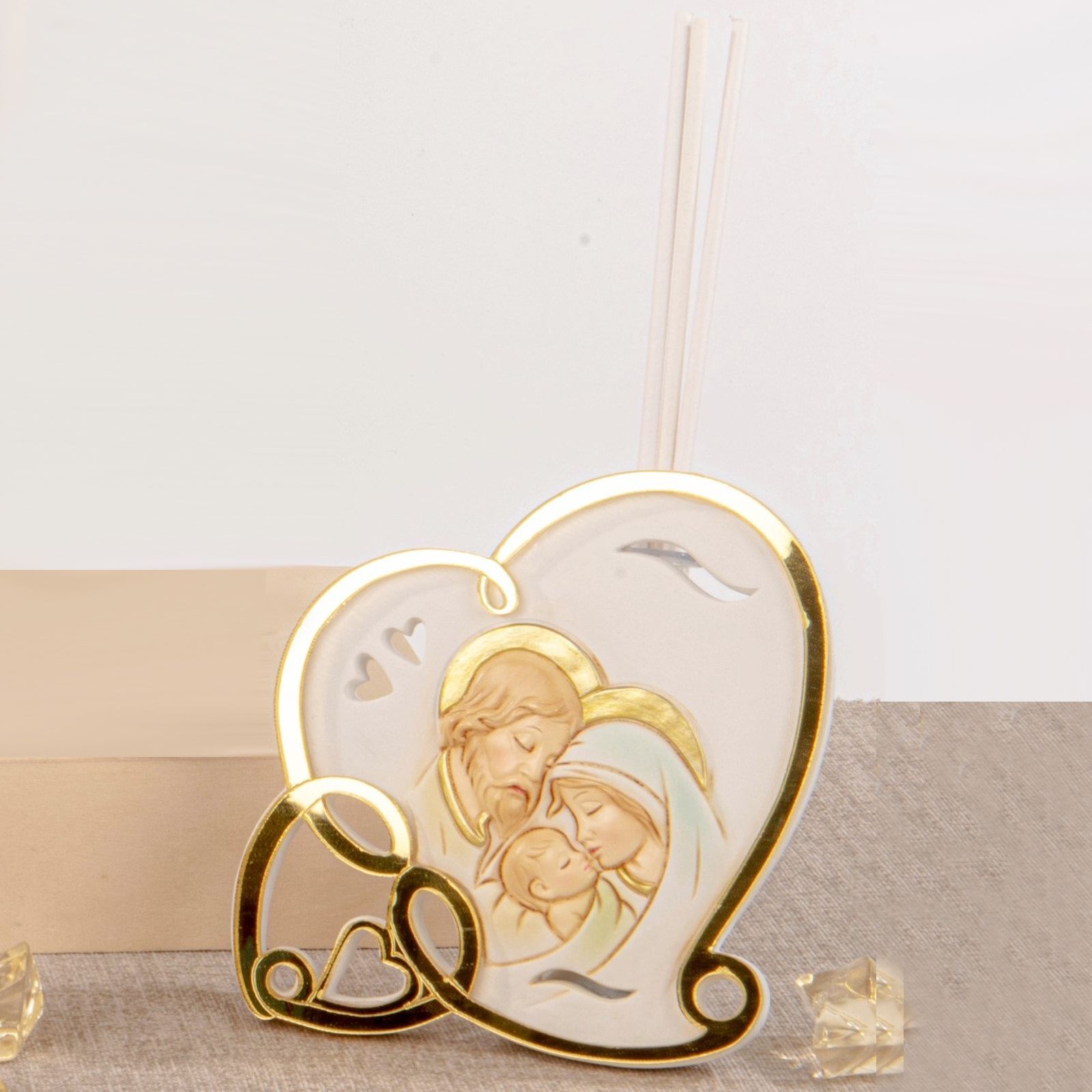 Regala ai tuoi cari un esclusivo diffusore di essenza a forma di cuori intrecciati con una raffigurazione della tenera immagine della Sacra Famiglia. Questo oggetto rappresenta un simbolo di fede, che rimarrà con loro come ricordo di un sacramento importate. La bomboniera sacra può essere scelta ogni volta che si festeggia un Battesimo, una Prima Comunione, una Santa Cresima o un matrimonio.