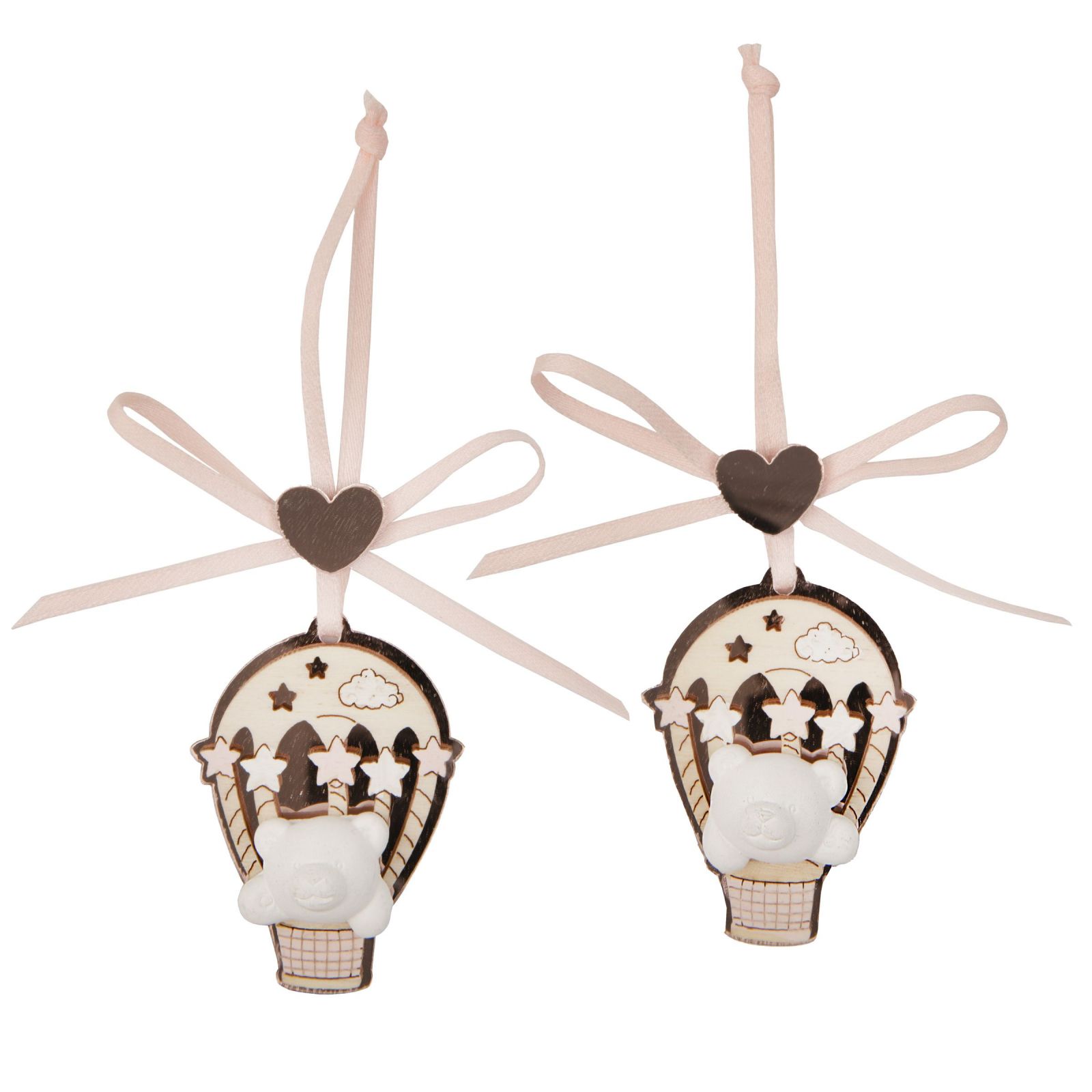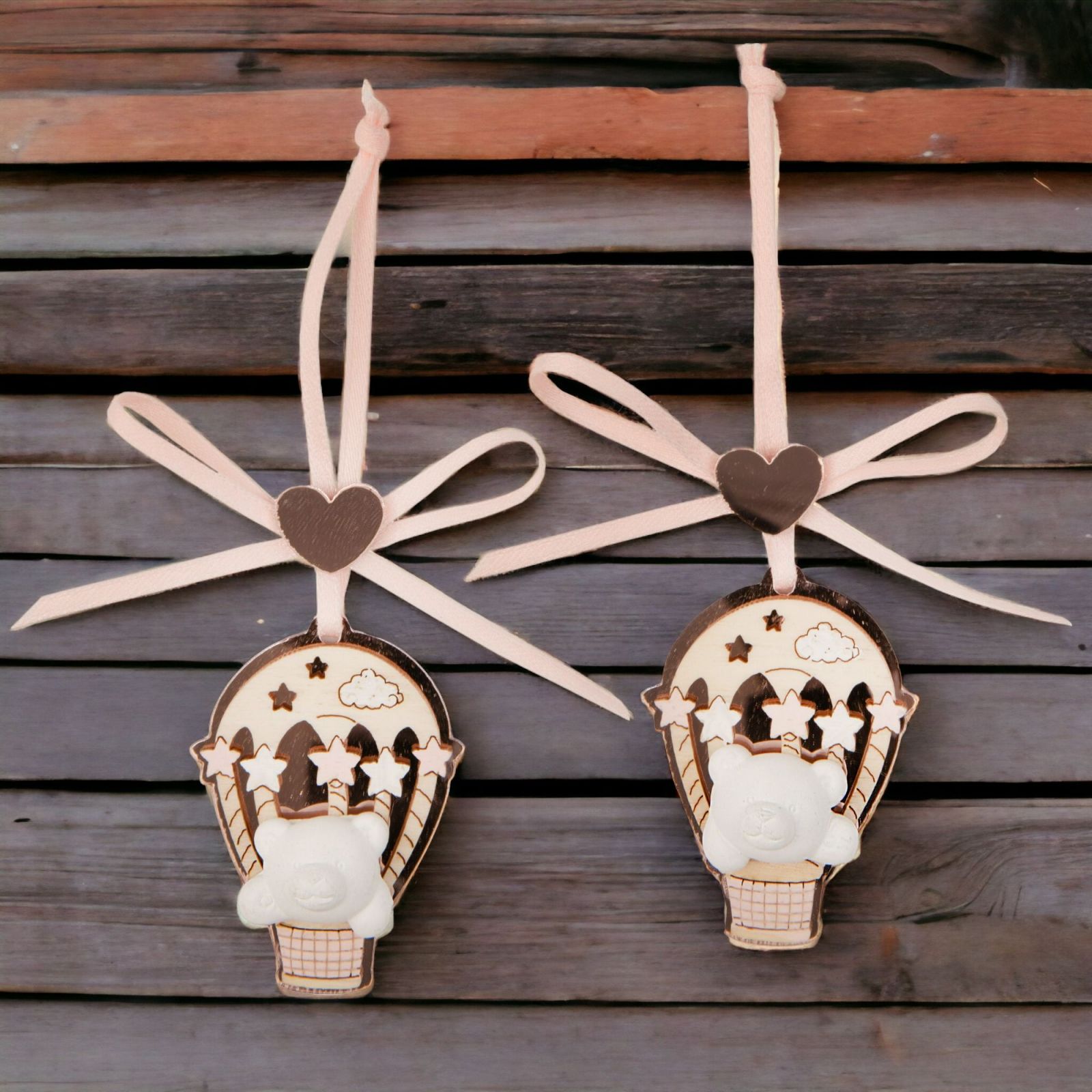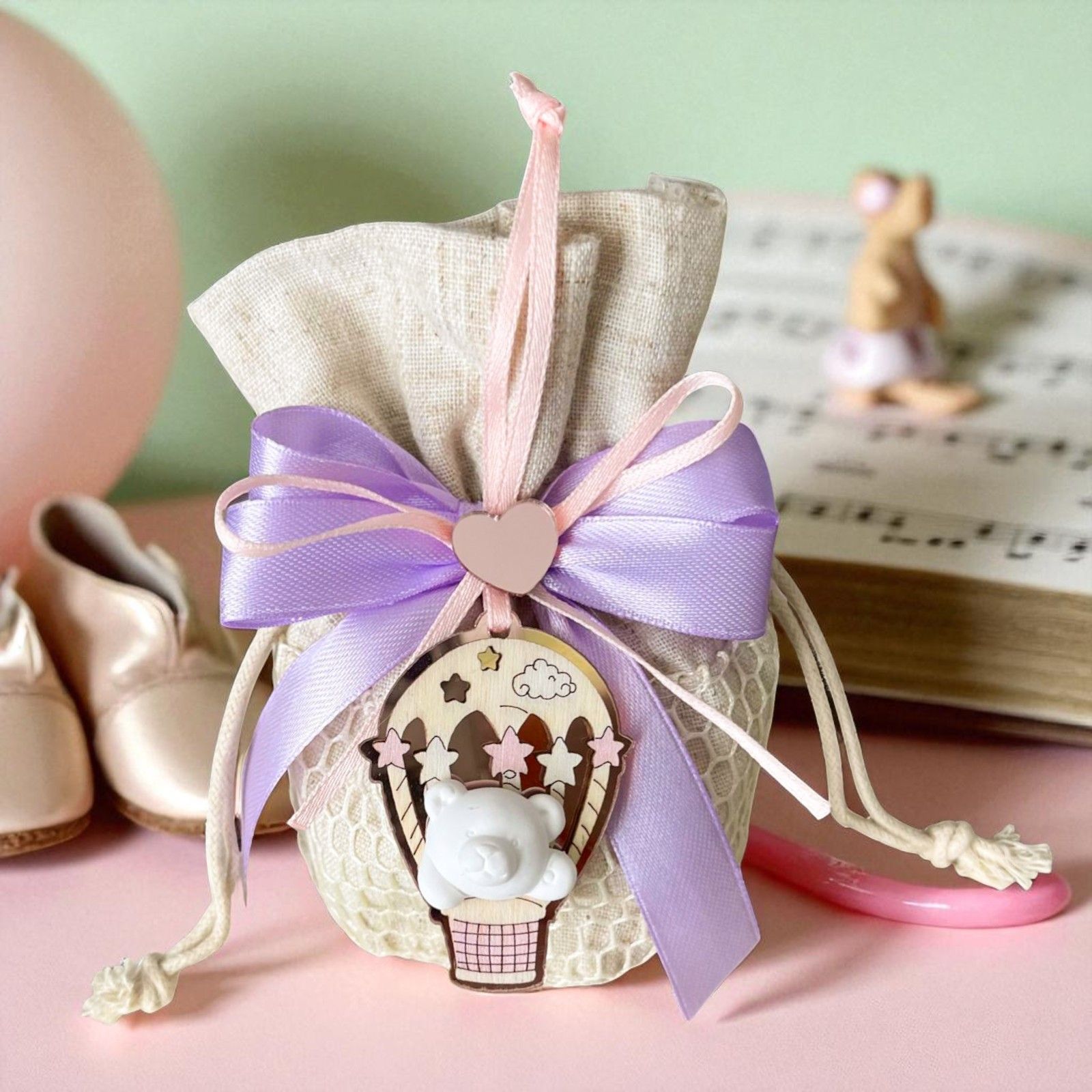 Portate un tocco di dolcezza e magia alla vostra festa con l'appendino a forma di mongolfiera con un simpatico orsetto in gesso assortito in due posizioni, abbellito da un nastrino, fiocco e cuoricino in tinta. Realizzato in gessetto e legno, l'appendino è bianco e rosa e adatto per eventi come nascite, battesimi, gender reveal, baby shower e primo compleanno.