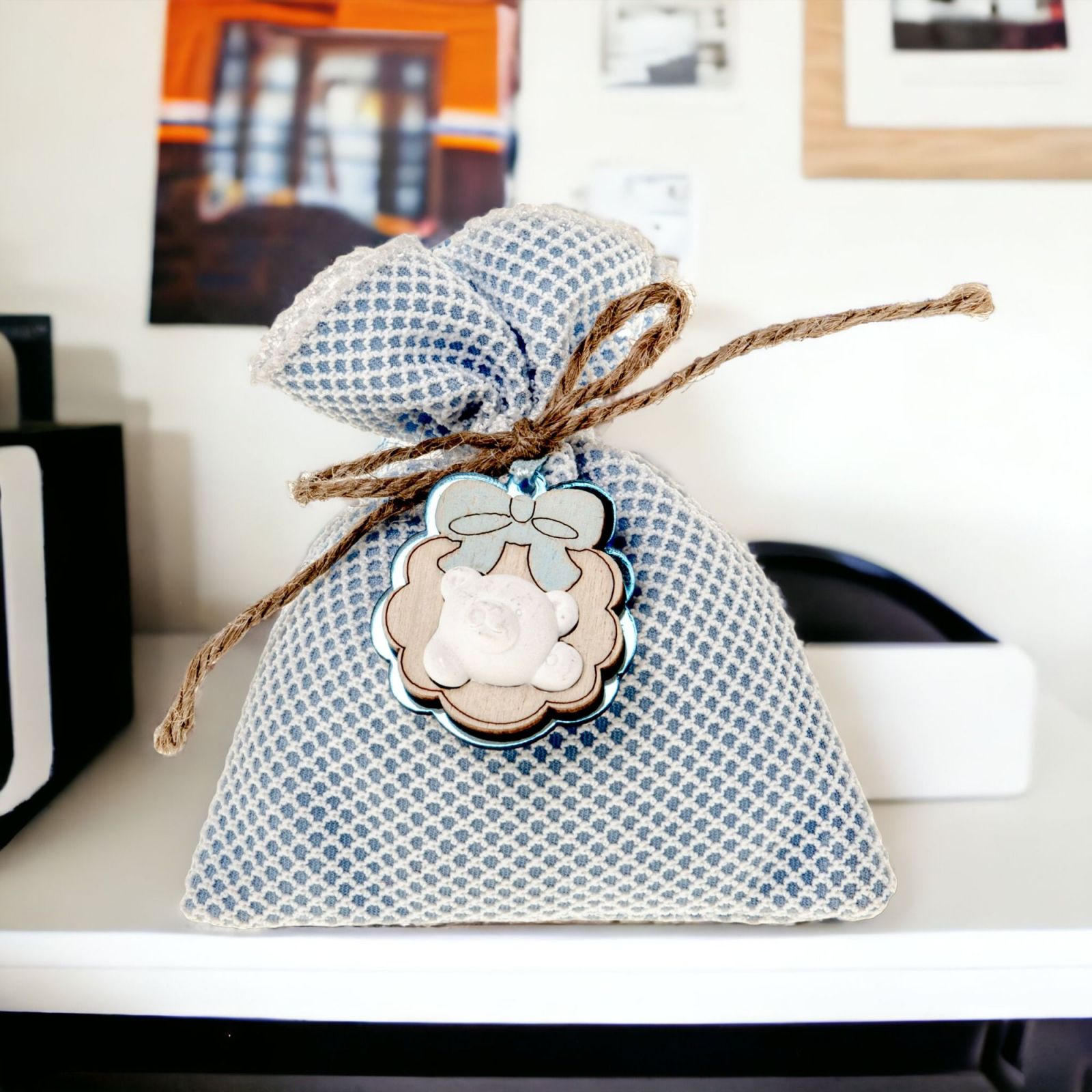Realizzati in tessuto celeste con trama a rete bianca, con applicazione in legno e gesso, questi sacchetti per confetti sono perfetti per realizzare la tua confettata originale per nascita, battesimo, primo compleanno, gender reveal e baby shower.