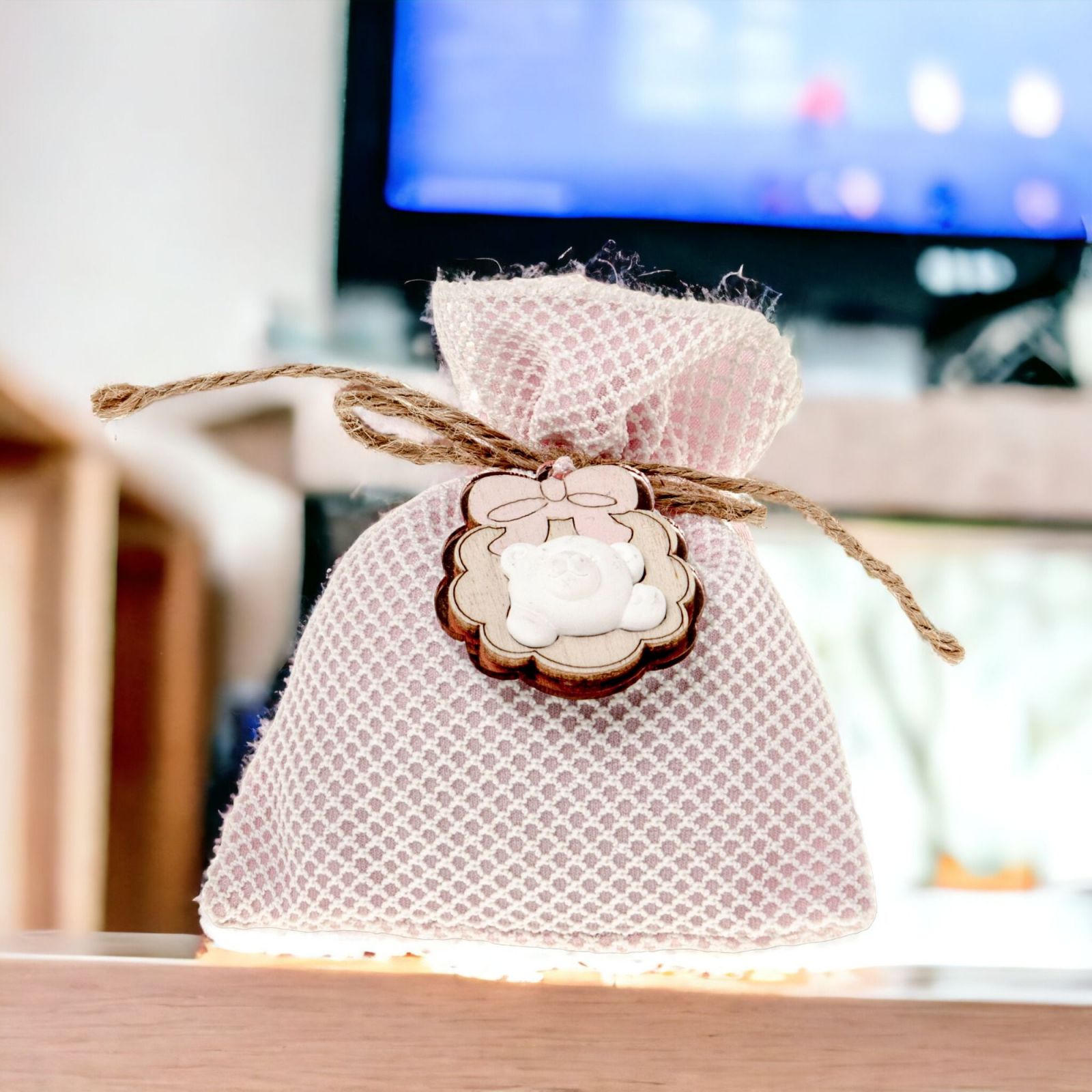 I sacchetti sono realizzati in tessuto con trama bianca con applicazione in legno e gesso, misurano 10x12 circa e presentano un applicazione in tonda con gessetto a forma di orsetto e con fiocco rosa, perfetti per confetti per bimba saranno un'ottima idea regalo per gli invitati.