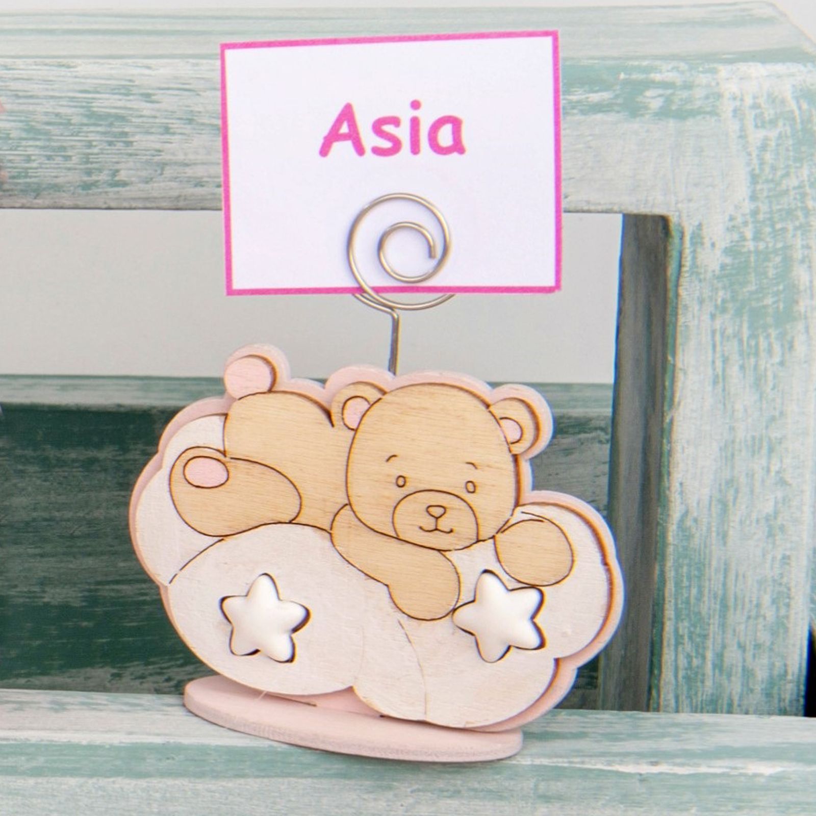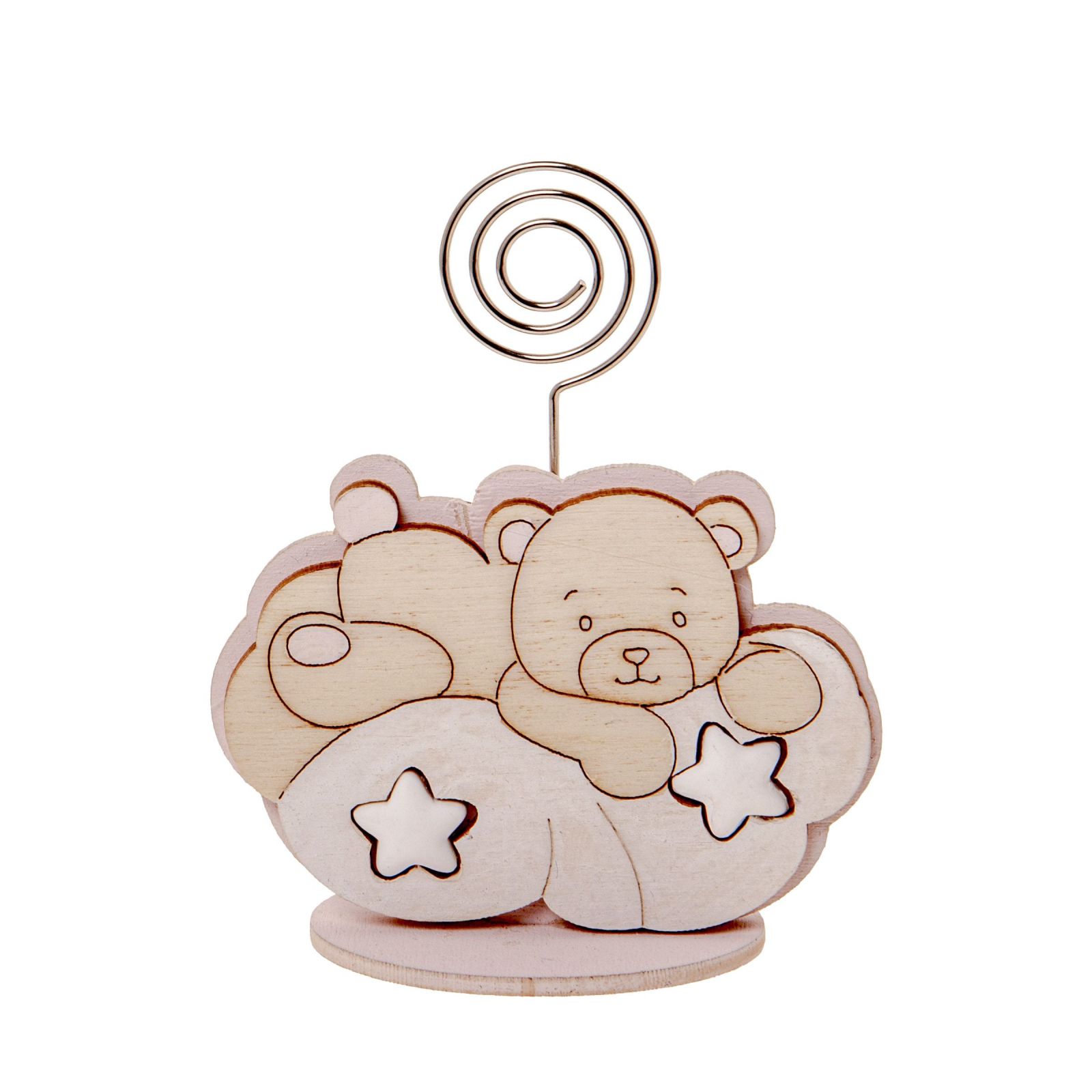 Regala un Memo Clip Portafoto, un oggetto davvero speciale e unico, realizzato in metallo e doppio strato di legno con sfondo rosa, ideale per eventi femminuccia. Sulla parte superiore allo sfondo raffigurazione tenero orsetto inciso steso su nuvolette con stelle, renderà questo prodotto uno dei regali più graditi. Misura circa 8 cm e si adatta perfettamente per occasioni come la nascita, il battesimo o il primo compleanno. Regalare un Memo Clip Portafoto è un modo per celebrare un evento speciale e far sentire gli invitati parte di un momento importante, rendendo unico e indimenticabile quel giorno. Sarà un ricordo per sempre che gli invitati porteranno con sé, un piccolo ma prezioso segno di apprezzamento per la partecipazione.