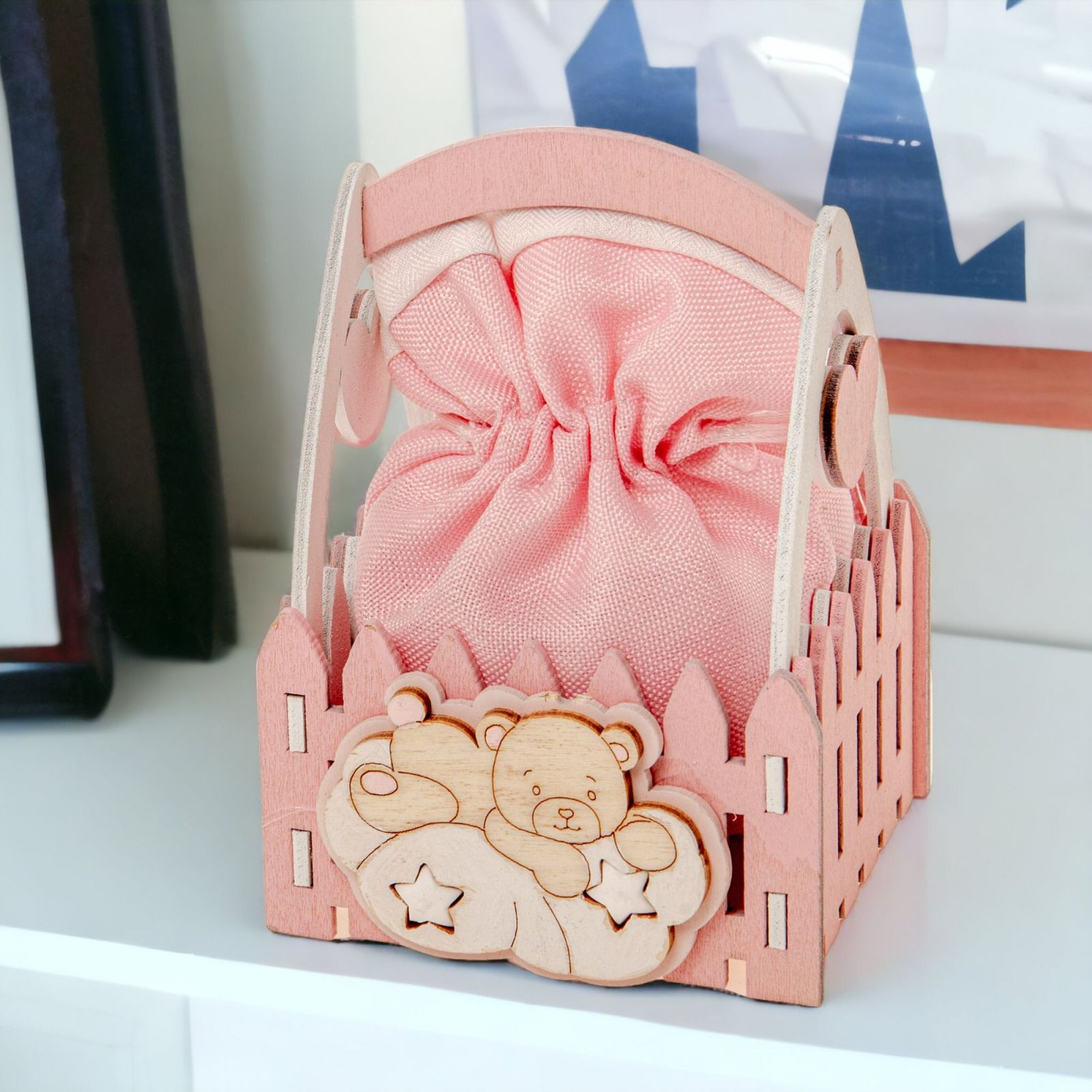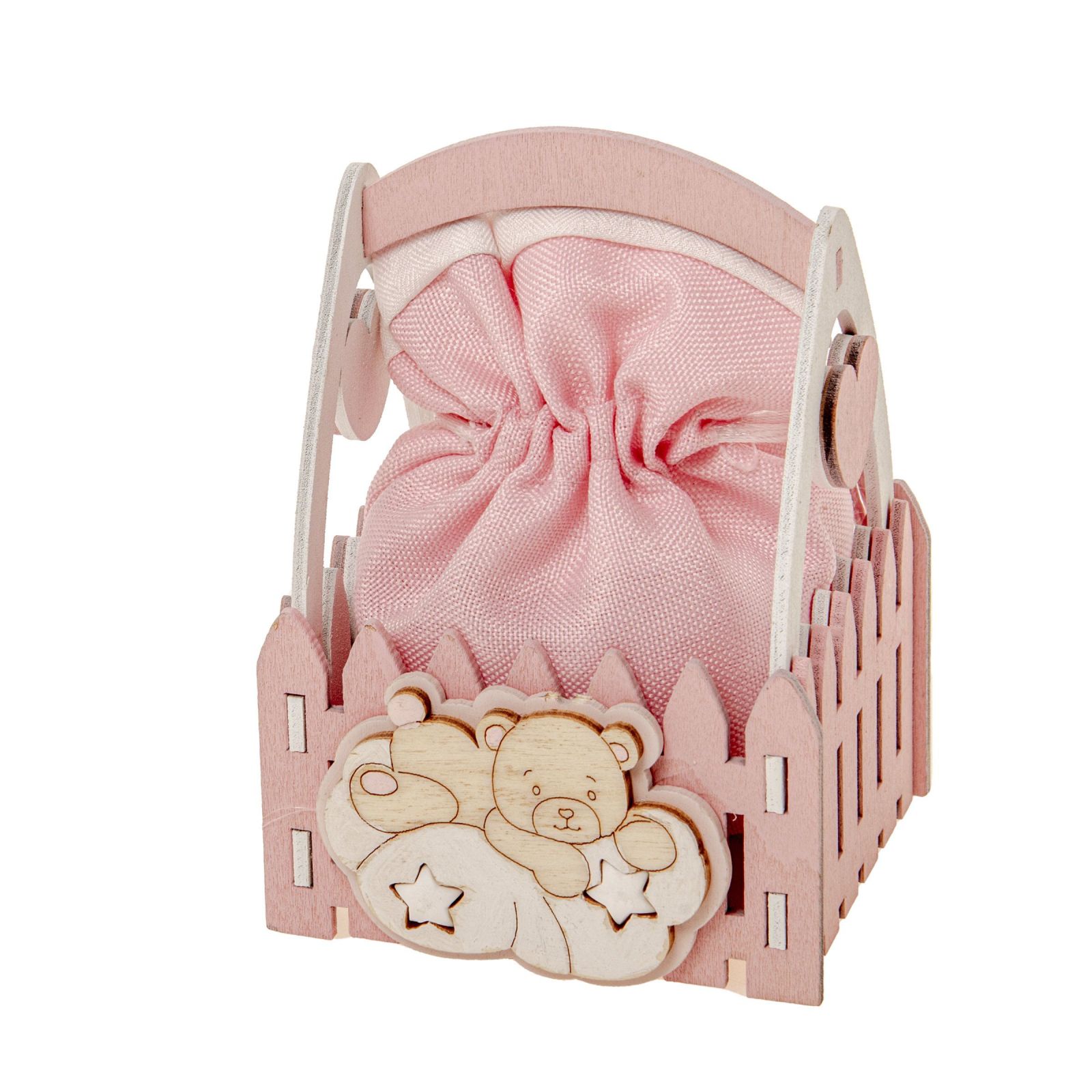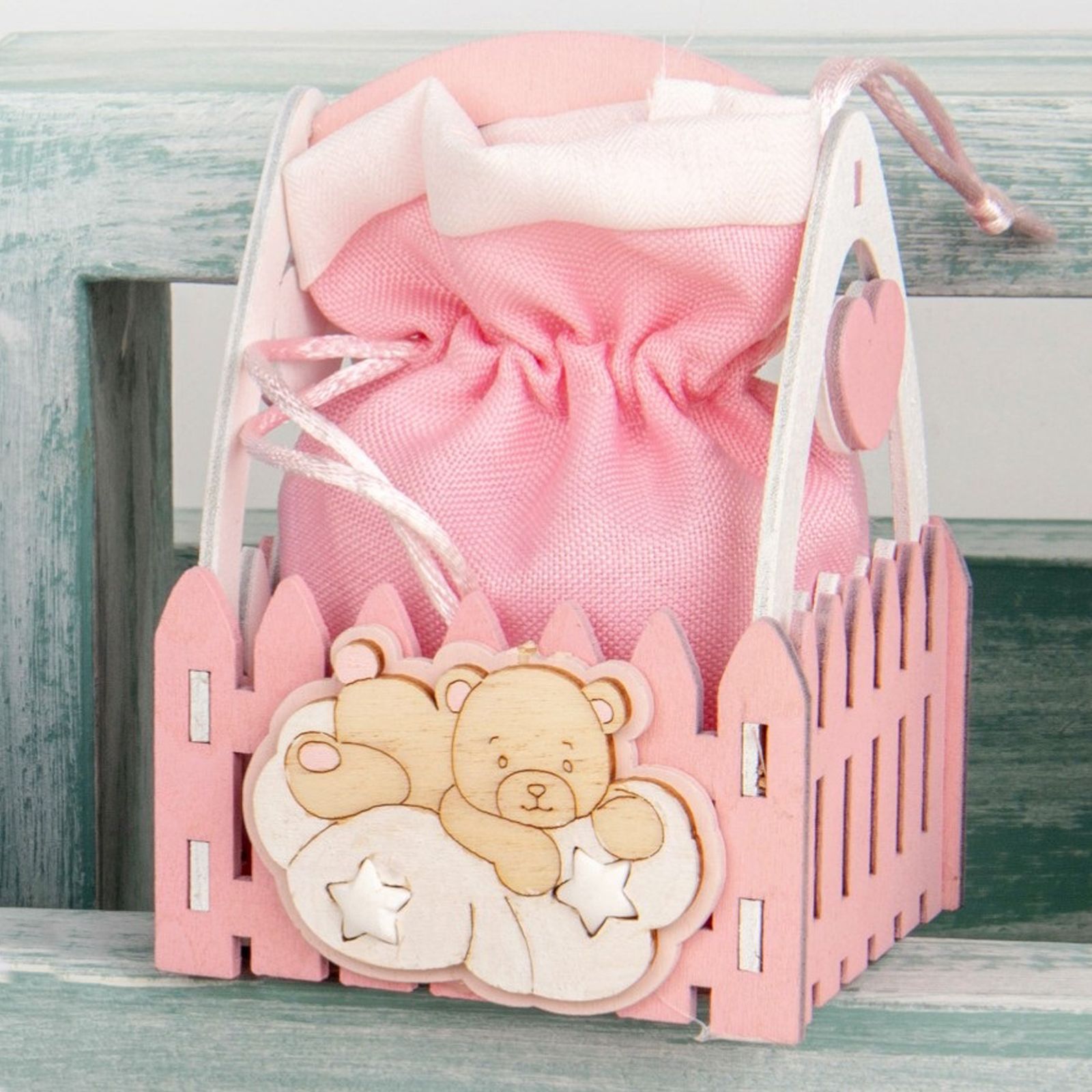 Regala questa bellissima bomboniera dalla linea two stars cesto per la bambina che sta per nascere! Un originale pensiero per i tuoi invitati: una scatolina rosa in legno con effetto recinto e applicazione in legno a forma di tenero orsetto con nuvola e cuoricini laterali con sacchetto porta confetti. Un gadget di fine festa che puoi usare per l'allestimento del tavolo. Una bomboniera per bambina perfetta per tutti gli eventi come nascita, battesimo o un primo compleanno.