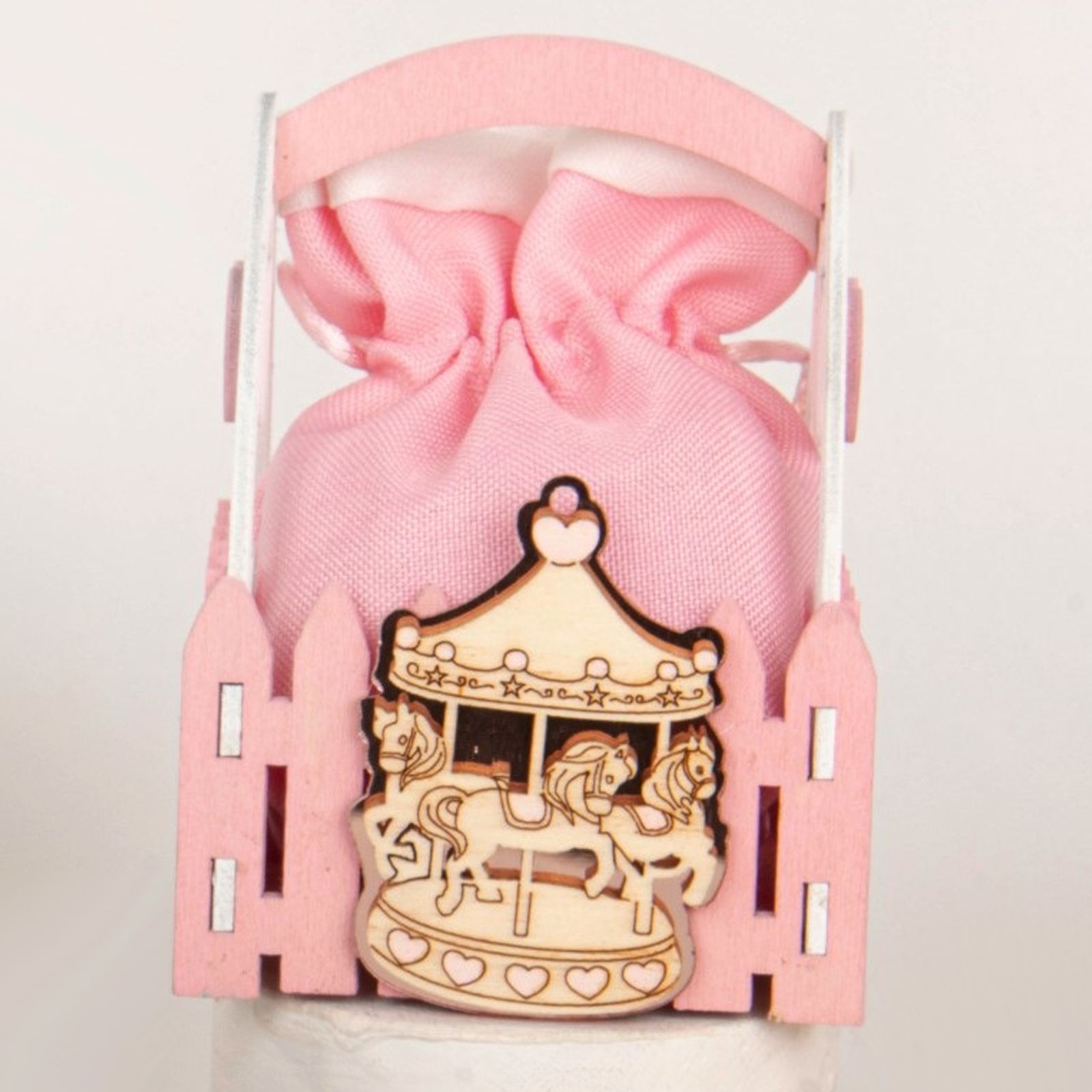 Regala un momento di allegria e gioia con questa bomboniera per bambina della linea carosello cesto! La scatolina in legno, con effetto recinto rosa e cuoricini laterali , è impreziosita da una giostrina color legno con sfondo in plex specchiato rosa. Un'idea regalo davvero originale per ricordare gli eventi come nascita, battesimo e compleanno (1 anno). Un pensiero che farà felici anche gli invitati, come segnaposto e regalo per la festa. Una bomboniera che, grazie al sacchetto porta confetti, fungerà anche da porta caramelle ideale per l’allestimento tavolo torta. Un gadget di fine festa con dimensioni di h 11 cm che renderà indimenticabile il tuo evento a tema Carosello!