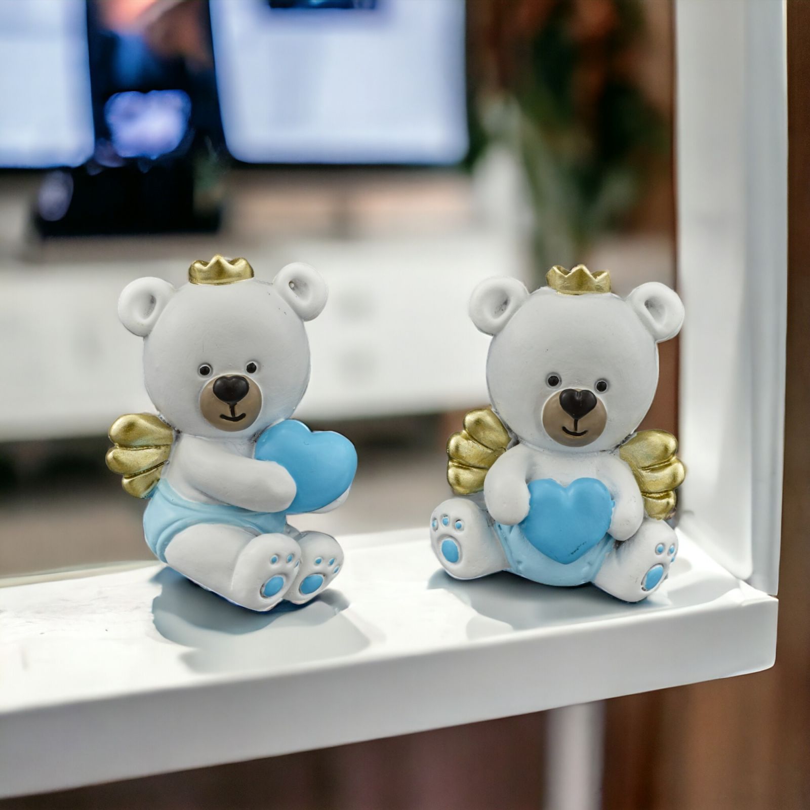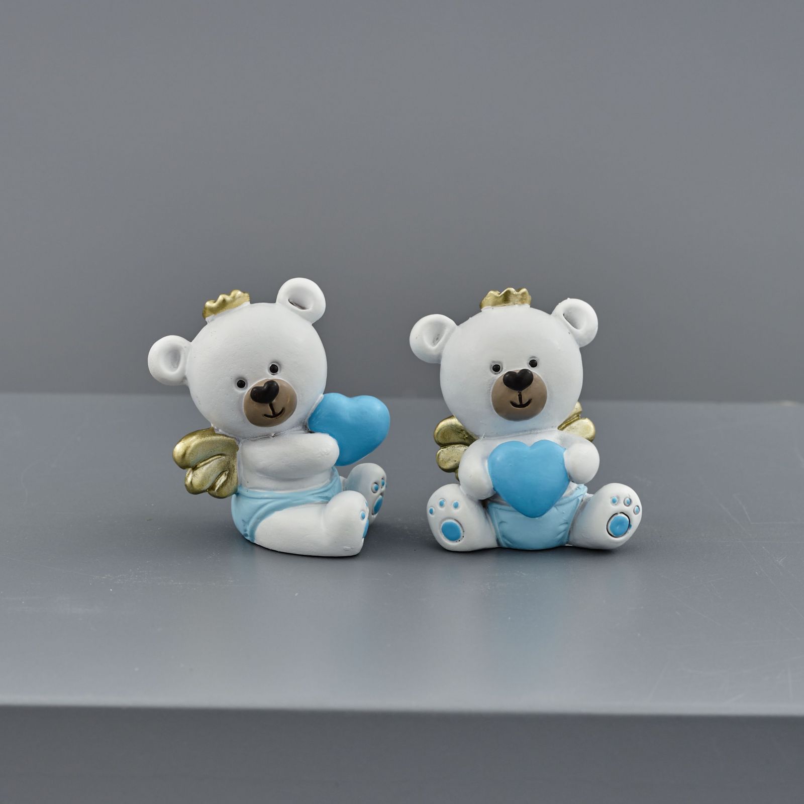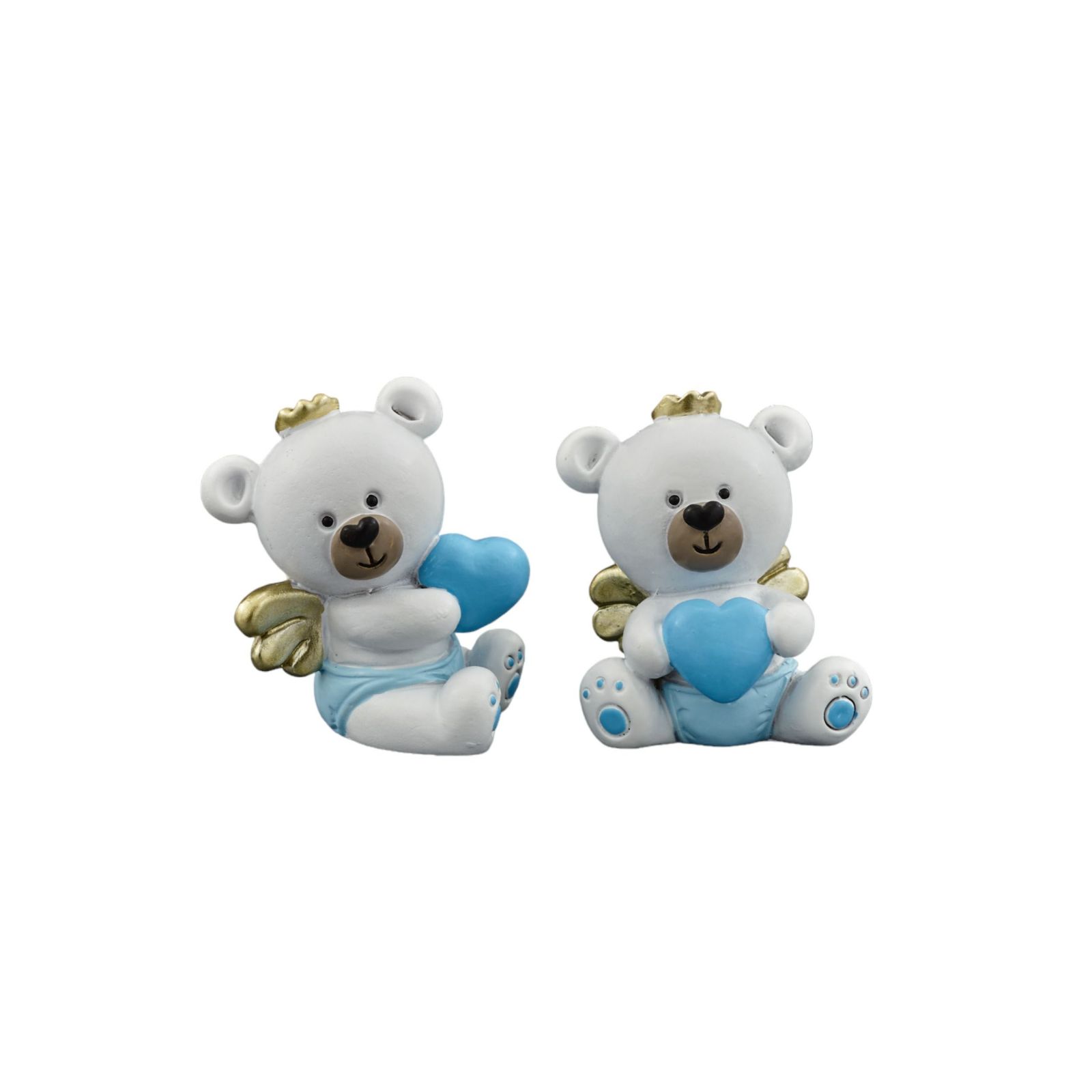 Unisci l'amore per un bambino e l'immagine di un angelo con una dolce statuina di un orsacchiotto con una coroncina e ali dorate e un cuoricino azzurro tra le mani. Una bomboniera perfetta per celebrare con gioia la nascita, il battesimo o il primo compleanno di un bimbo. La statuina è realizzata in pregiata resina bianca con dettagli e cuoricino azzurro. Le dimensioni sono di 3,5x1,5x5 cm circa e si presenta in due diverse posizioni assortite.